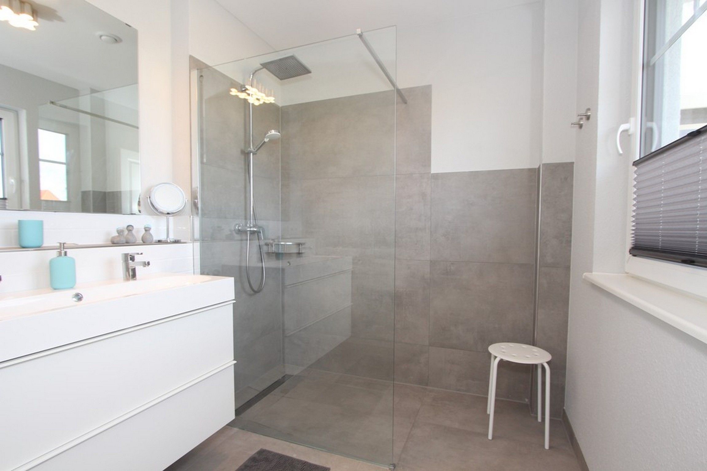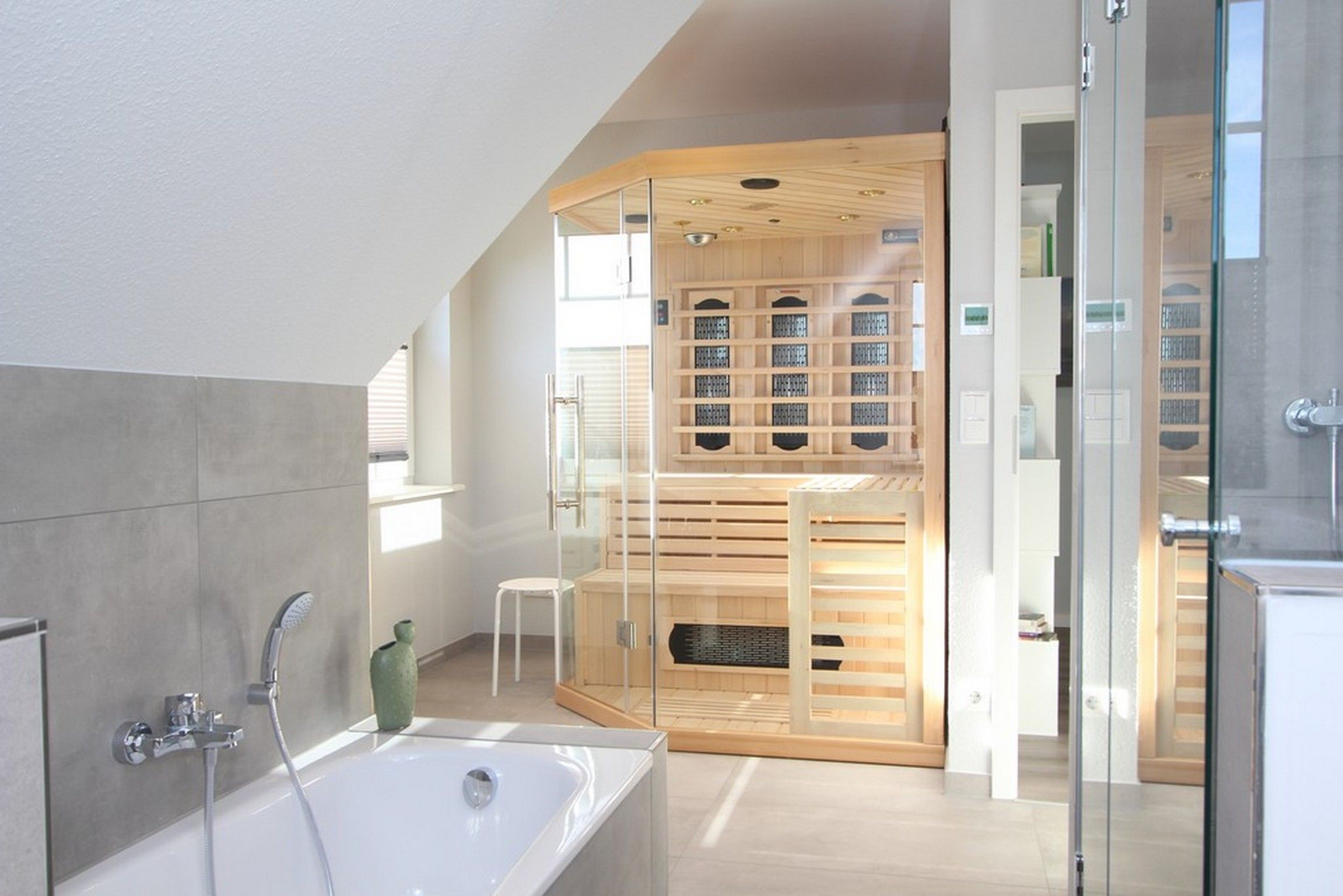 Ferner finden Sie auf dieser Etage das große Vollbad, wieder mit bodengleicher Dusche und Doppelwaschtisch sowie mit integrierter Infrarotwärmekabine.