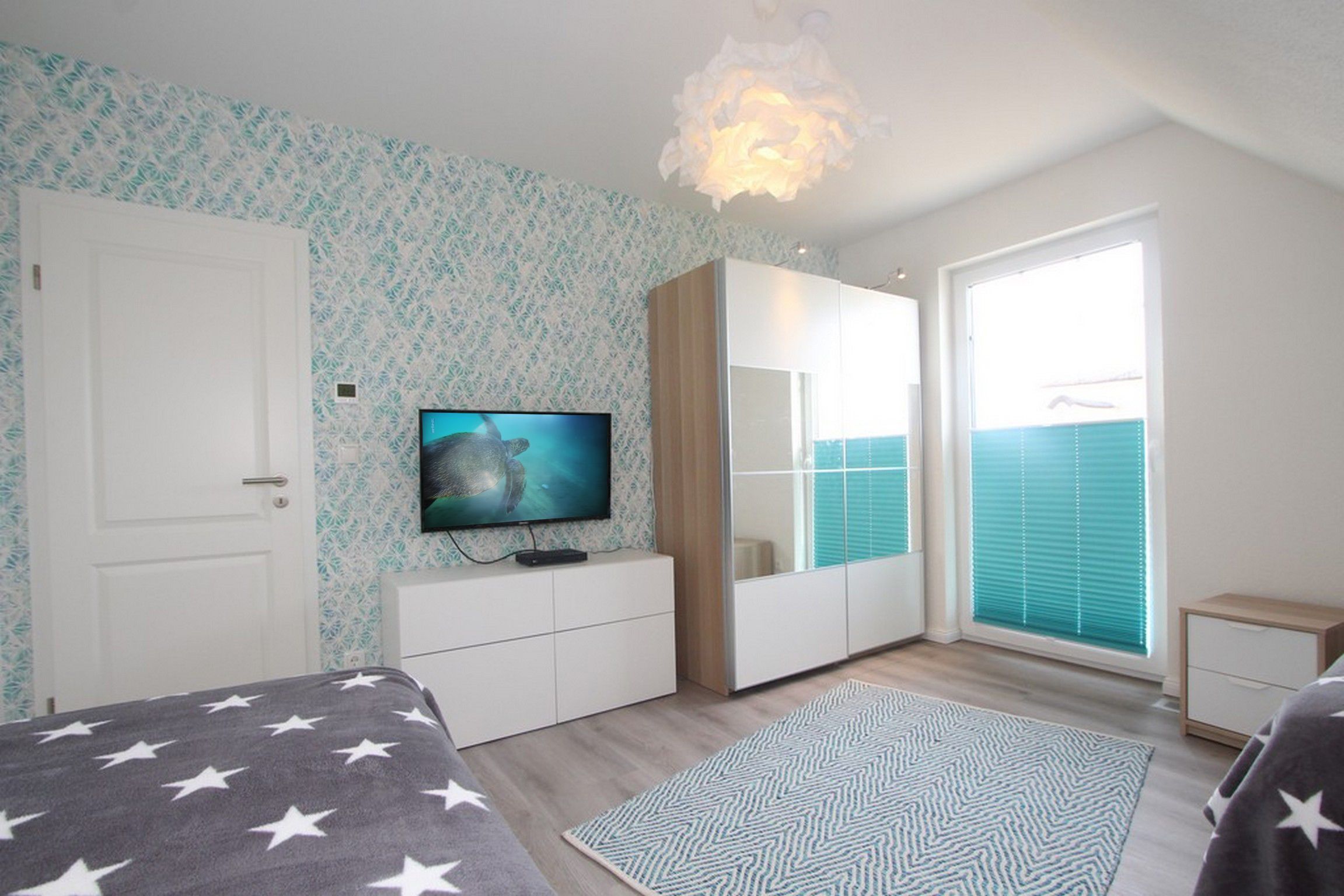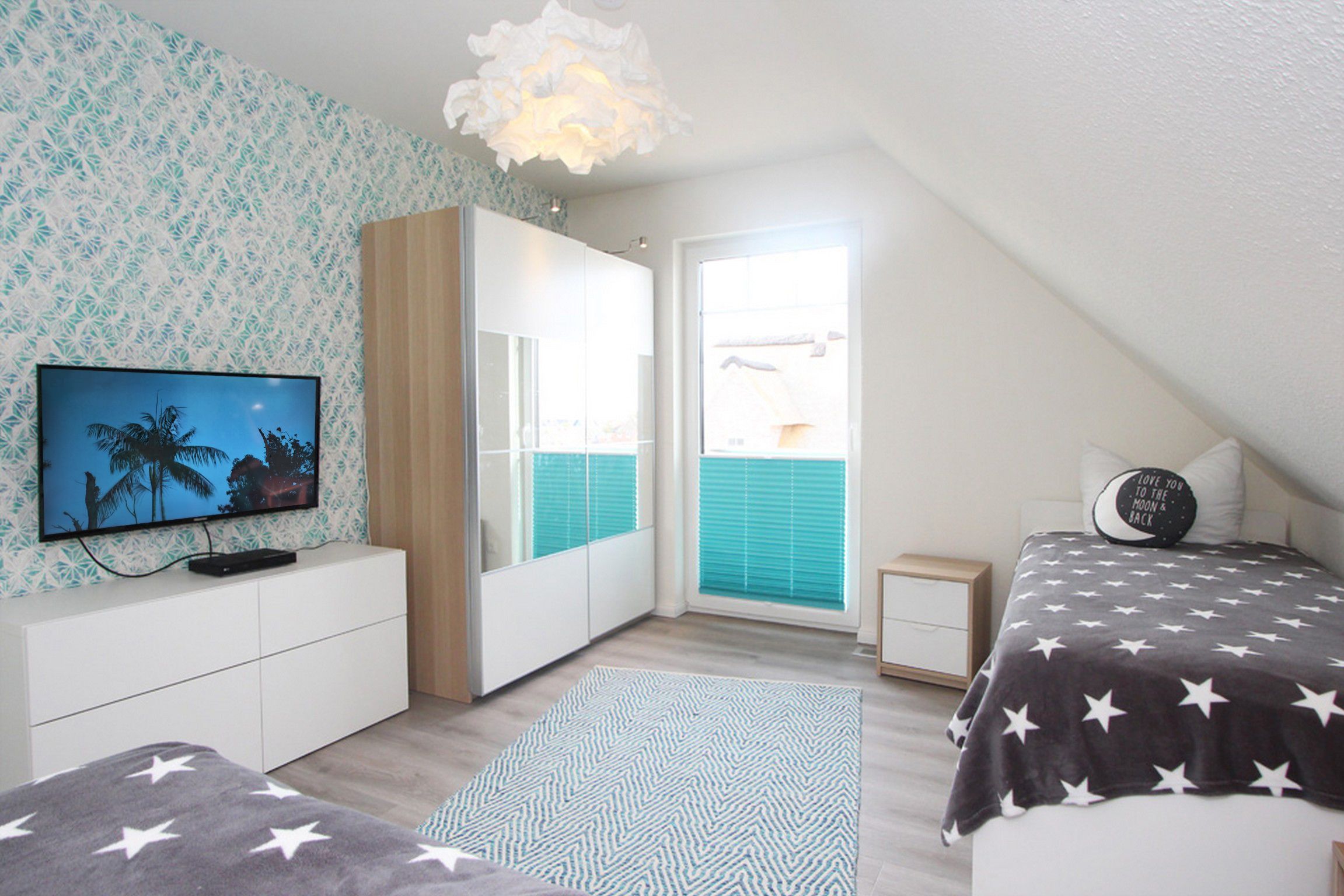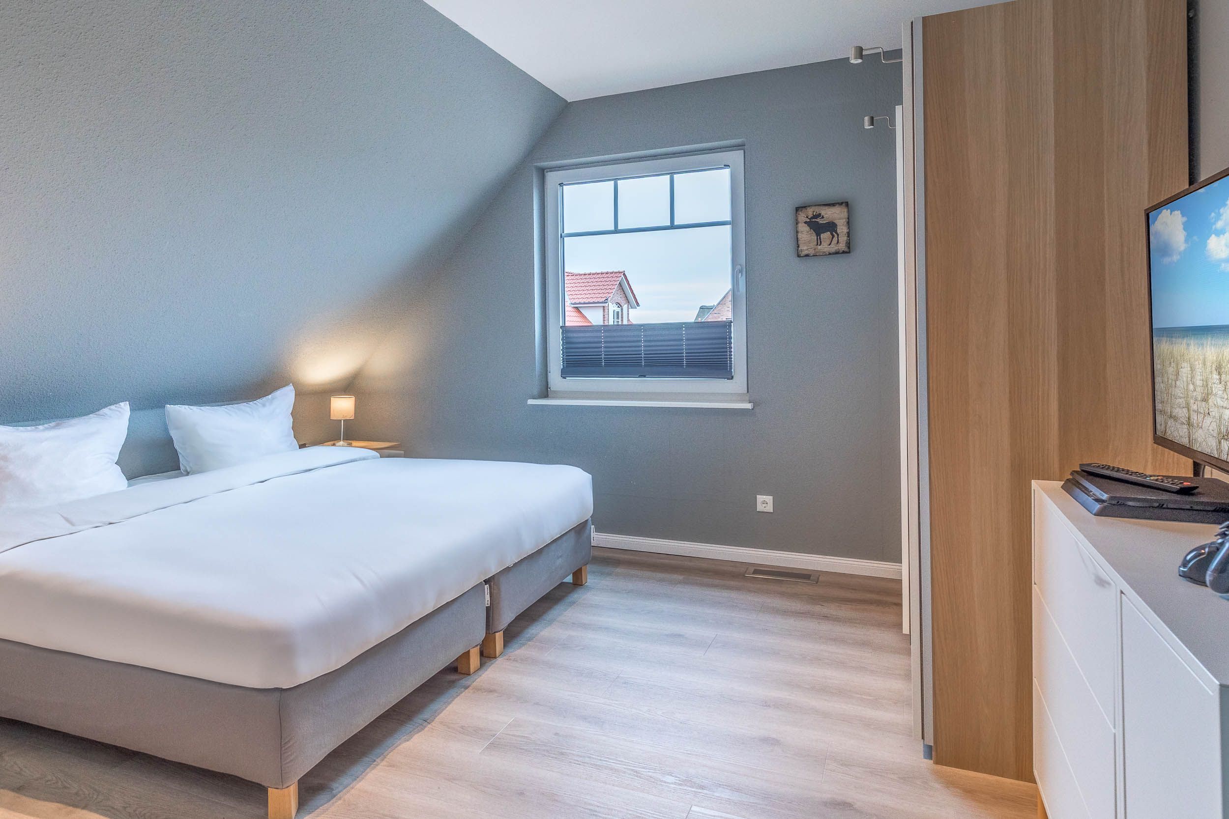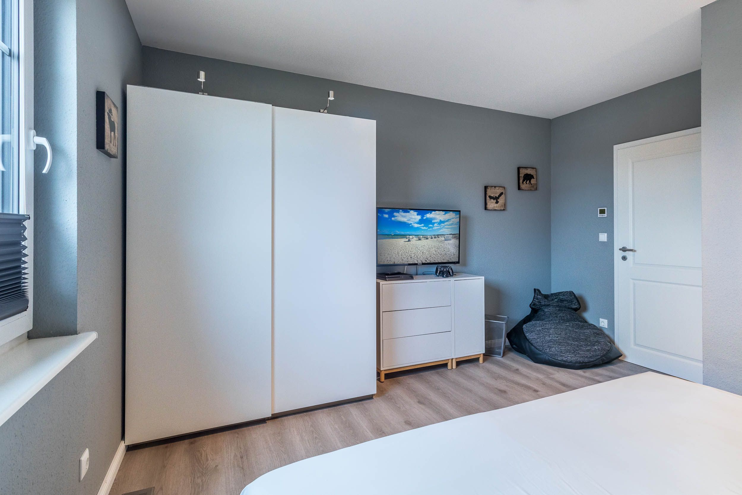 Das dritte Schlafzimmer ist mit zwei Betten (90/200) eingerichtet und bietet ebenfalls einen schönen Blick auf die Ostsee. Jedes Schlafzimmer verfügt über ein TV & Blu-Ray-Player. Die Betten sind für Sie, liebe Gäste, bei Anreise schon bezogen!