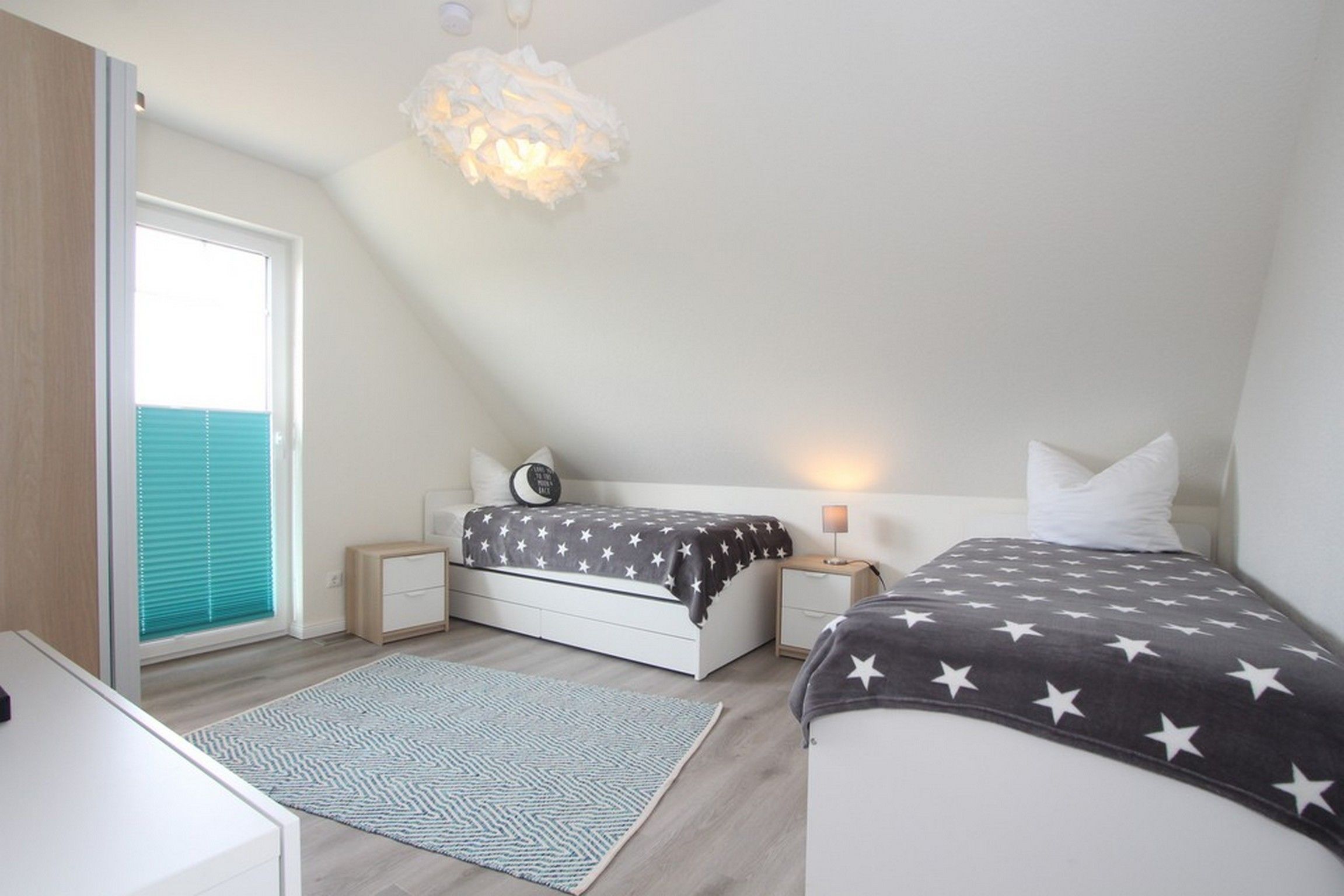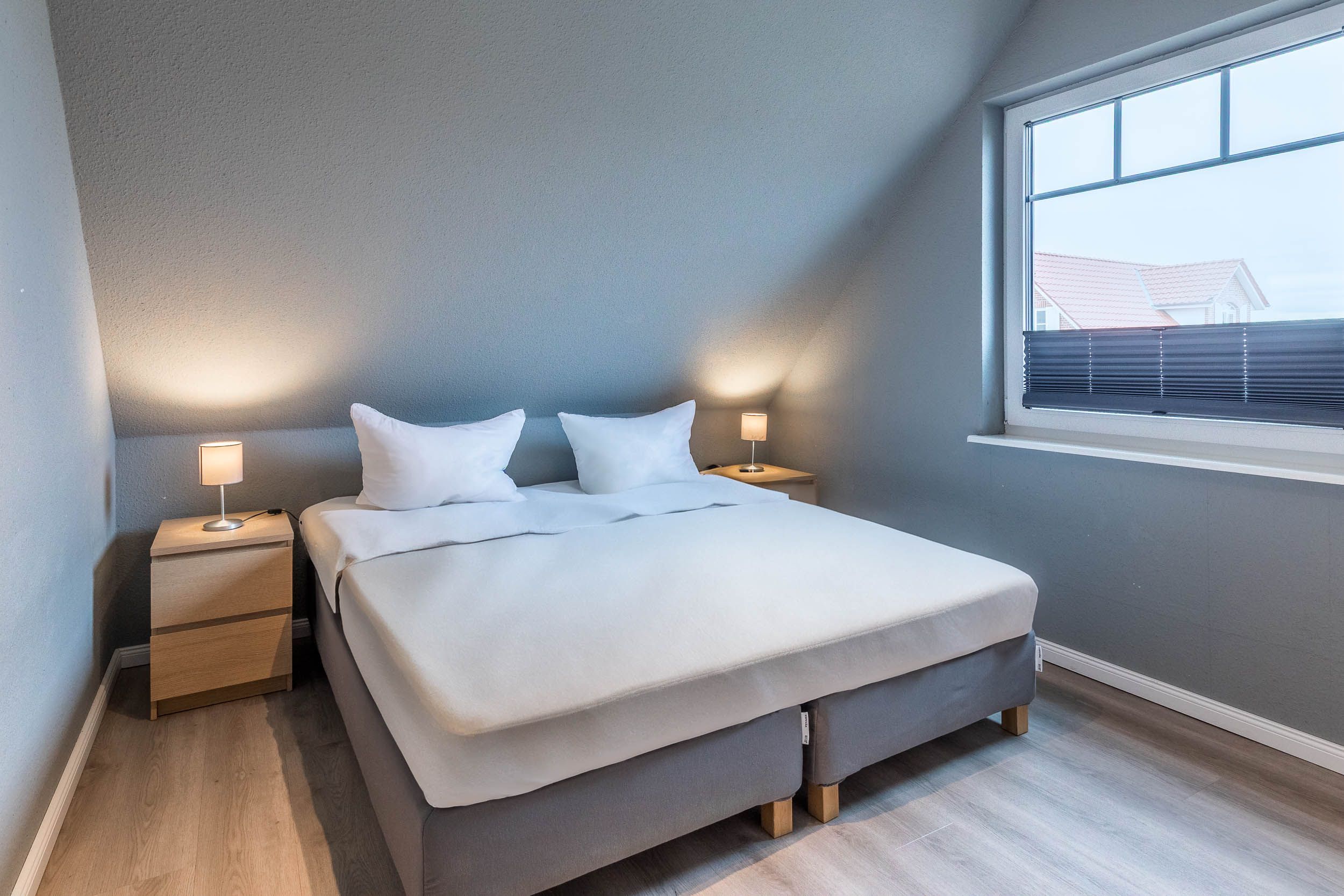 Das zweite Schlafzimmer ist mit zwei Boxspringbetten (90/200), welche man auch gut zusammen schieben kann, eingerichtet.