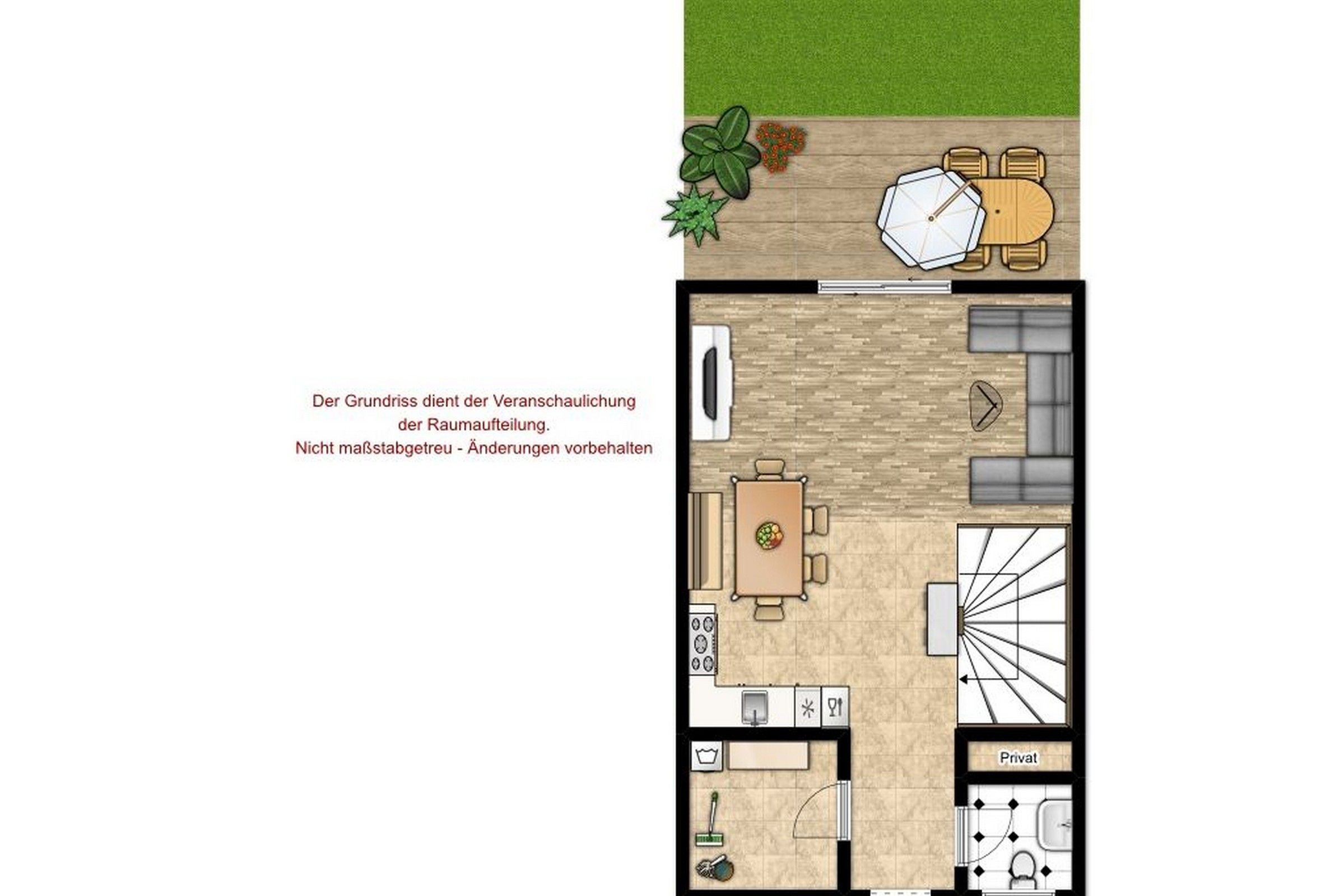 Im Erdgeschoss befinden sich der Wohn- und Essbereich mit Sofa und Magenta TV/- Ecke mit DVD-Player und Soundbar sowie die Küchenzeile. Komfortable Geräte und ausreichend Geschirr sind natürlich vorhanden.