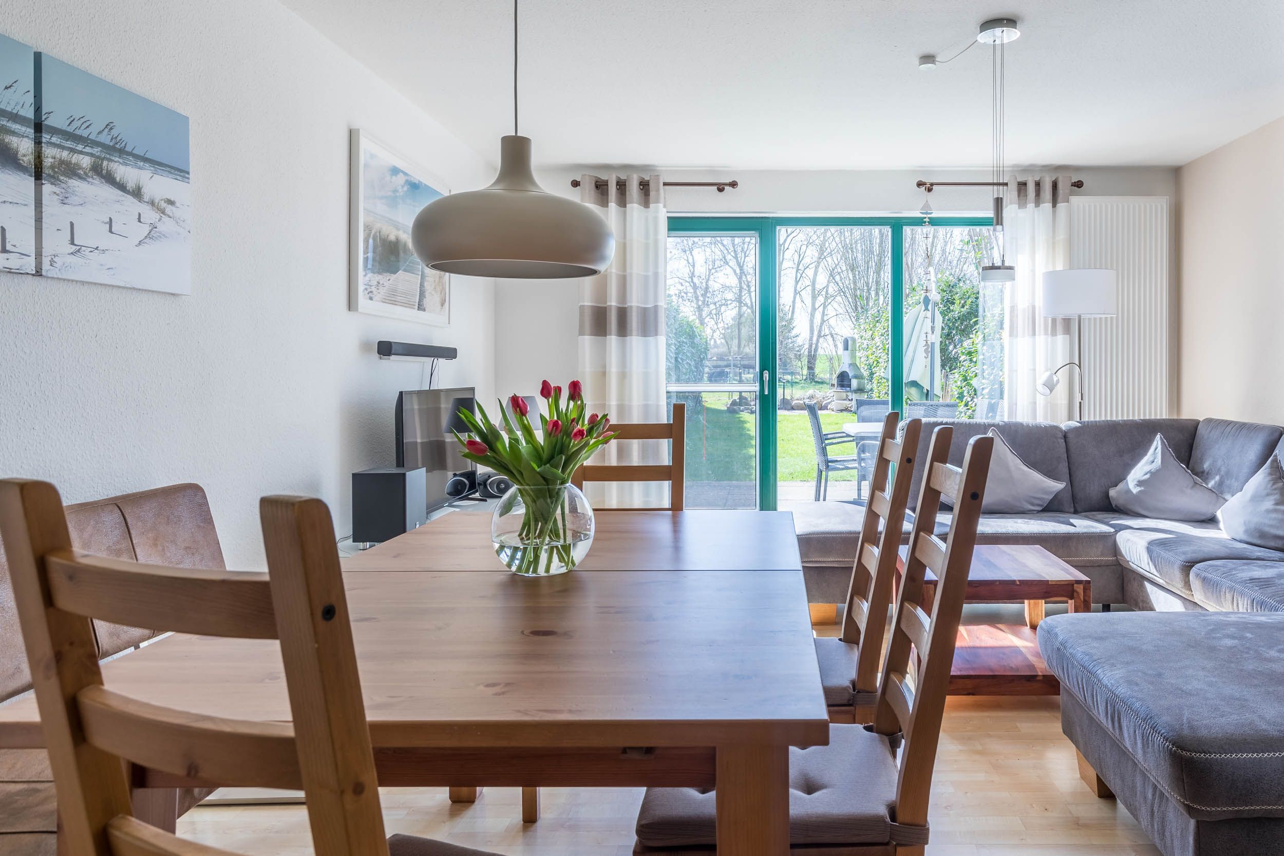 Vom Wohnbereich aus gelangen Sie direkt in den eingezäunten Garten mit möblierter Südwest-Terrasse. Hier können Sie, liebe Gäste, entspannen, die Kinder spielen oder einen gemeinsamen Grillabend verbringen.