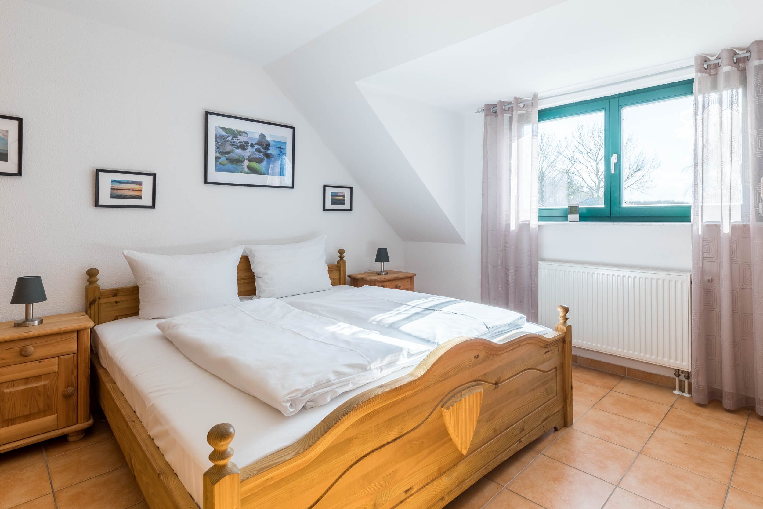 Vom Flur aus führt die Treppe weiter ins Dachgeschoss. In dieser Etage gibt es ein weiteres Schlafreich. Wer Ruhe braucht, ist hier bestens aufgehoben! Auch in diesem Zimmer sorgt ein großes Doppelbett für erholsamen Schlaf.