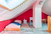 Vom Wohnbereich aus gelangen Sie über eine Raumspartreppe ins offene Dachgeschoss. Hier stehen 2 flache Einzelbetten bereit. Ein eigener Flatscreen-TV an der Wand sorgt auch auf dieser Etage für Unterhaltung. Eine kleine Chill-Ecke mit niedriger Couch, Tisch, Stühlen und Spielzeug lädt zum Relaxen, Lesen und Spielen ein.