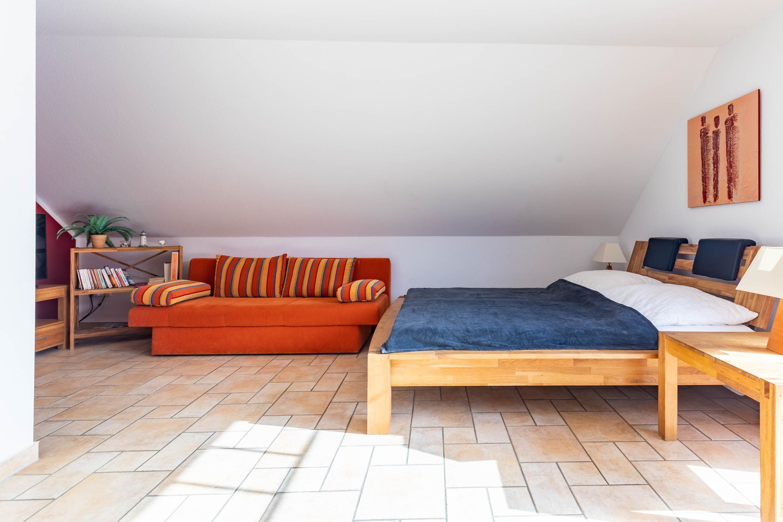 Außerdem finden Sie hier ein helles Bad mit Dusche/ WC sowie ein Schlafzimmer mit Doppelbett, Kleiderschrank und SAT-TV.