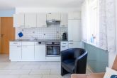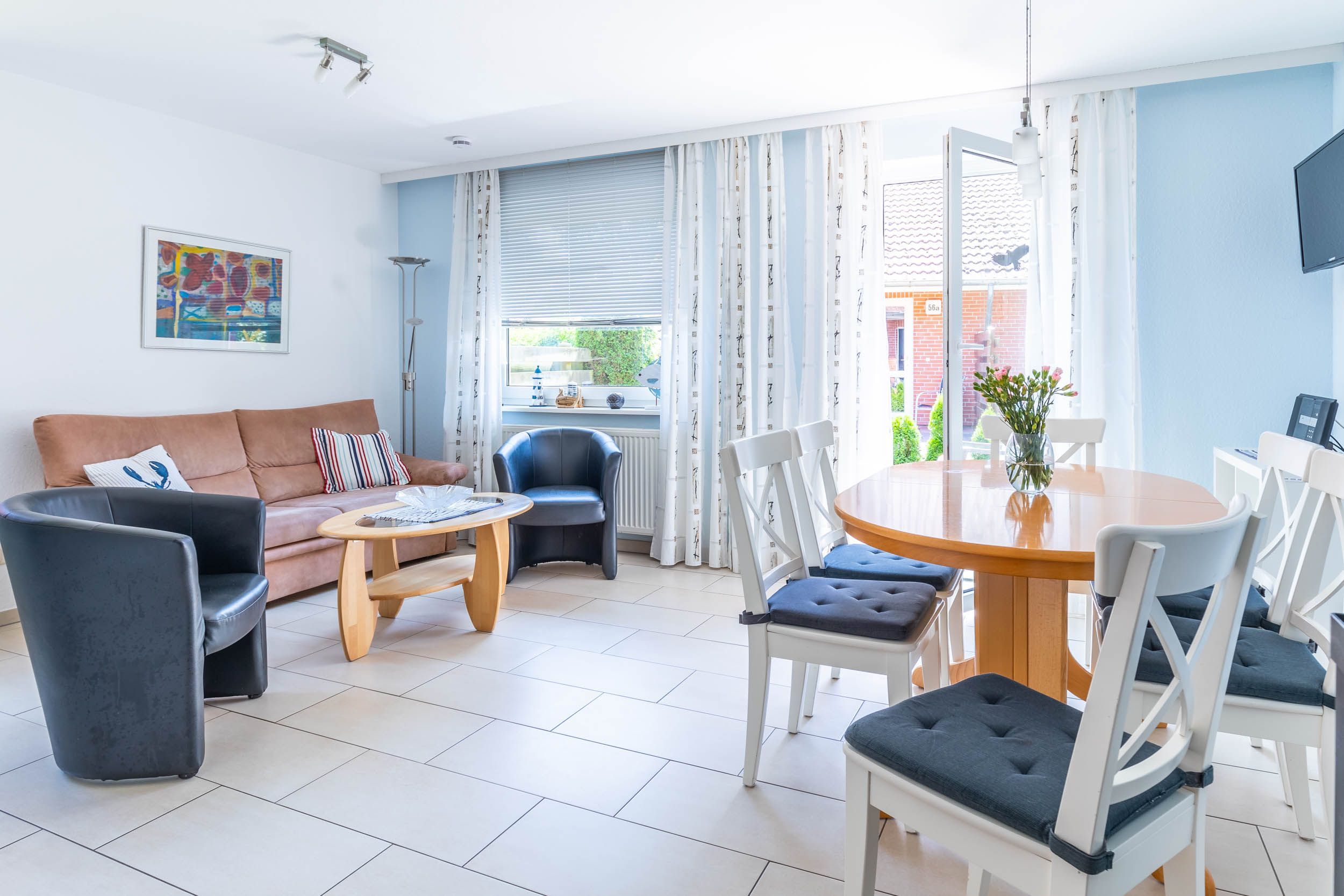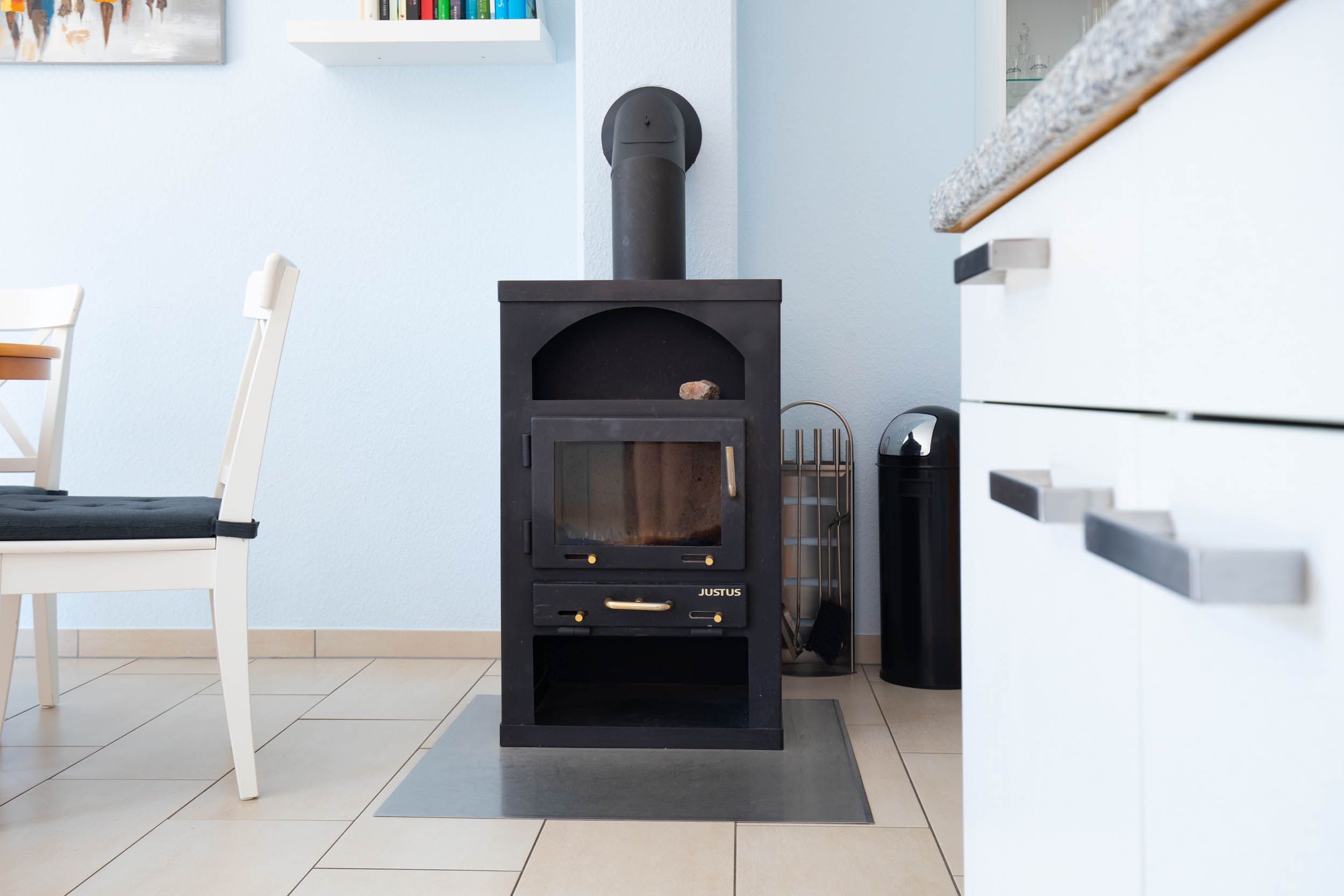 Im Erdgeschoss befindet sich das hell eingerichtete Wohnzimmer mit offener Küche. Im Wohnbereich lädt der Kaminofen an kühlen Abenden zum gemütlichen Beisammensein ein. Genießen Sie das Beisammensein auf der Couch oder an der separaten Essecke. Ein SAT-TV (Flatscreen) dient bei Bedarf zur Unterhaltung.