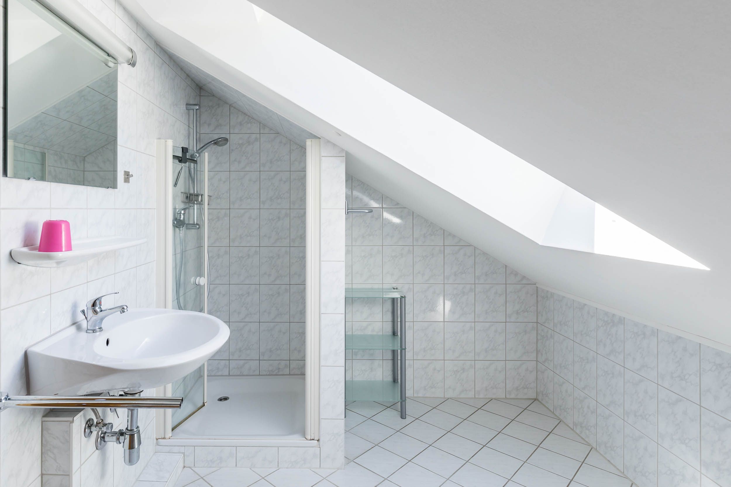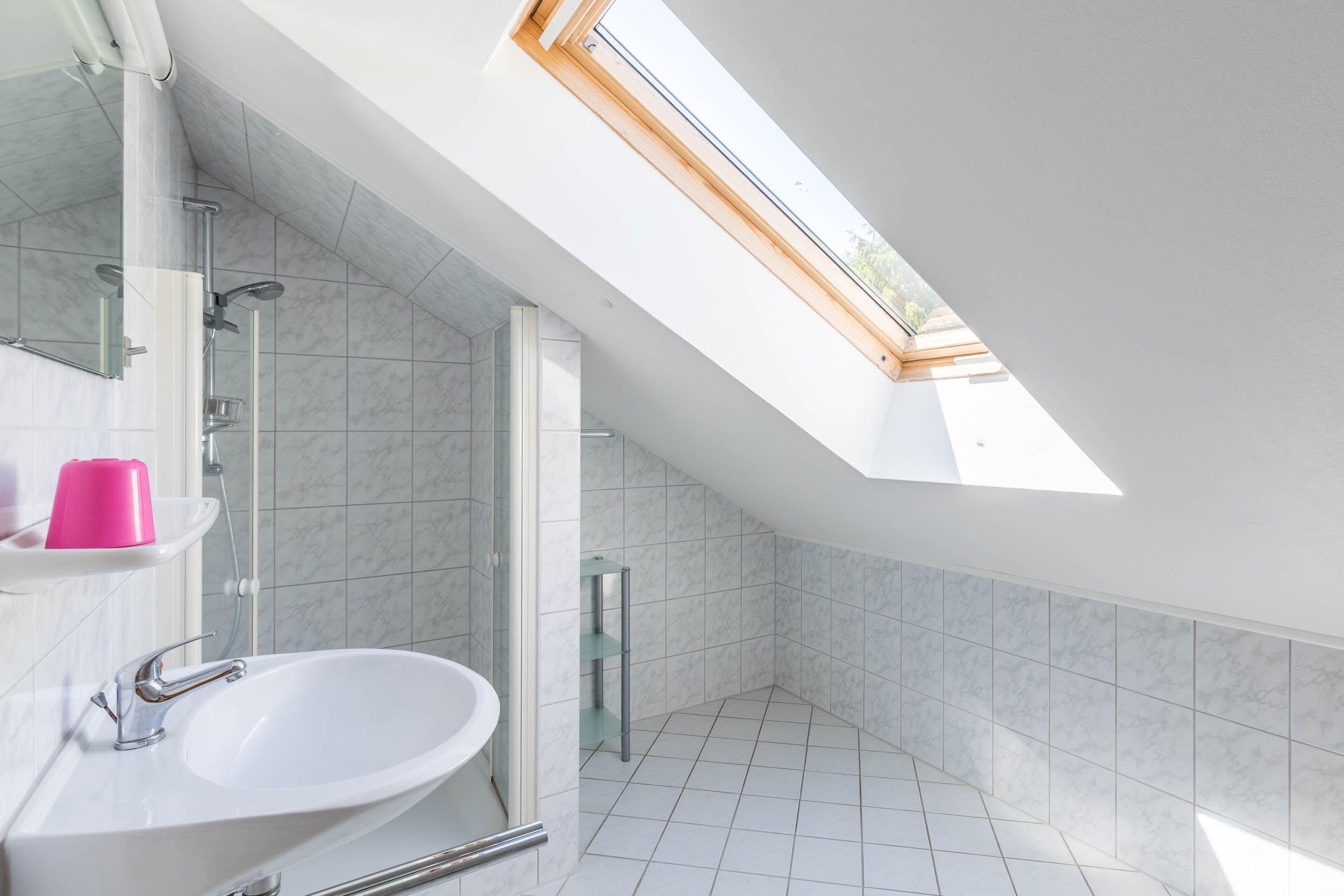 Auch das helle Badezimmer mit Fenster finden Sie auf der unteren Etage. Es ist mit Dusche, WC und auch einer gebührenfreien Waschmaschine ausgestattet.