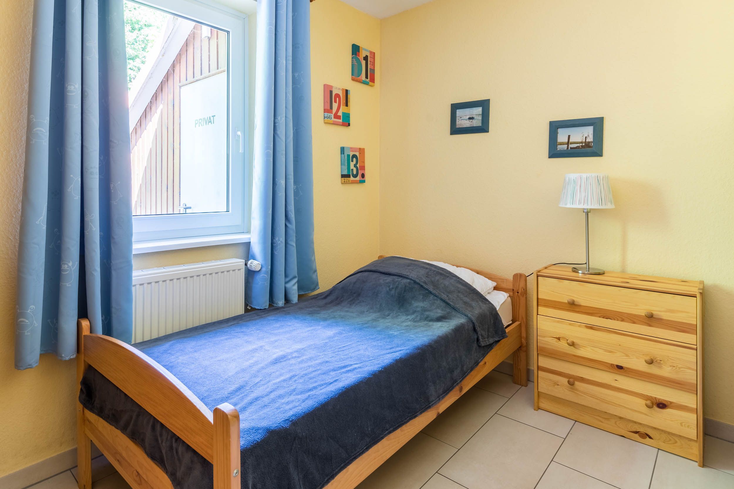 Das Gäste-/ Kinderzimmer auf selbiger Ebene bietet ein Einzelbett und ein Etagenbett. In dem 2türigen Kleiderschrank kann gern die Urlaubsgarderobe abgelegt werden.