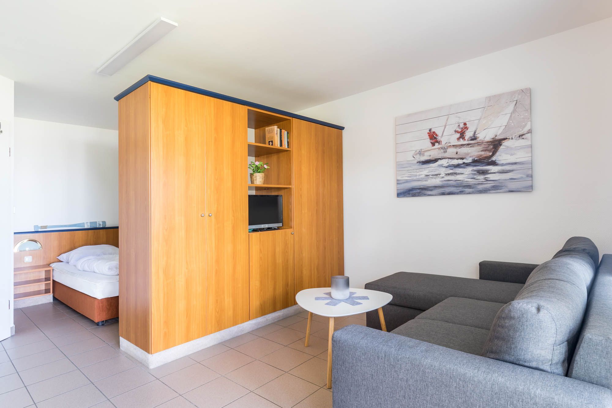 Der kombinierte Wohn-Schlafbereich bietet eine Couch, auf der auch das mitreisende Kind schlafen kann. Der Schlafbereich ist optisch durch zwei Kleiderschränke getrennt, im Mittelteil dieser Schrankreihe befindet sich ein offenes Fach, wo der Flatscreen-TV aufgestellt ist. Durch Drehen können Sie sowohl vom Wohn- als auch vom Schlafbereich fernsehen.