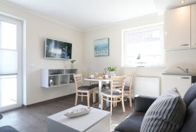 Die im EG hell und modern eingerichtete 3-Zimmer-Ferienwohnung verfügt über etwa 58qm Wohnfläche für 3 Gäste.