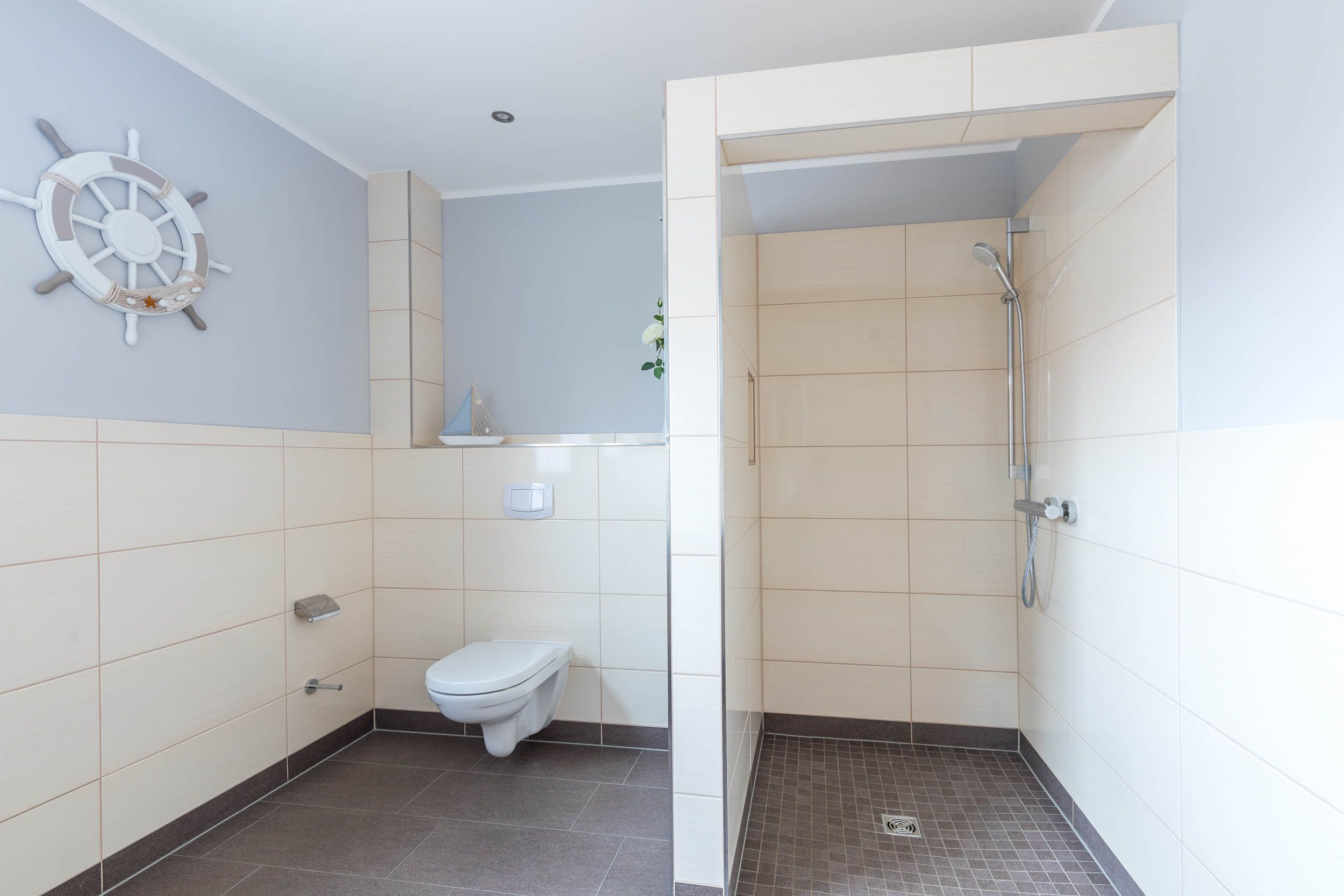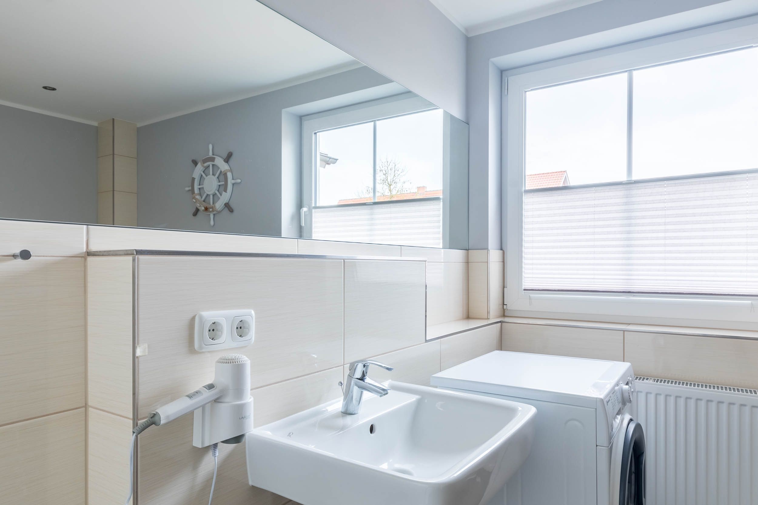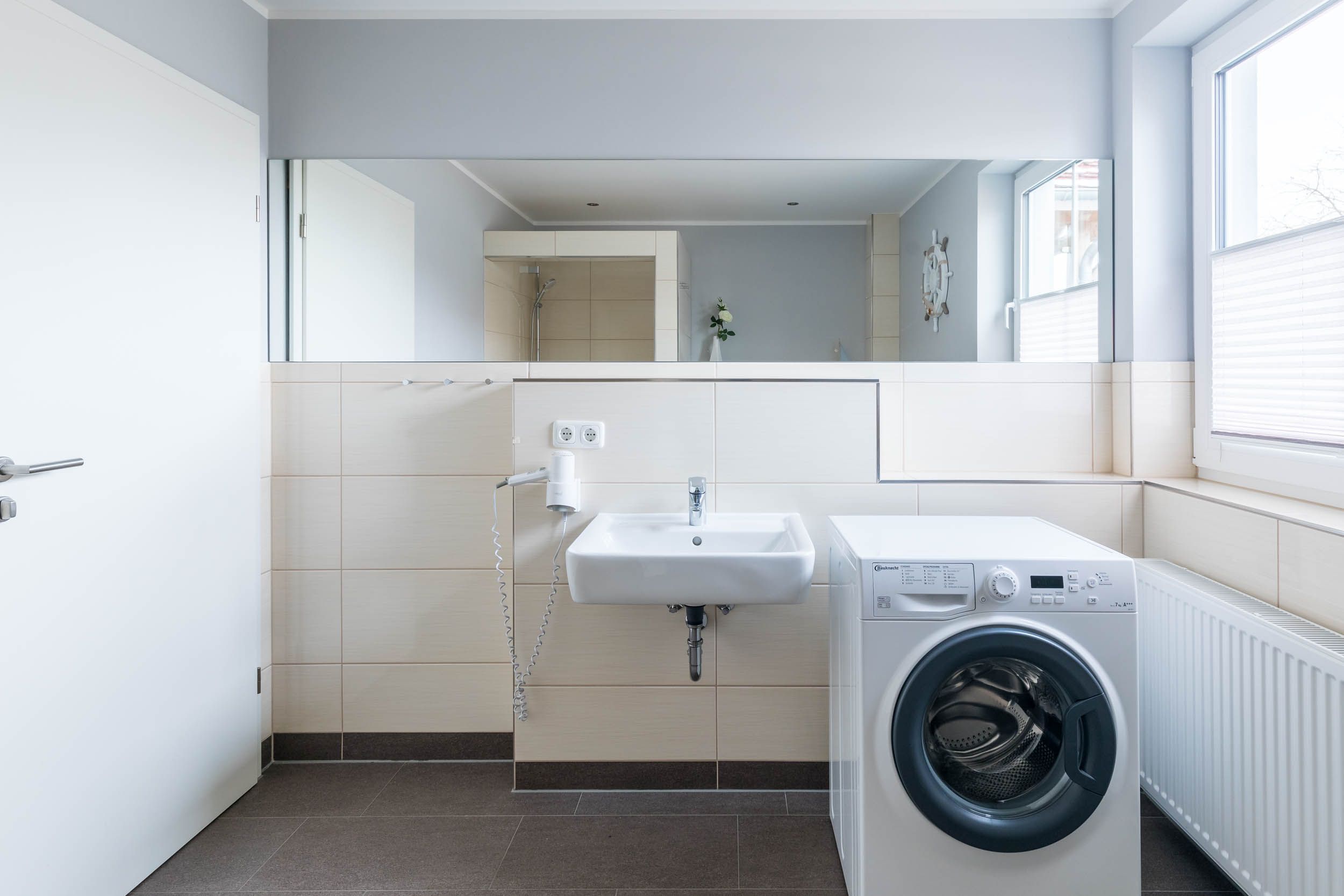 Im modernen Bad mit Tageslicht finden Sie eine barrierefreie Dusche, Waschbecken, WC und auch eine Waschmaschine.