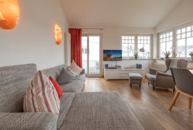 Der moderne und helle Küchenbereich ist zum Wohnbereich durch einen Tresen abgegrenzt. Gerade dieses offene Wohnkonzept lässt ein sehr gemütliches und kommunikatives Wohnerlebnis im Urlaub zu, und die hohen Decken entfalten geradezu einen Loft-Charme. Ein Esszimmertisch mit Platz für 4 Personen grenzt direkt an den integrierten Tresen an.