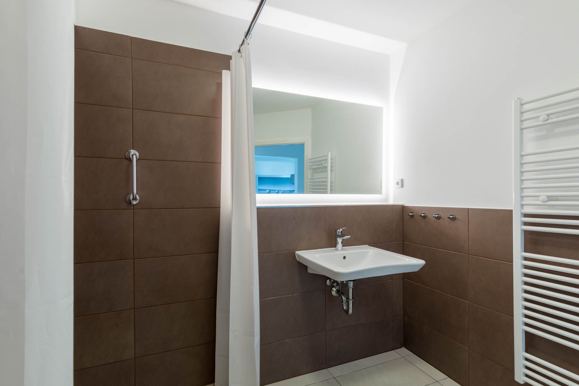 Das Badezimmer verfügt neben einer bodengleichen Dusche und einem WC auch über einen Föhn.