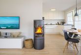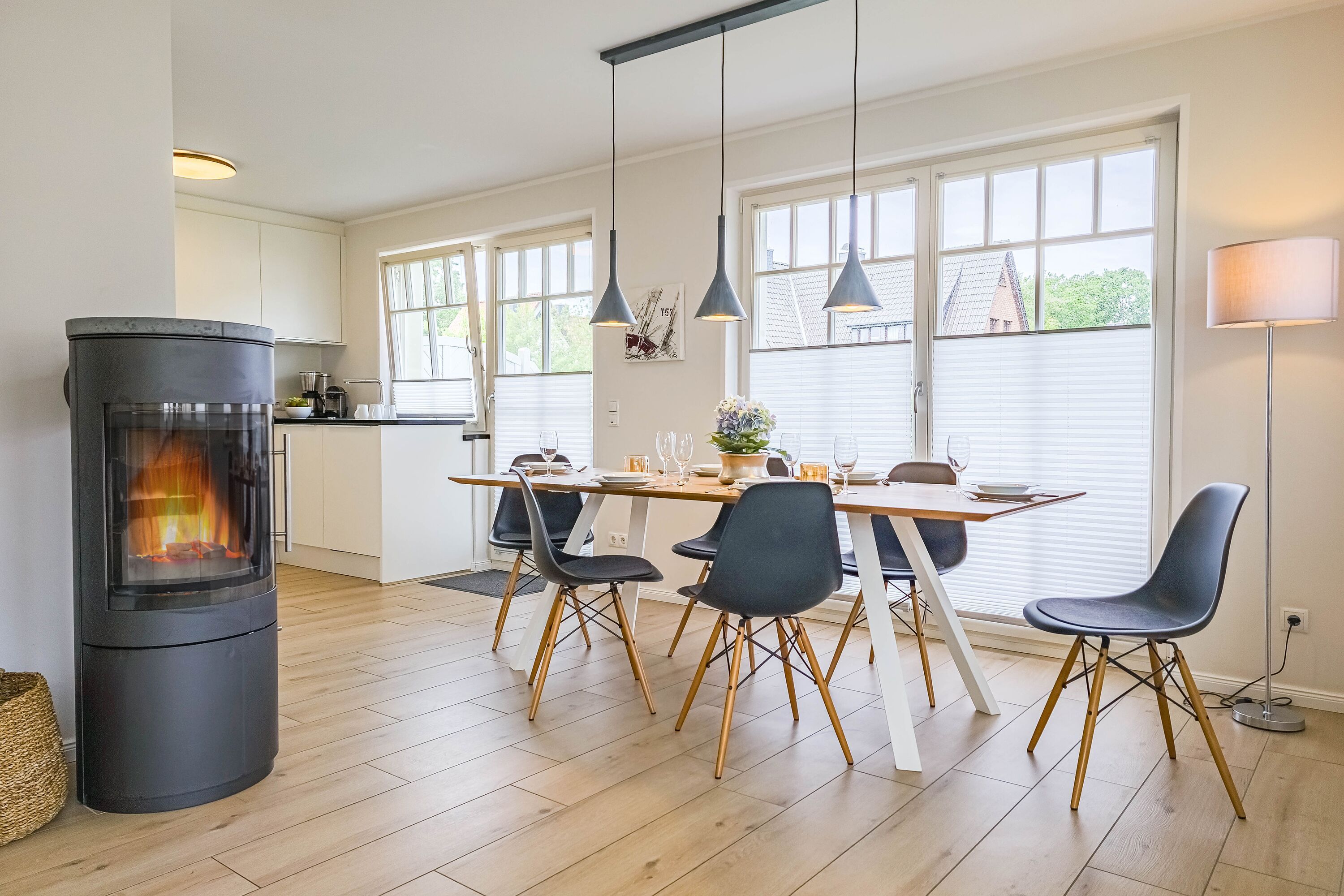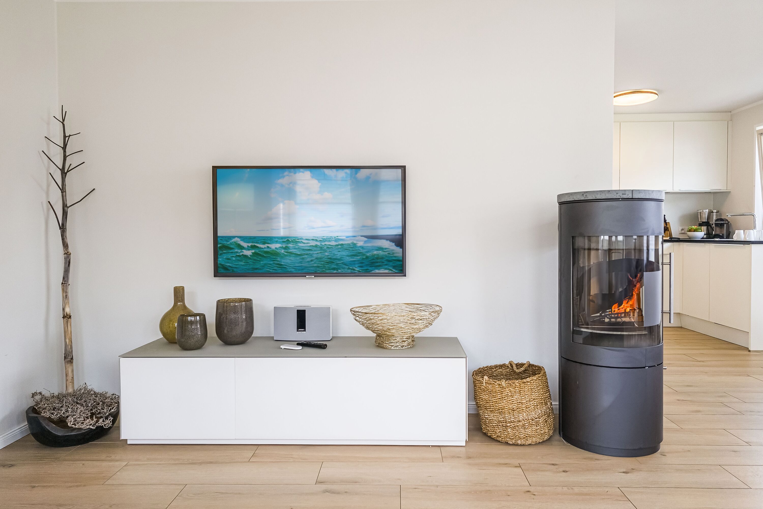 • Gemütlicher Wohnbereich mit Kaminofen und Smart-TV
