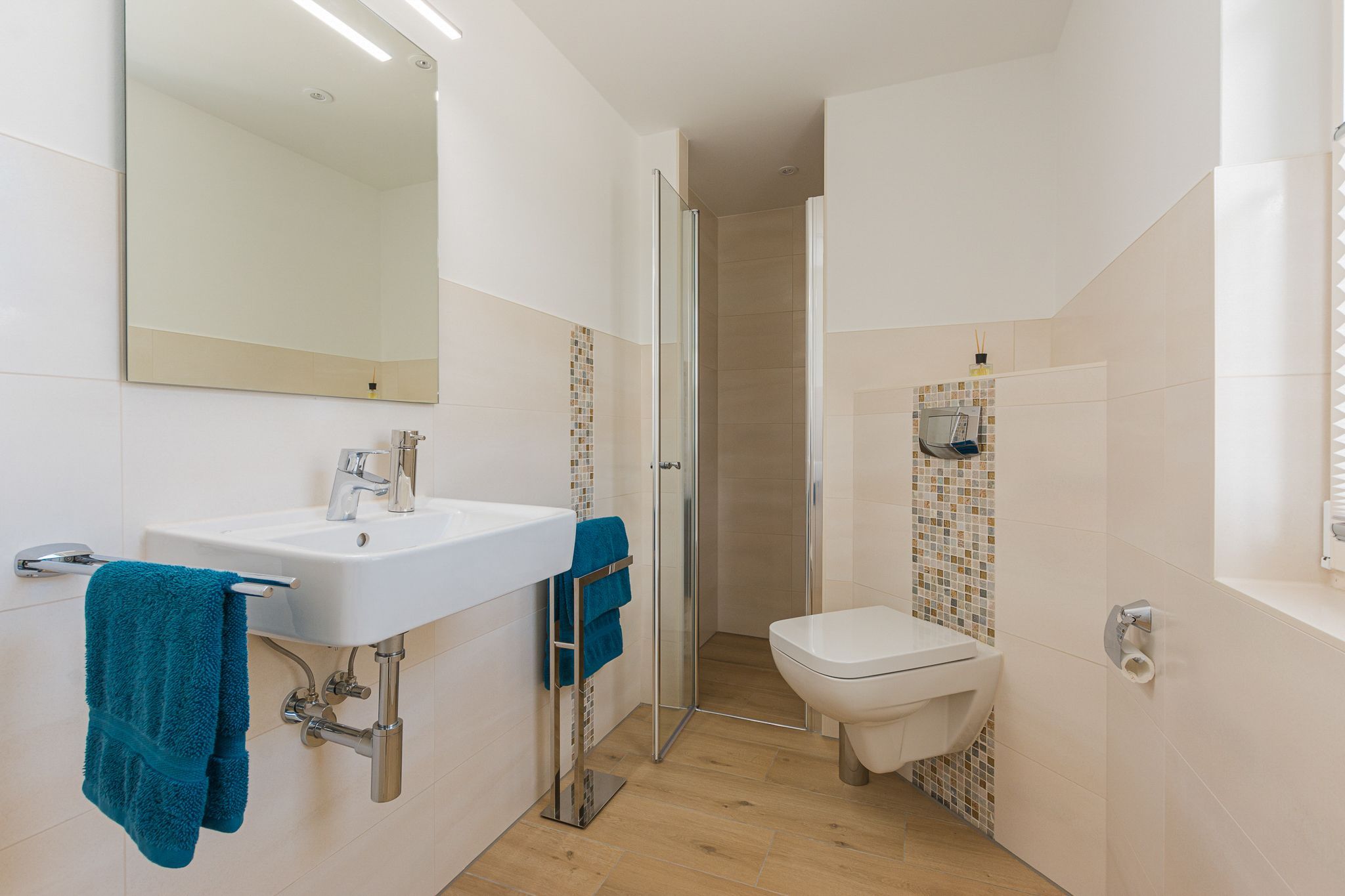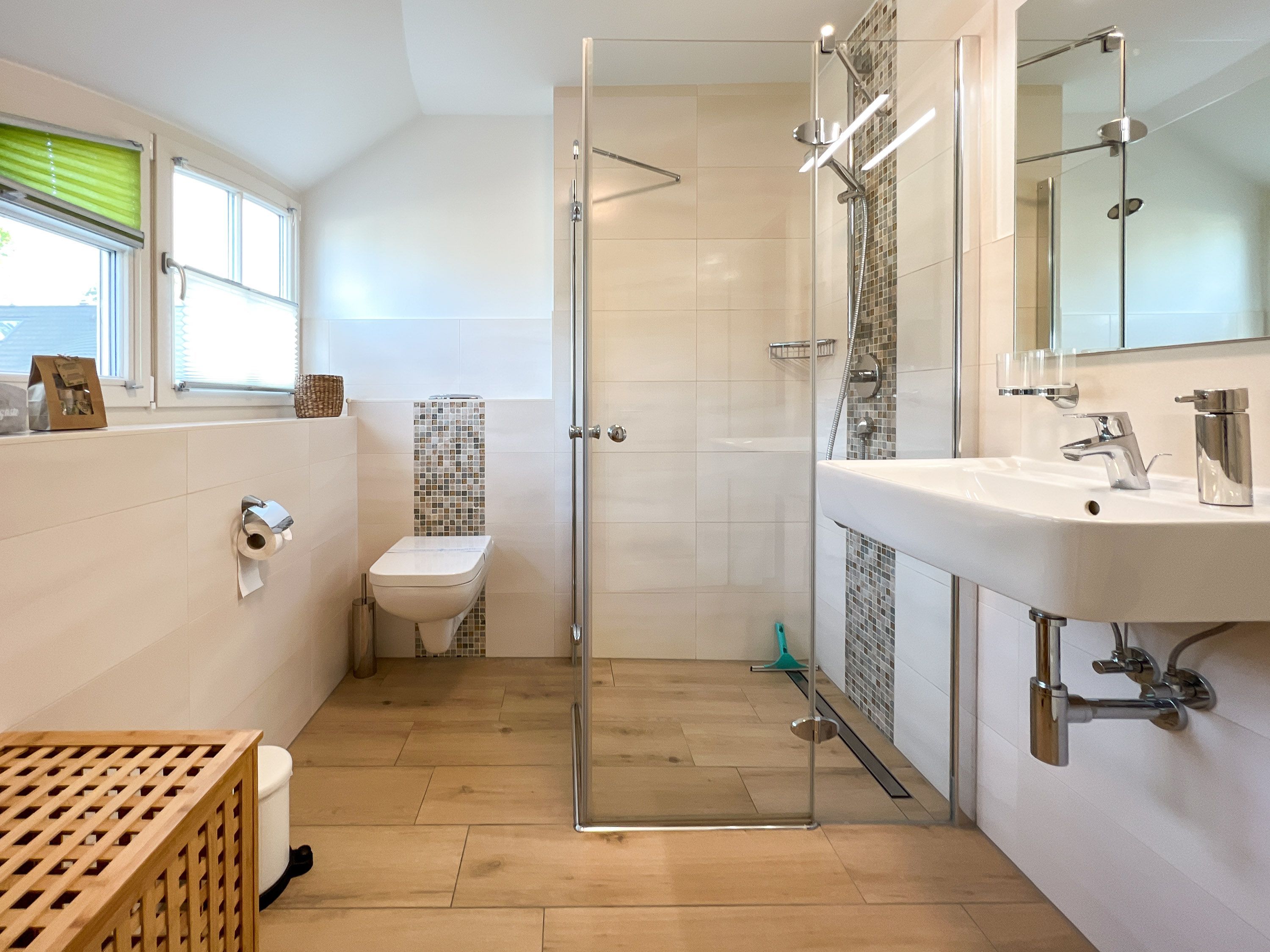 • Zwei Badezimmer: beide mit ebenerdigen Duschen, eines zusätzlich mit Badewanne