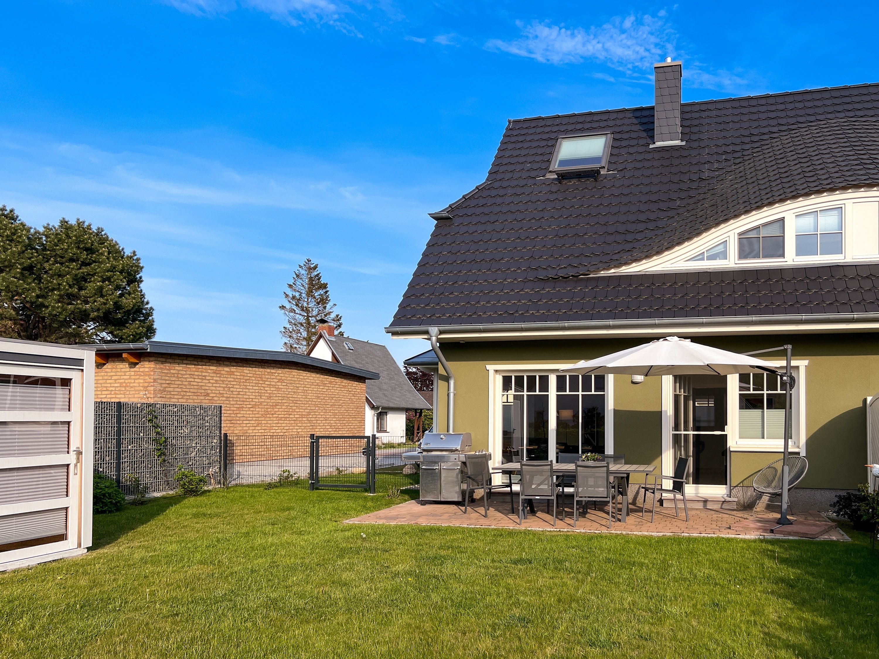 Nach einem erlebnisreichen Tag an der frischen Ostseeluft lädt die private Sauna zum Entspannen ein und bietet die perfekte Möglichkeit, müde Muskeln zu lockern und zur Ruhe zu kommen. Starten Sie den Tag auf der sonnigen Terrasse mit einem gemütlichen Frühstück oder genießen Sie abends die letzten Sonnenstrahlen im umzäunten Garten. Die hochwertigen Gartenmöbel und ein Grill bieten zusätzlichen Komfort für entspannte Stunden im Freien.