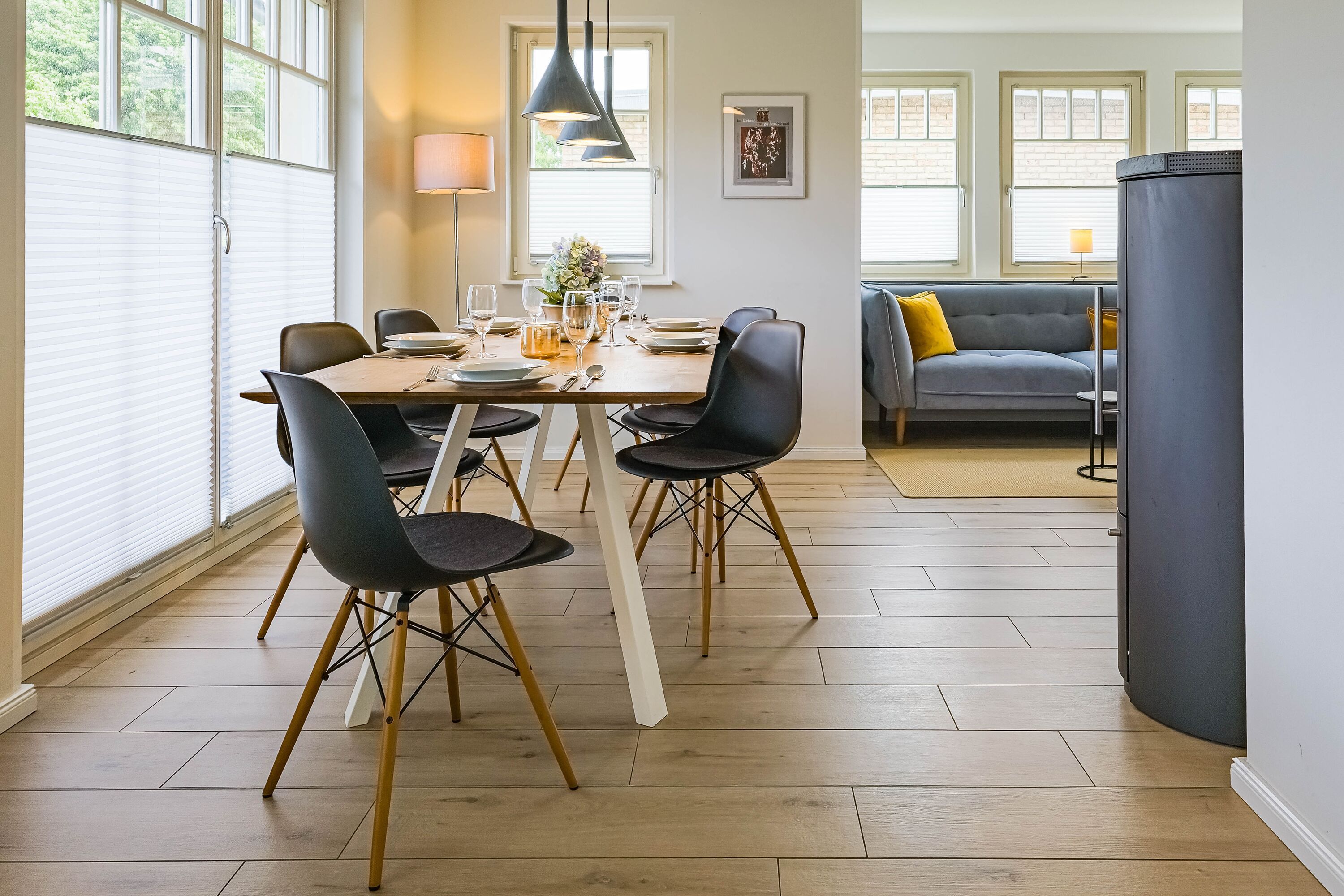 Das Ferienhaus Kranschehus empfängt Sie mit einer warmen und einladenden Atmosphäre. Der großzügige Wohnbereich mit Kaminofen ist das Herz des Hauses und lädt zu entspannten Abenden ein sei es bei einem guten Buch oder einem gemeinsamen Spieleabend. Die moderne Küche ist vollständig ausgestattet, sodass Sie mühelos köstliche Mahlzeiten für Ihre Liebsten zubereiten können.