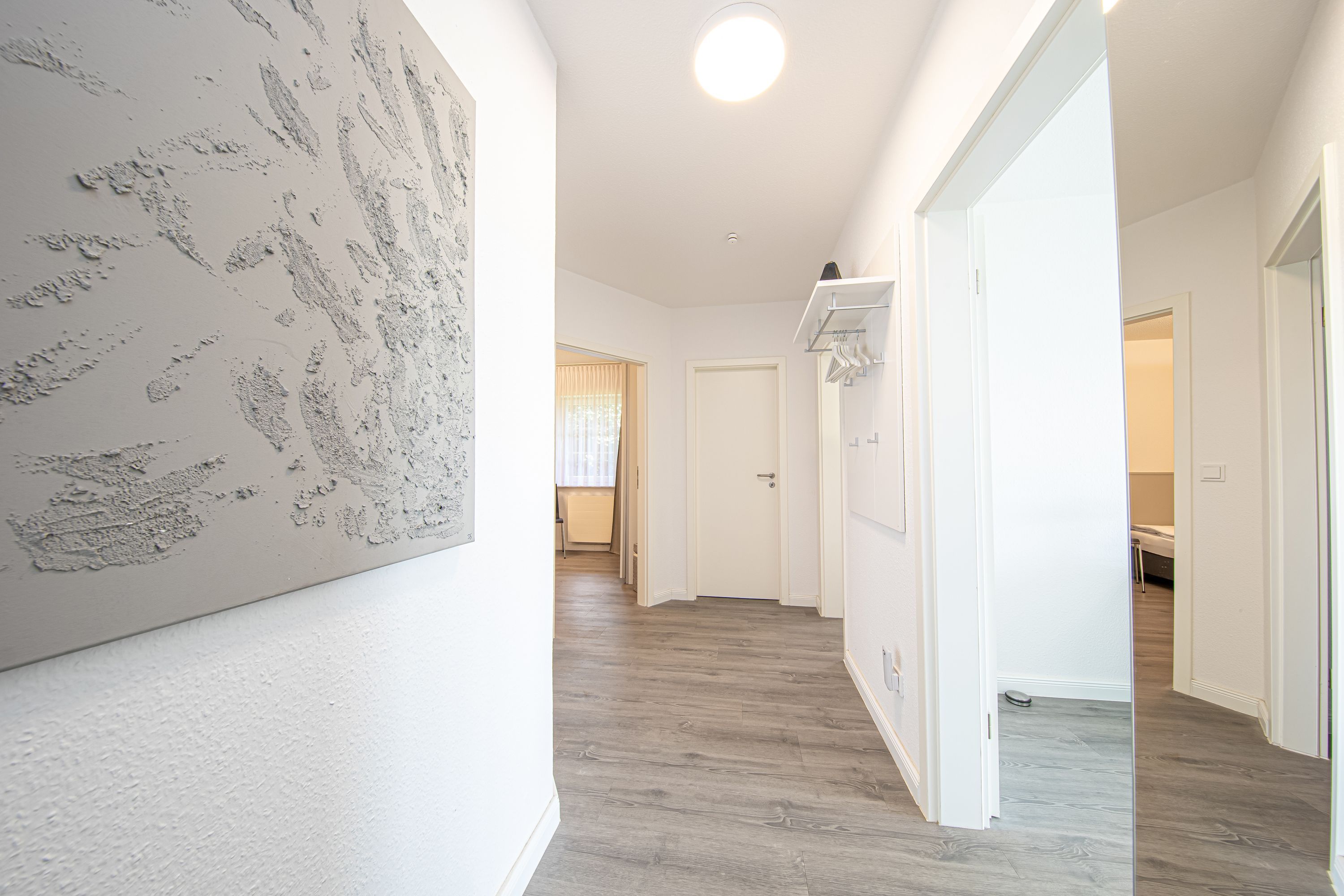 Im Flur befinden sich eine Garderobe und ein Spiegel-Schuhschrank. Wäscheständer und diverse Reinigungsutensilien sind im separaten Abstellraum verfügbar.