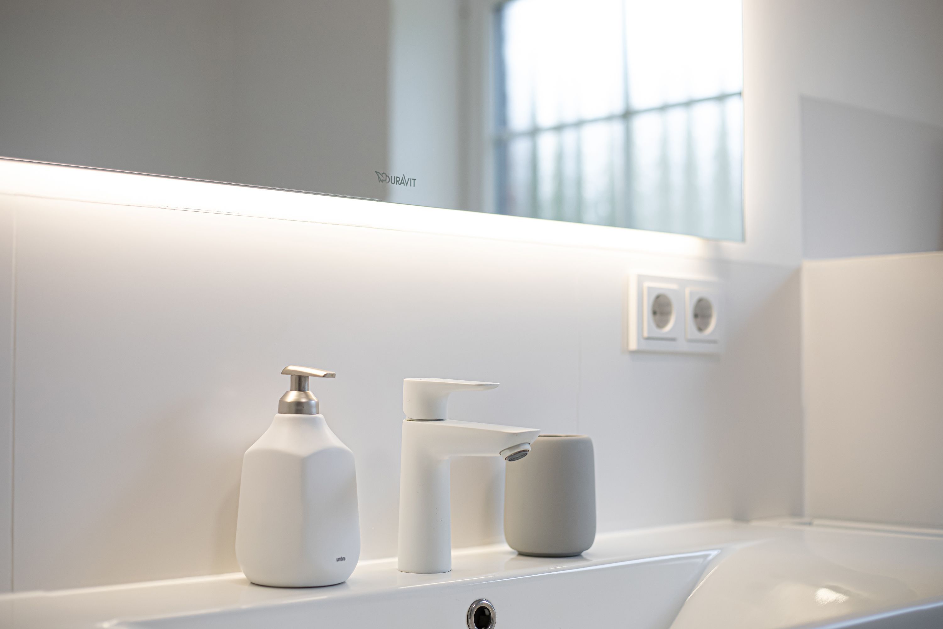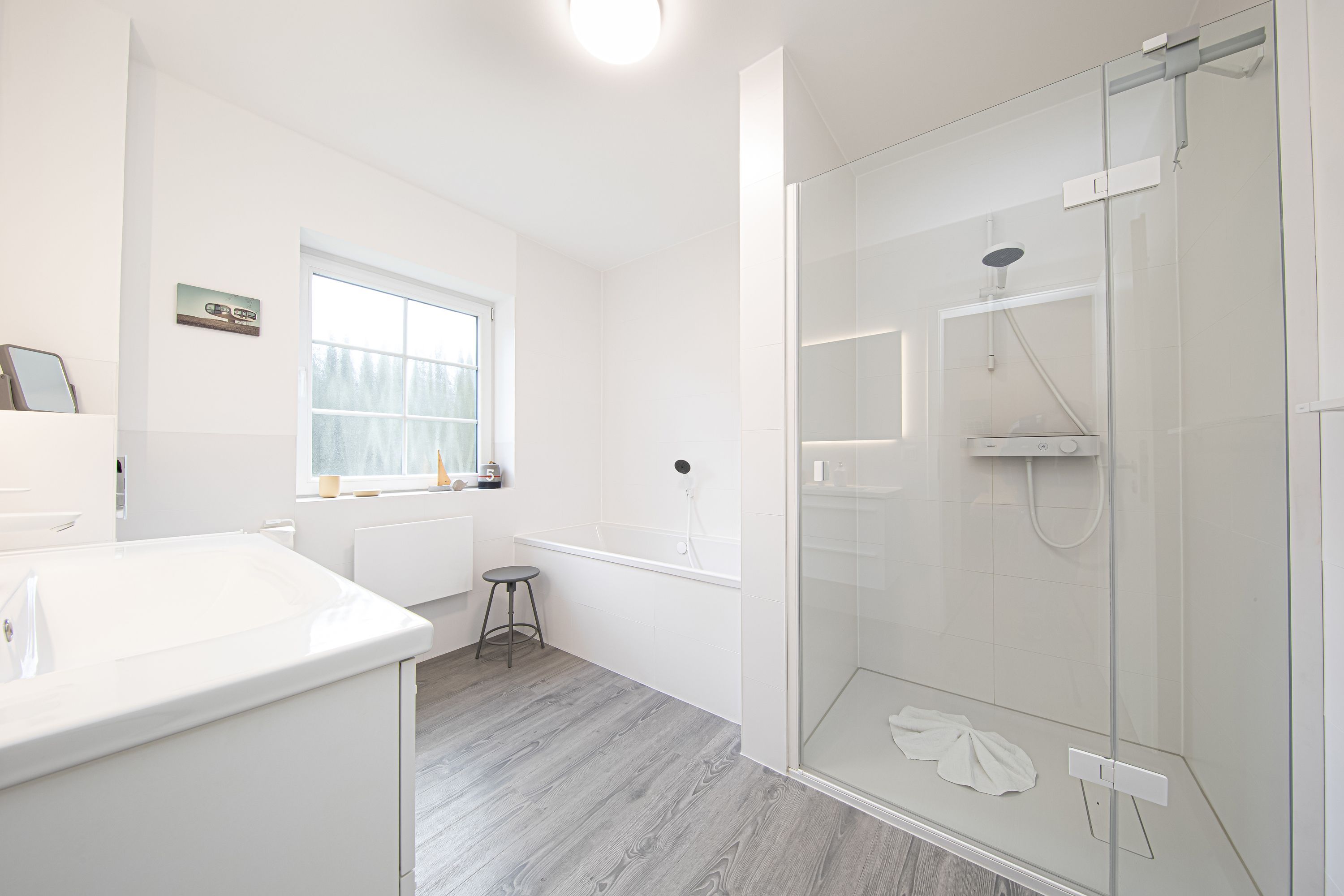 Im modernen Tageslichtbad können Sie sich in einer Badewanne entspannen. Eine separate Dusche sowie Spiegel, Fön, WC und ein großer Waschtisch runden den Sanitärbereich ab.