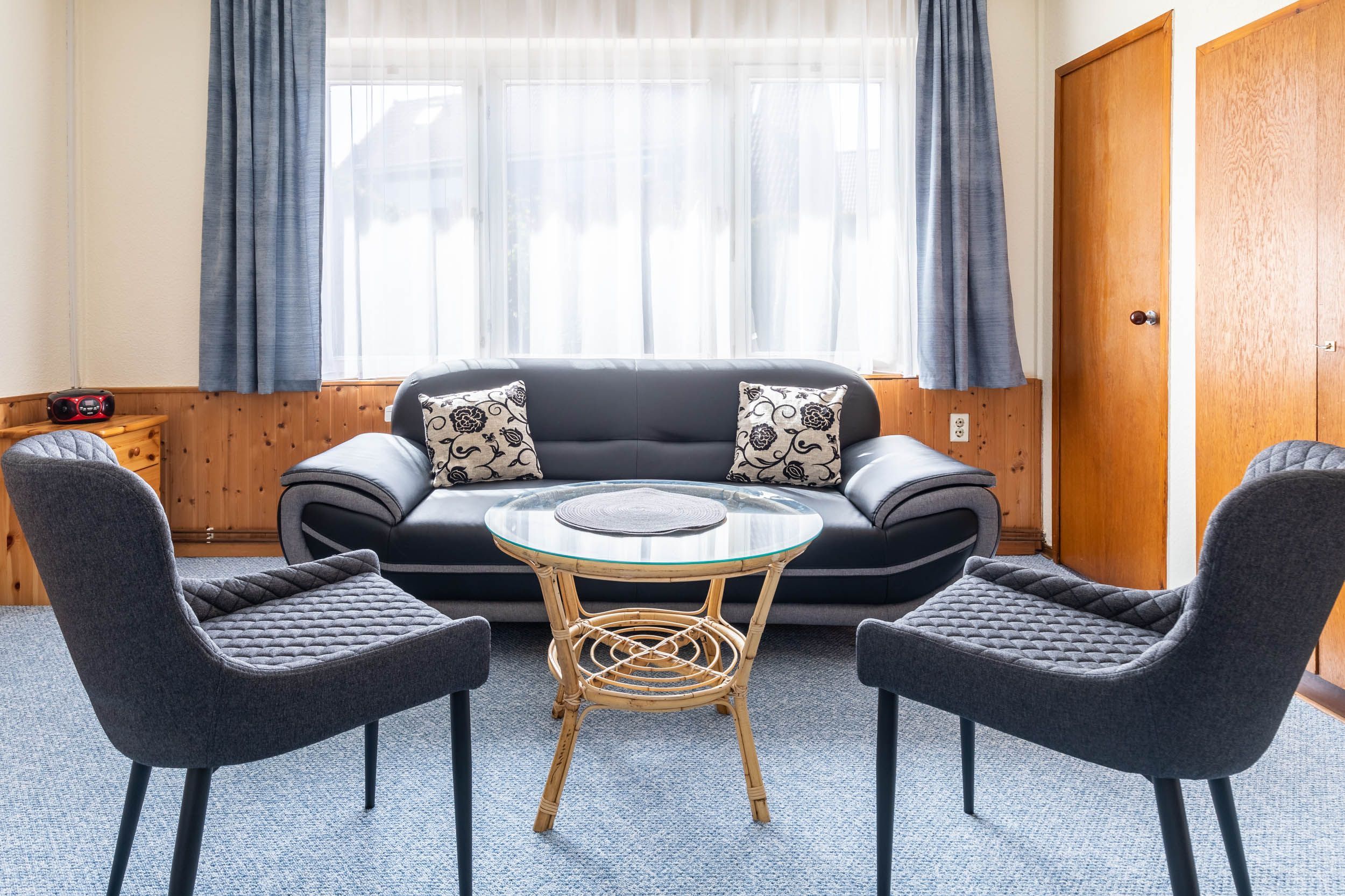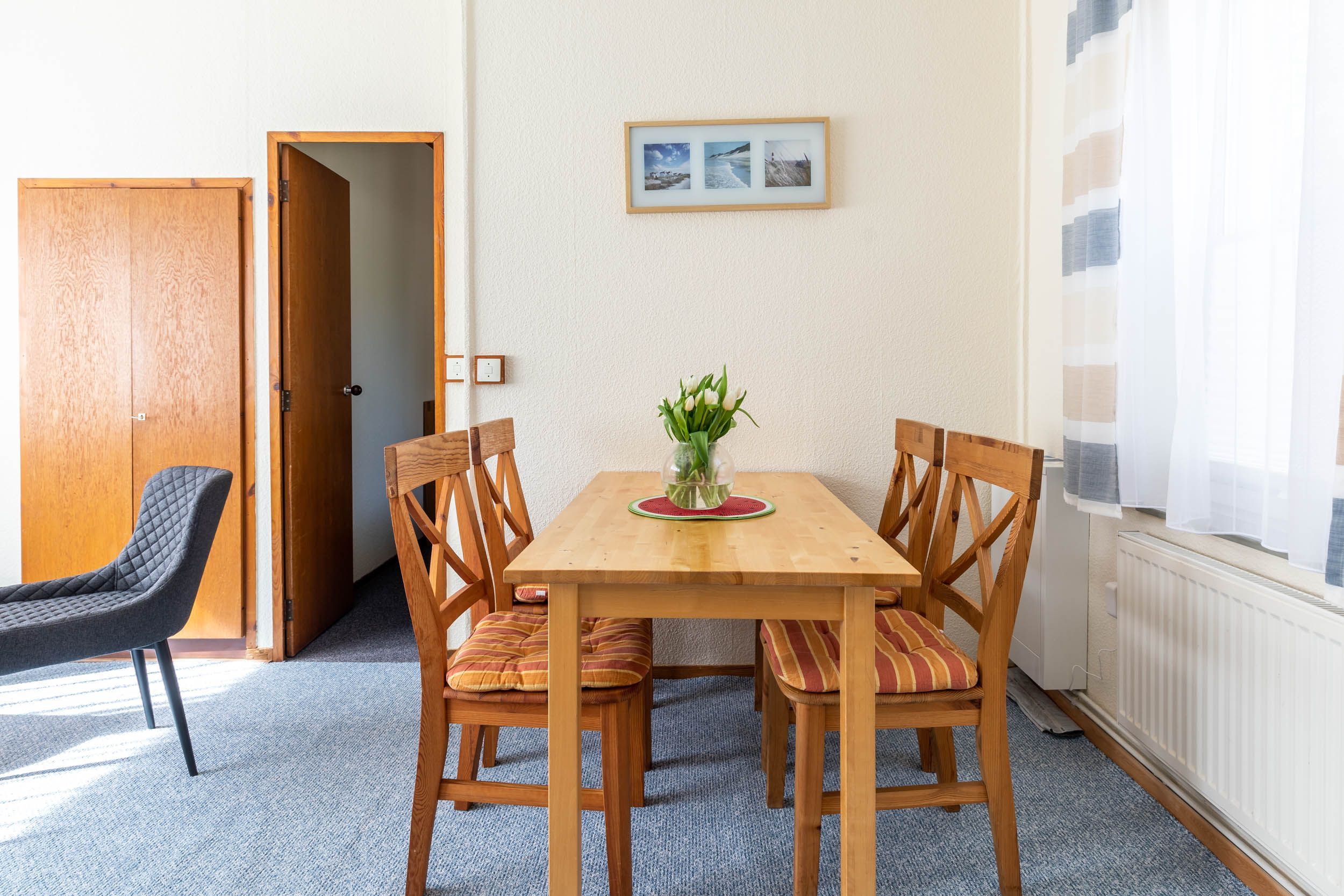 Der Wohn- und Essbereich verfügt über ein Sofa mit passenden Sesseln, Sat-TV und einer Essecke für 4 Gäste. Weiterhin gibt es im Wohnzimmer einen Wandschrank, wo Sie Ihre Urlaubsgarderobe unterbringen können.