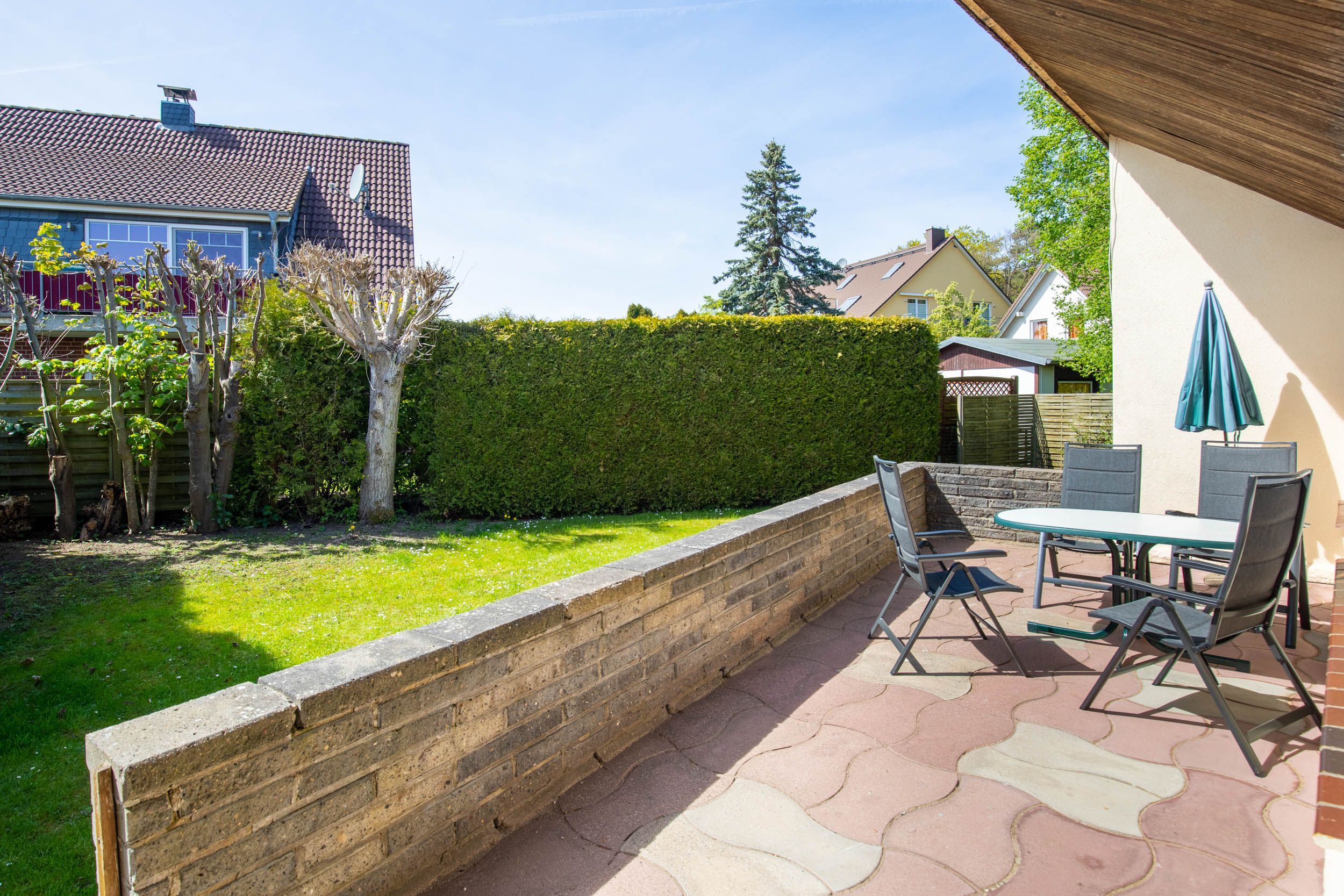 Die möblierte West-Terrasse mit Garten lädt zum gemütlichen Beisammensein ein.