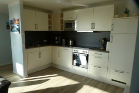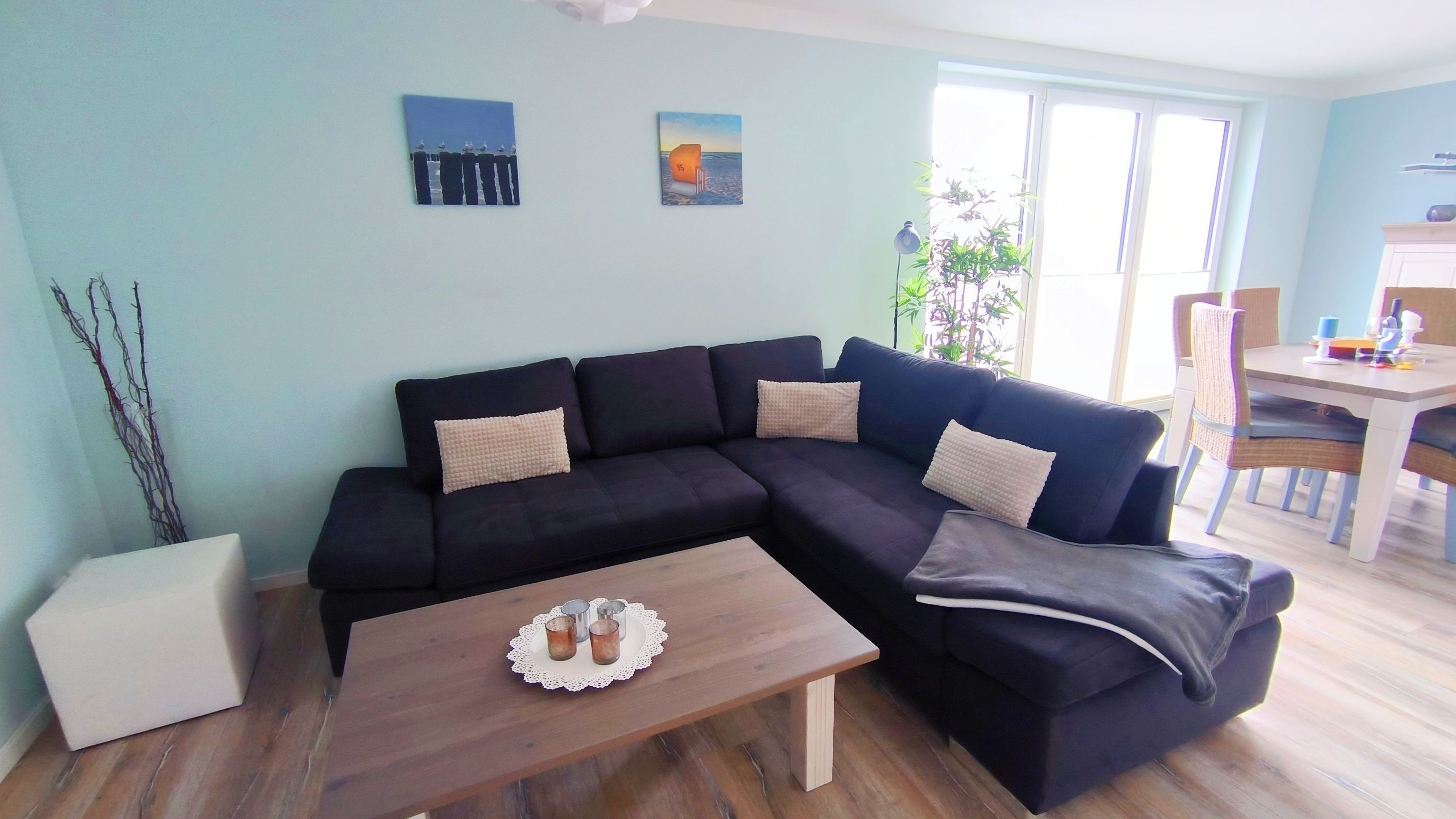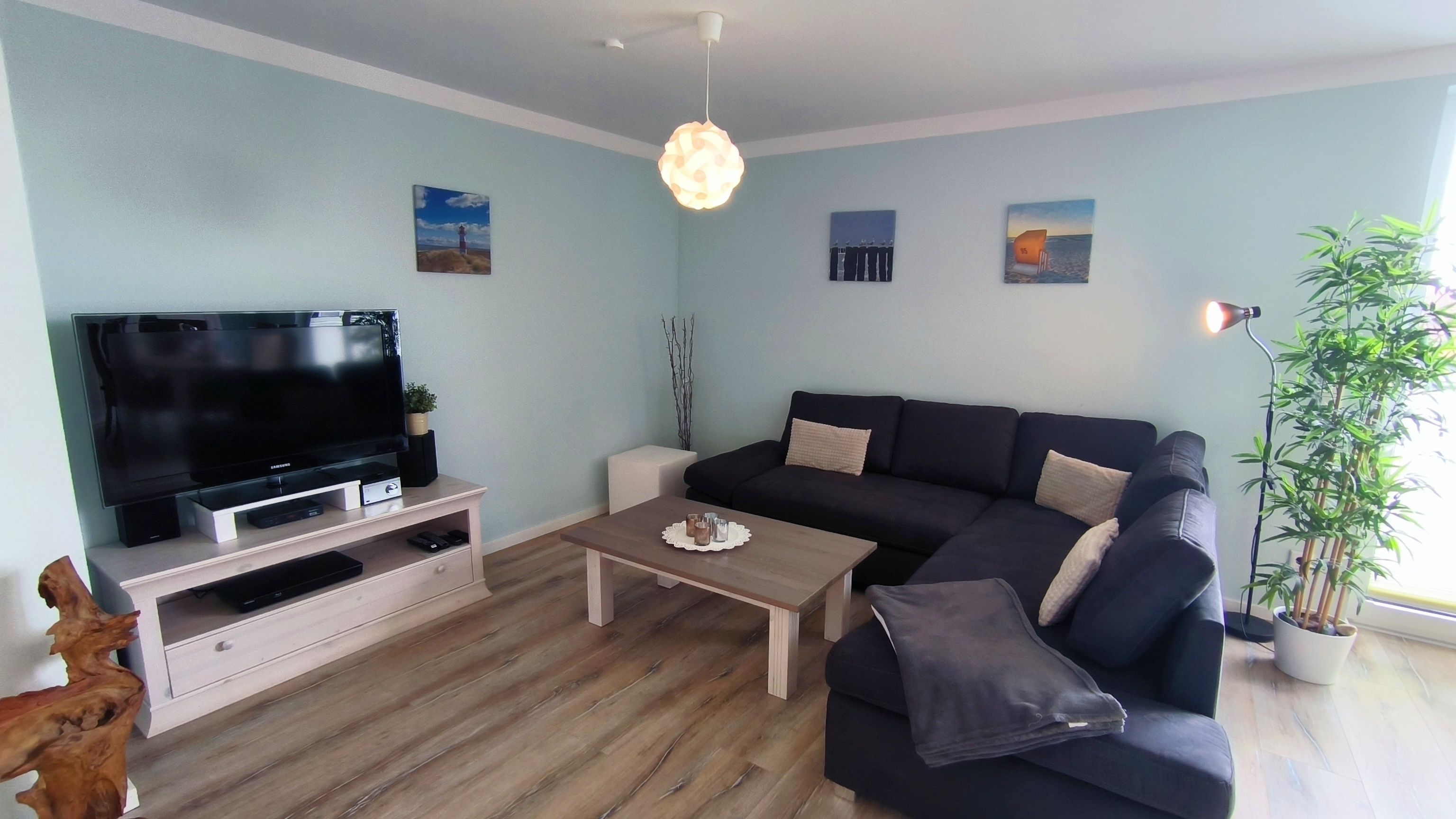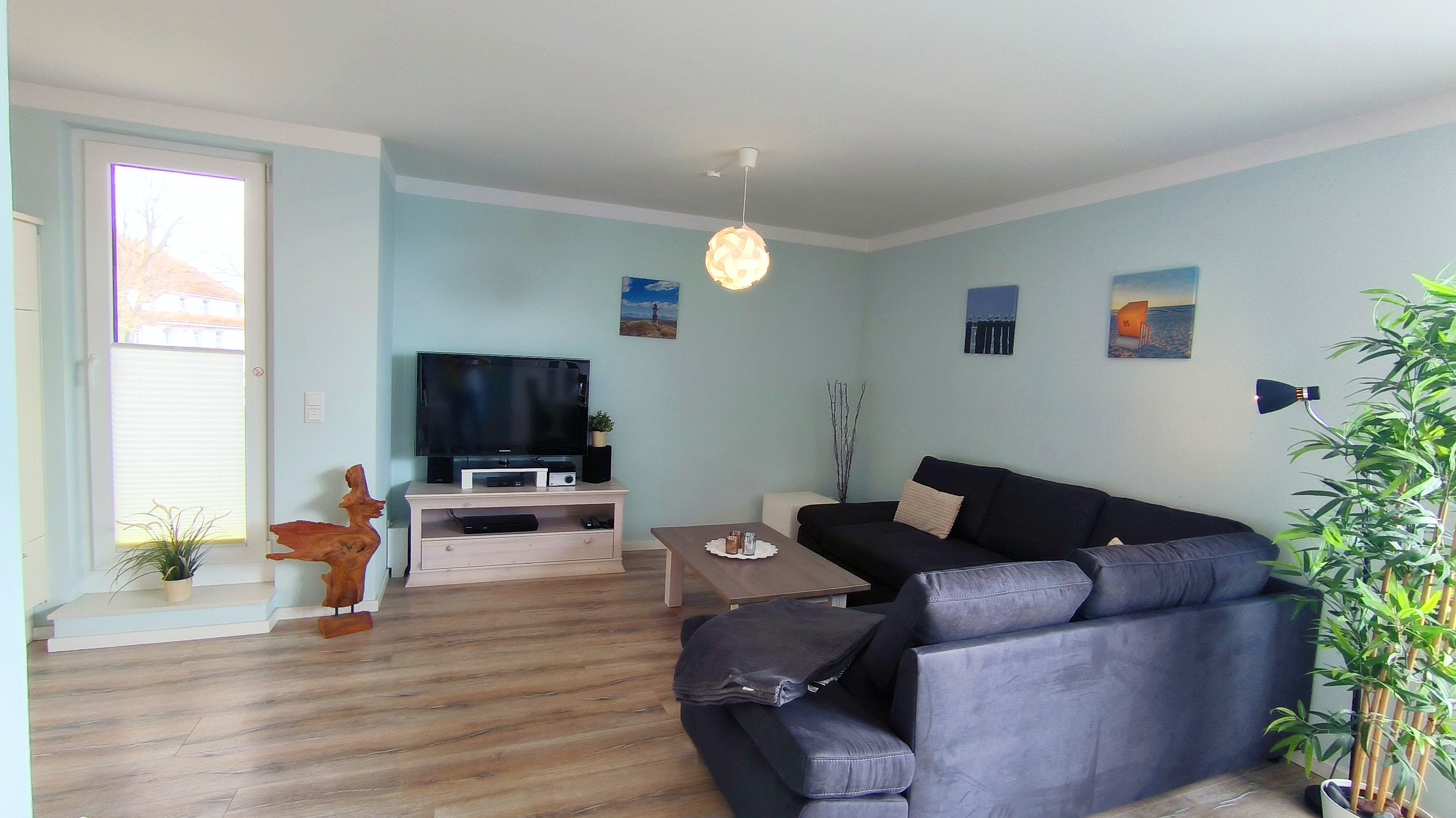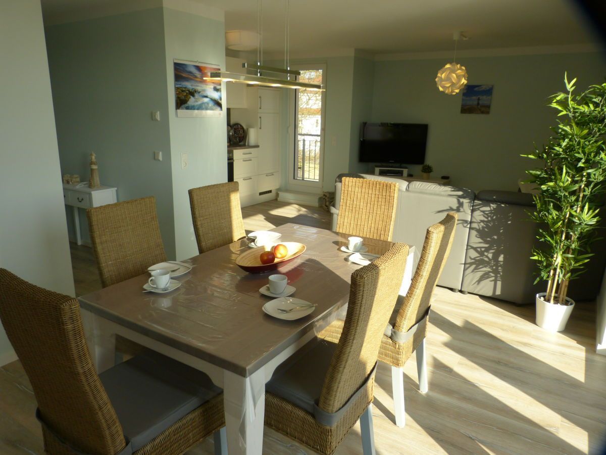 Unsere 93 qm große, gemütliche Ferienwohnung im maritimen Landhausstil mit exklusive Ausstattung , wie großem LCD Fernseher, WLAN, Blu-ray Player mit großer DVD-Sammlung für die regnerischen Tage uvm, befindet sich im Dachgeschoss eines Ende 2014 fertiggestelltem Ferienkomplexes mit Fahrstuhl und eigenem Auto Stellplatz direkt neben dem Gebäude. Die Wohnung verfügt über einen großzügigen Wohnbereich mit integrierter exklusiver Küchenzeile sowie einen komfortablen Essplatz. Insgesamt 3 Balkone laden zum Relaxen ein, wobei der Baklon mit kleinem Haffblick (Süden) über eine gemütliche Sitzecke und Essecke verfügt. Sie finden bei uns zwei helle, geräumige Schlafzimmer, die Platz für 2 bis maximal 6 Personen bieten. Ein Schlafzimmer verfügt über ein schönes, komfortables Doppelbett (Boxspringbett). Das andere über ein Etagenbett und ein Einzelbett mit integriertem Rollbett. Unser großzügiges Badezimmer verfügt über eine ebenerdige große Dusche und ein separates WC. Für die kleinen Gäste ist ein Kinderbett, Kinderstuhl und separates Kindergeschirr vorhanden