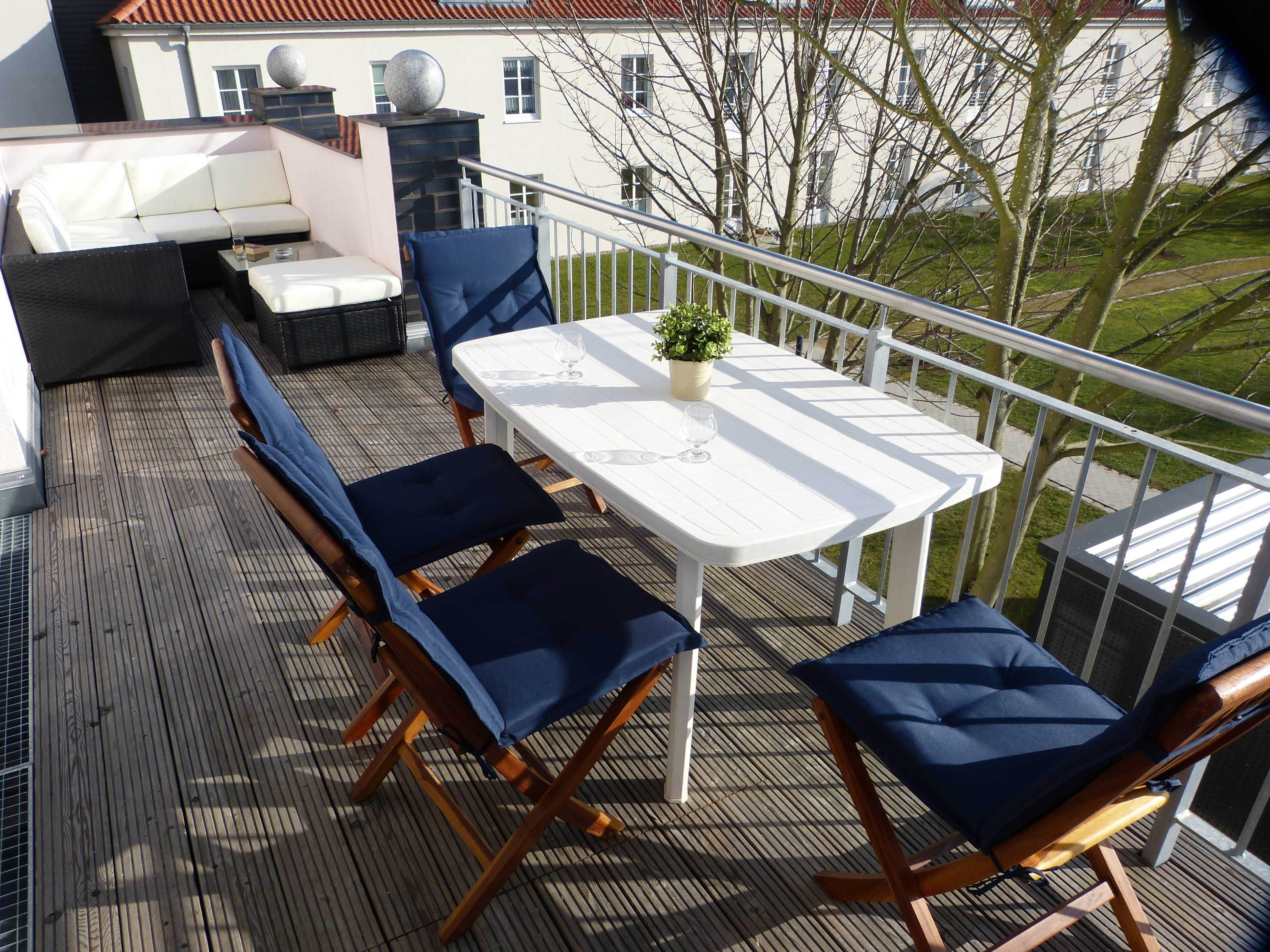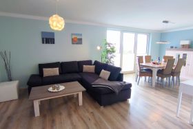 Unsere 93 qm große, gemütliche Ferienwohnung im maritimen Landhausstil mit exklusiver Ausstattung , wie großem LCD Fernseher, WLAN und Blu-ray Player , befindet sich im Dachgeschoss eines Ende 2014 fertiggestelltem Ferienkomplexes mit Fahrstuhl und eigenem Auto Stellplatz direkt neben dem Gebäude. Die Wohnung verfügt über einen großzügigen Wohnbereich mit integrierter exklusiver Küchenzeile sowie einen komfortablen Essplatz. Insgesamt 3 Balkone laden zum Relaxen ein, wobei der Balkon mit kleinem Haffblick (Süden) über eine gemütliche Sitzecke und Essecke verfügt. Sie finden bei uns zwei helle, geräumige Schlafzimmer, die Platz für 2 bis maximal 6 Personen bieten. Ein Schlafzimmer verfügt über ein schönes, komfortables Doppelbett (Boxspringbett). Das andere über ein Etagenbett und ein Einzelbett mit integriertem Rollbett. Unser großzügiges Badezimmer verfügt über eine ebenerdige große Dusche und ein separates WC. Für die kleinen Gäste ist ein Kinderbett, Kinderstuhl und separates Kindergeschirr vorhanden