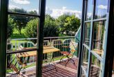 • Zugang zu einem Balkon mit Gartenmöbeln und Sonnenschirm sowie einem weiten Blick über die gepflegte Anlage mit Wiesen und altem Baumbestand