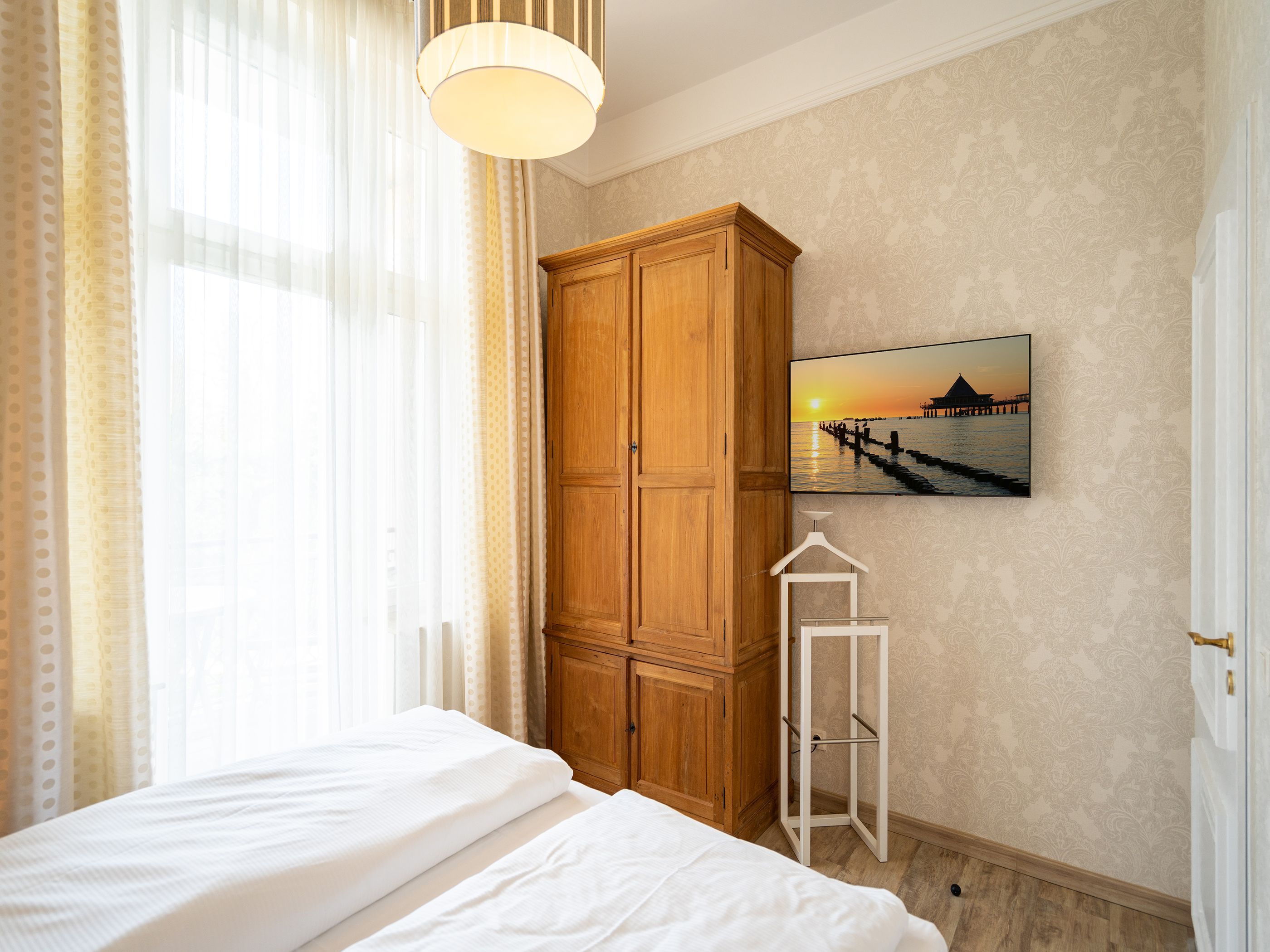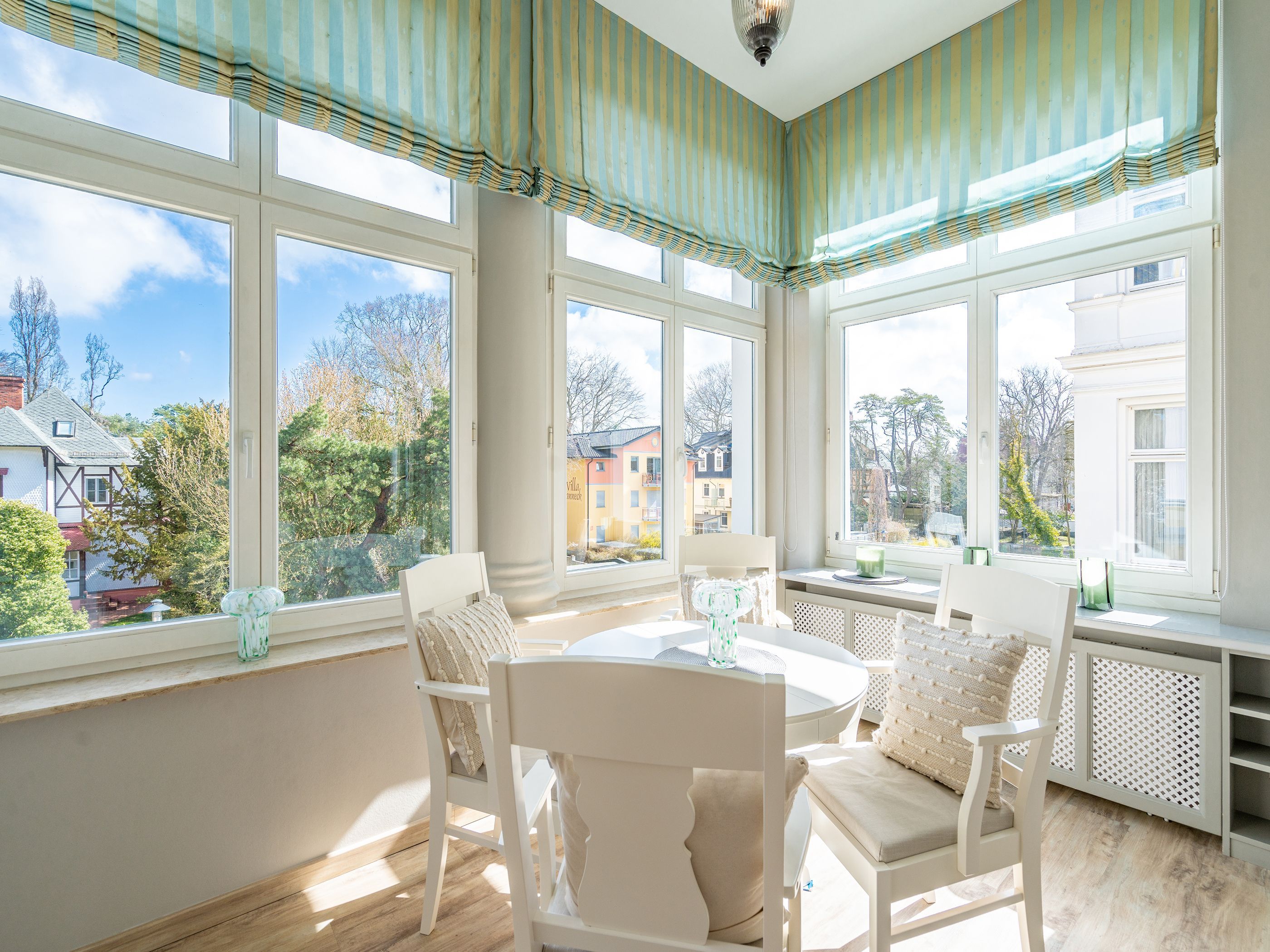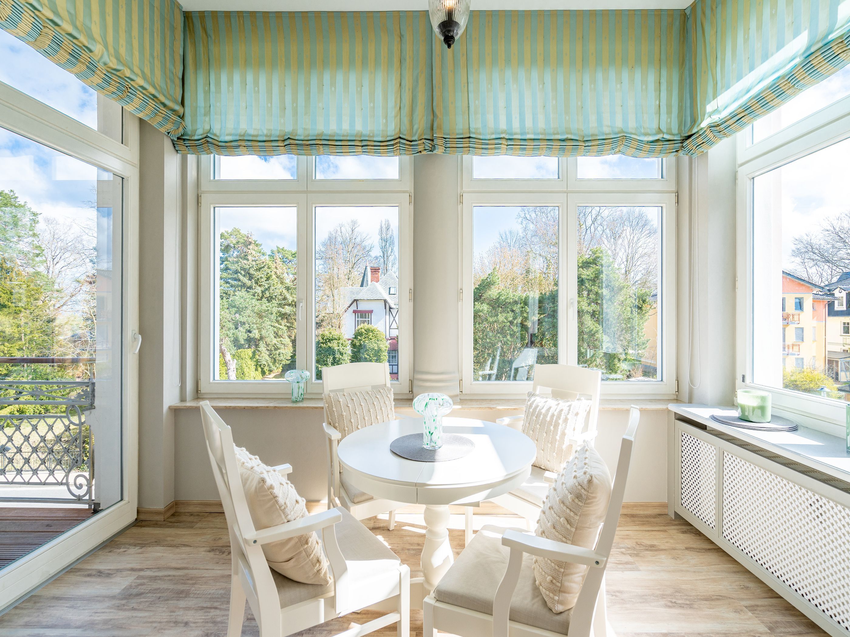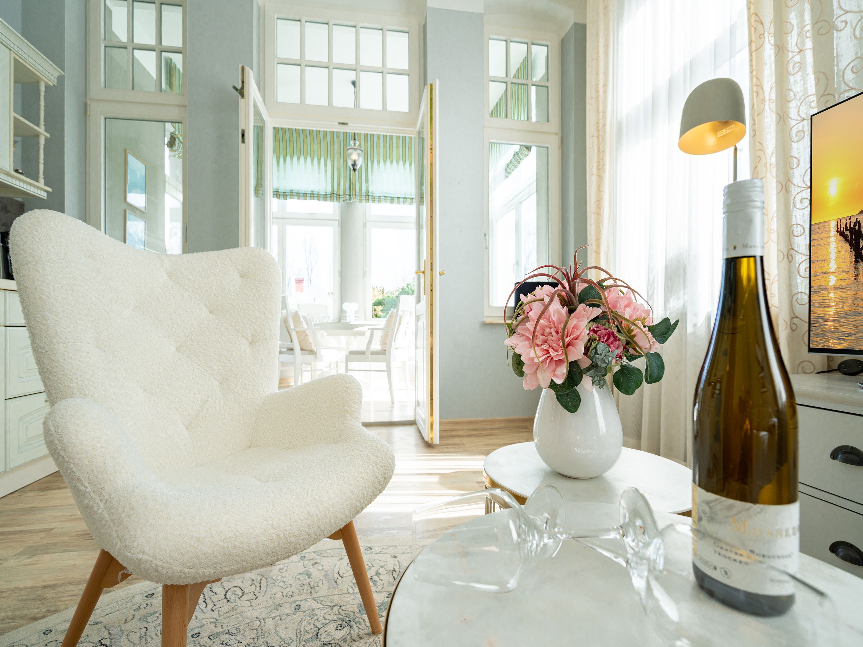Stil, Charme und Komfort! In dieser wunderschönen 2-Raum-Ferienwohnung (53 m²) im 1. Obergeschoss der Villa Aegir, werden Sie entspannte Urlaubstage verbringen. Der helle Wohnbereich mit Couch, Lesesessel und TV wird durch die Landhausküchenzeile ergänzt. Daran schließt sich der schöne Wintergarten mit Essgruppe an, der sicher schnell zu Ihrem Lieblingsplatz in der Wohnung avanciert. Das gemütliche Schlafzimmer mit Doppelbett (1,60 m) verfügt über einen zweiten TV. Für Ihren Komfort sind die Betten bei der Anreise bezogen und Handtücher liegen bereit (Erstausstattung). Auf Wunsch stellen wir für unsere kleinen Gäste ein Kinderreisebett (ohne zusätzliche Matratze & Bettzeug) und einen Kinderhochstuhl ( gegen einen Aufpreis) zur Verfügung. Das Bad ist mit einer Dusche ausgestattet. Der Balkon mit Gartenmöbeln bietet Ausblick auf die schönen Villen in der Nachbarschaft. ( 1 Pkw-Stellplatz am Haus, WLAN-Netz kostenfrei)