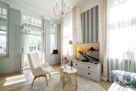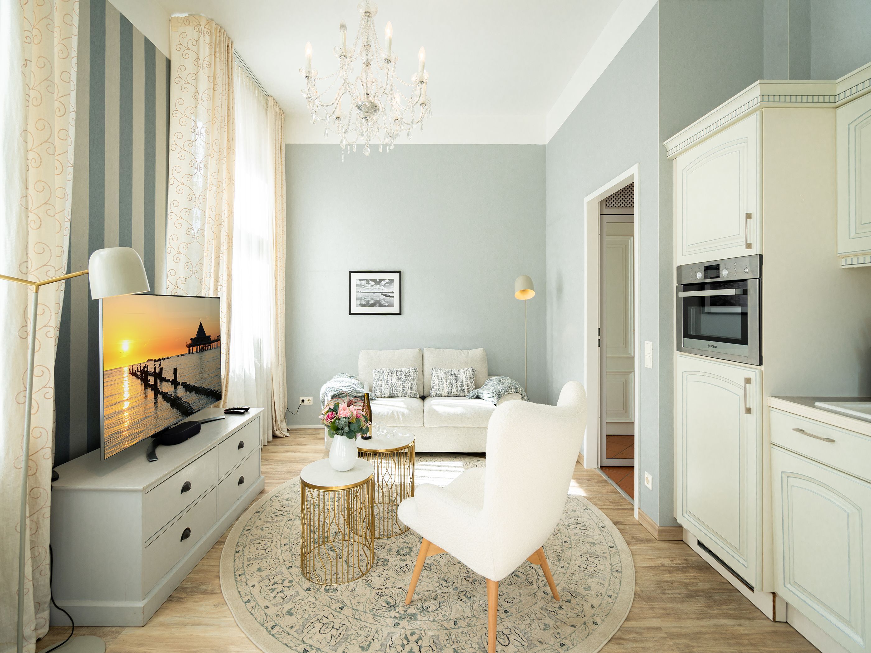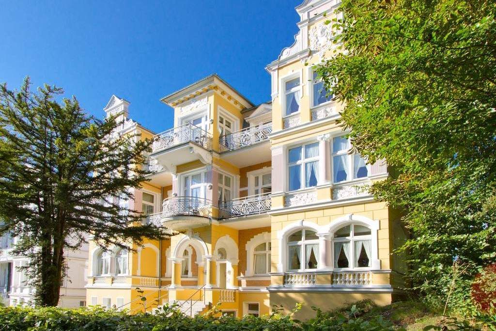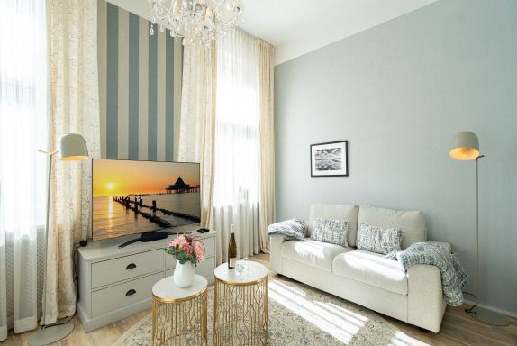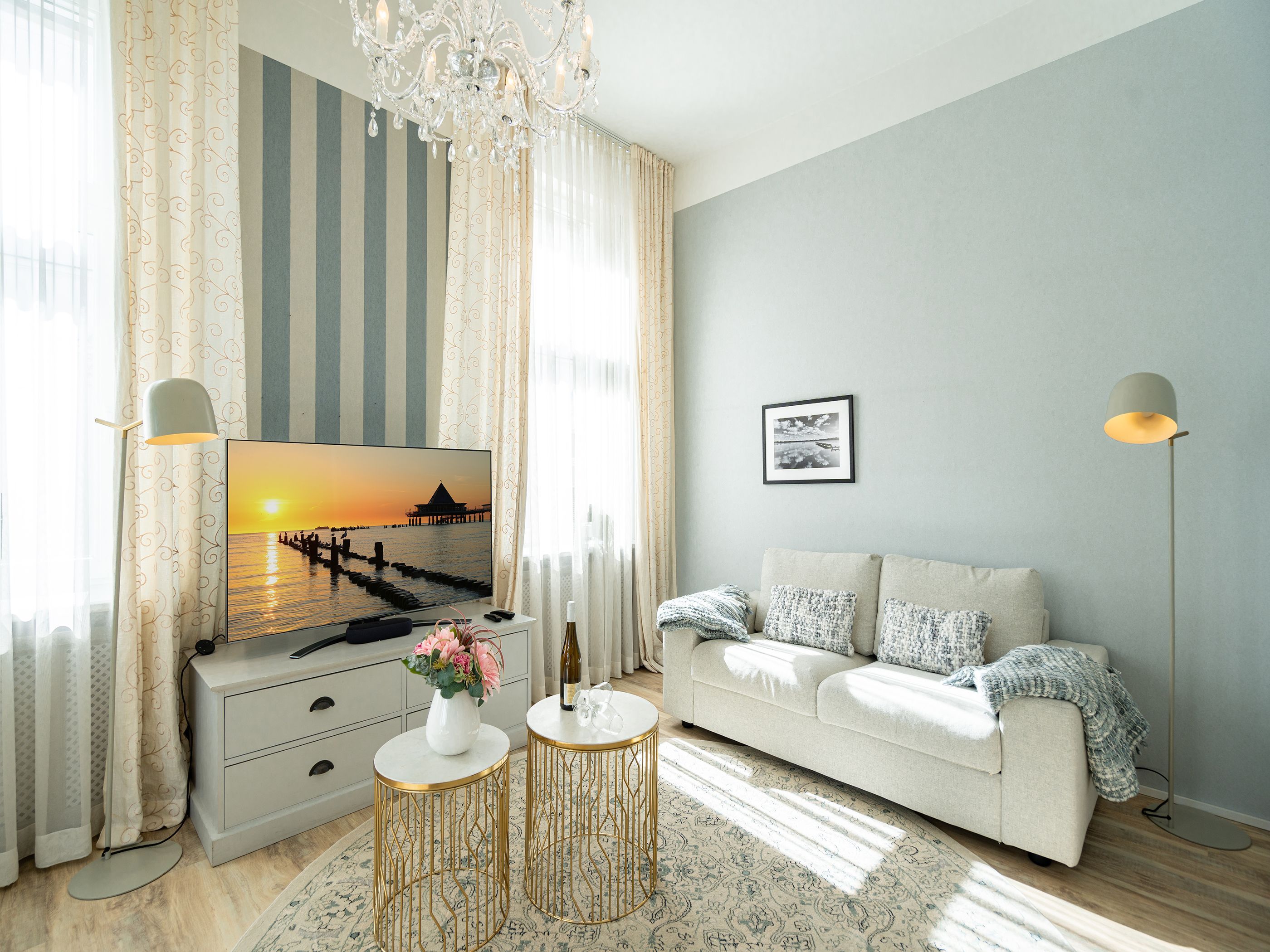 Stil, Charme und Komfort! In dieser wunderschönen 2-Raum-Ferienwohnung (53 m²) im 1. Obergeschoss der Villa Aegir, werden Sie entspannte Urlaubstage verbringen. Der helle Wohnbereich mit Couch, Lesesessel und TV wird durch die Landhausküchenzeile ergänzt. Daran schließt sich der schöne Wintergarten mit Essgruppe an, der sicher schnell zu Ihrem Lieblingsplatz in der Wohnung avanciert. Das gemütliche Schlafzimmer mit Doppelbett (1,60 m) verfügt über einen zweiten TV. Für Ihren Komfort sind die Betten bei der Anreise bezogen und Handtücher liegen bereit (Erstausstattung). Auf Wunsch stellen wir für unsere kleinen Gäste ein Kinderreisebett (ohne zusätzliche Matratze & Bettzeug) und einen Kinderhochstuhl ( gegen einen Aufpreis) zur Verfügung. Das Bad ist mit einer Dusche ausgestattet. Der Balkon mit Gartenmöbeln bietet Ausblick auf die schönen Villen in der Nachbarschaft. ( 1 Pkw-Stellplatz am Haus, WLAN-Netz kostenfrei)