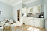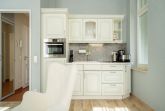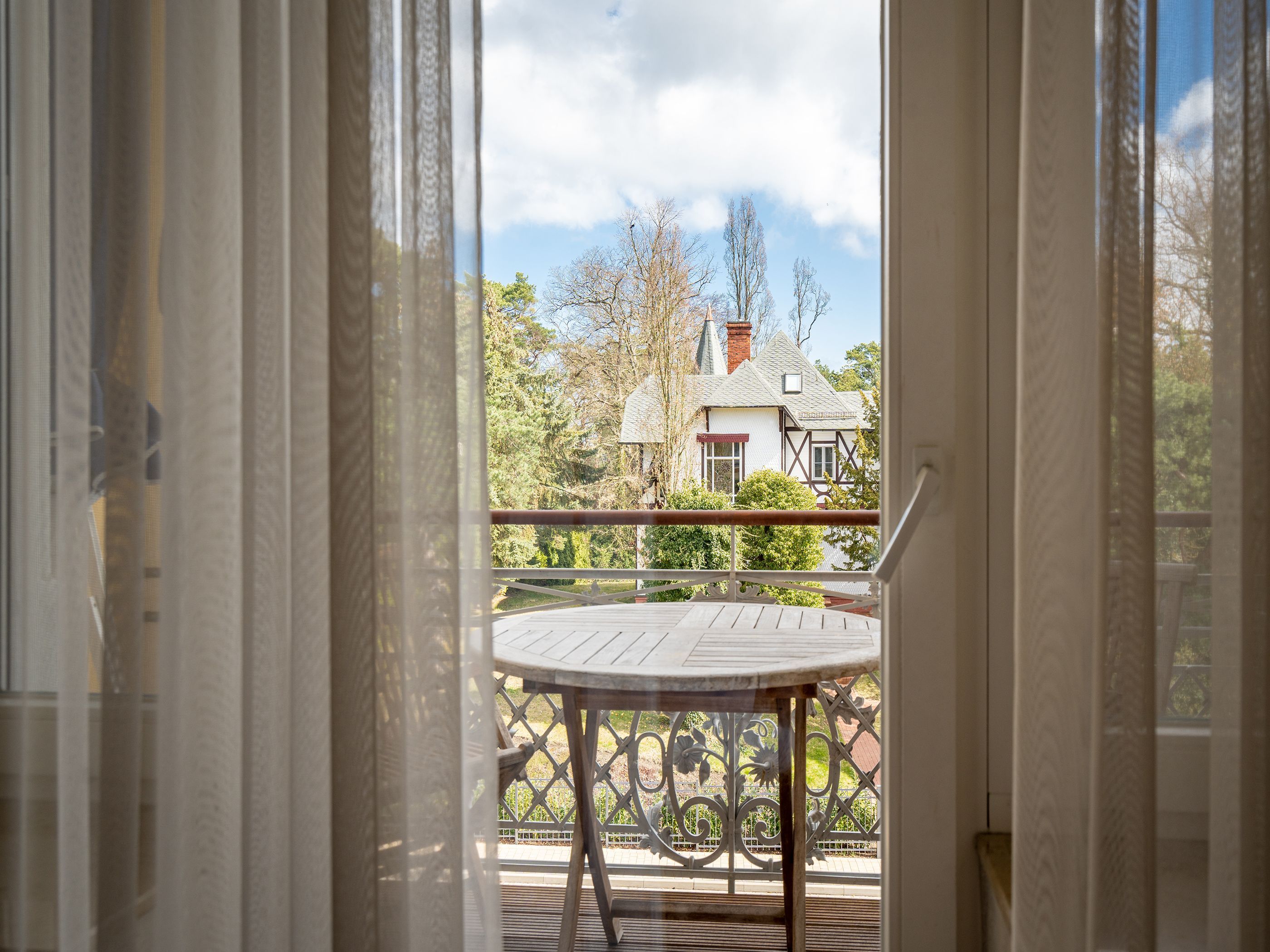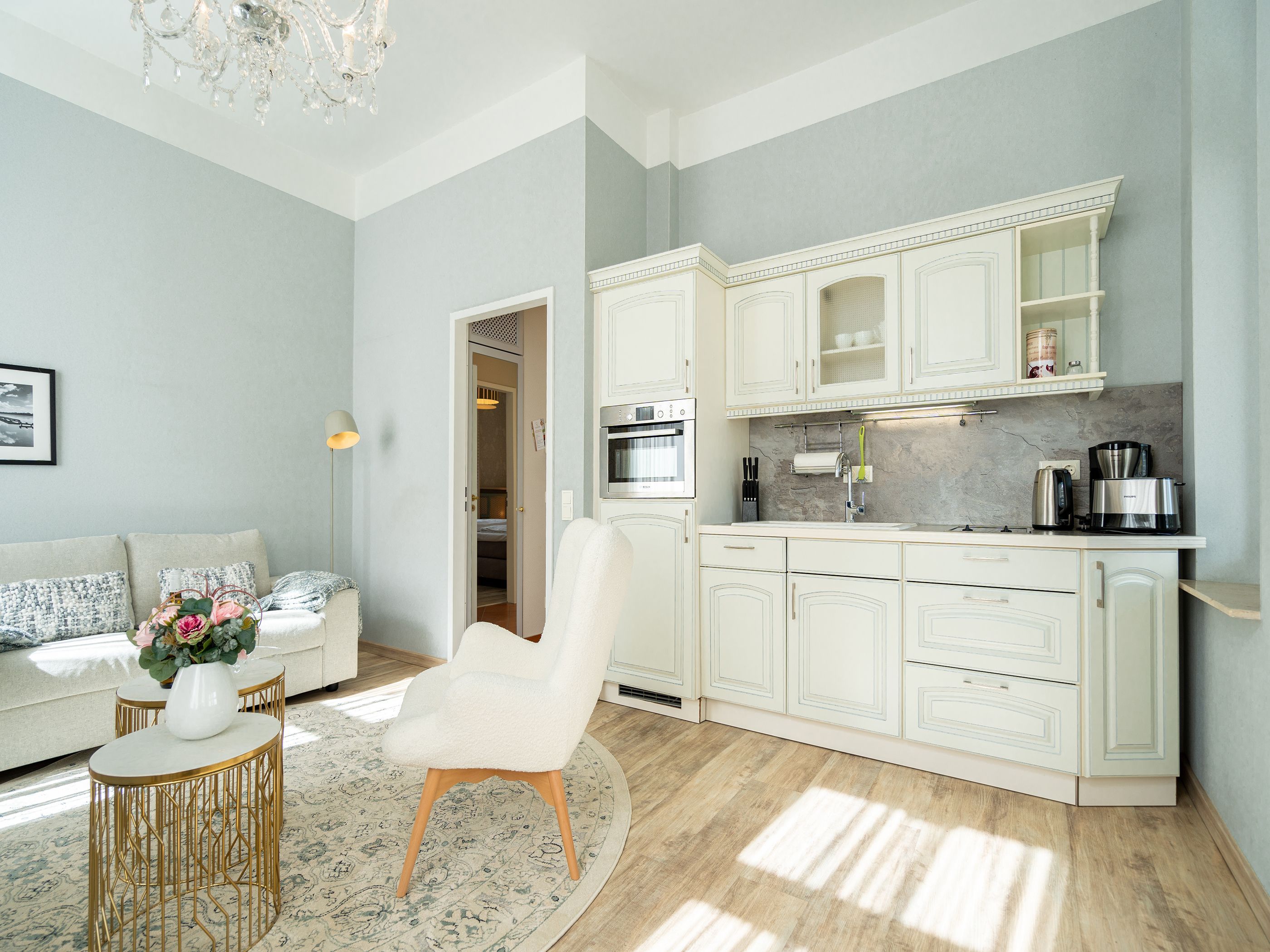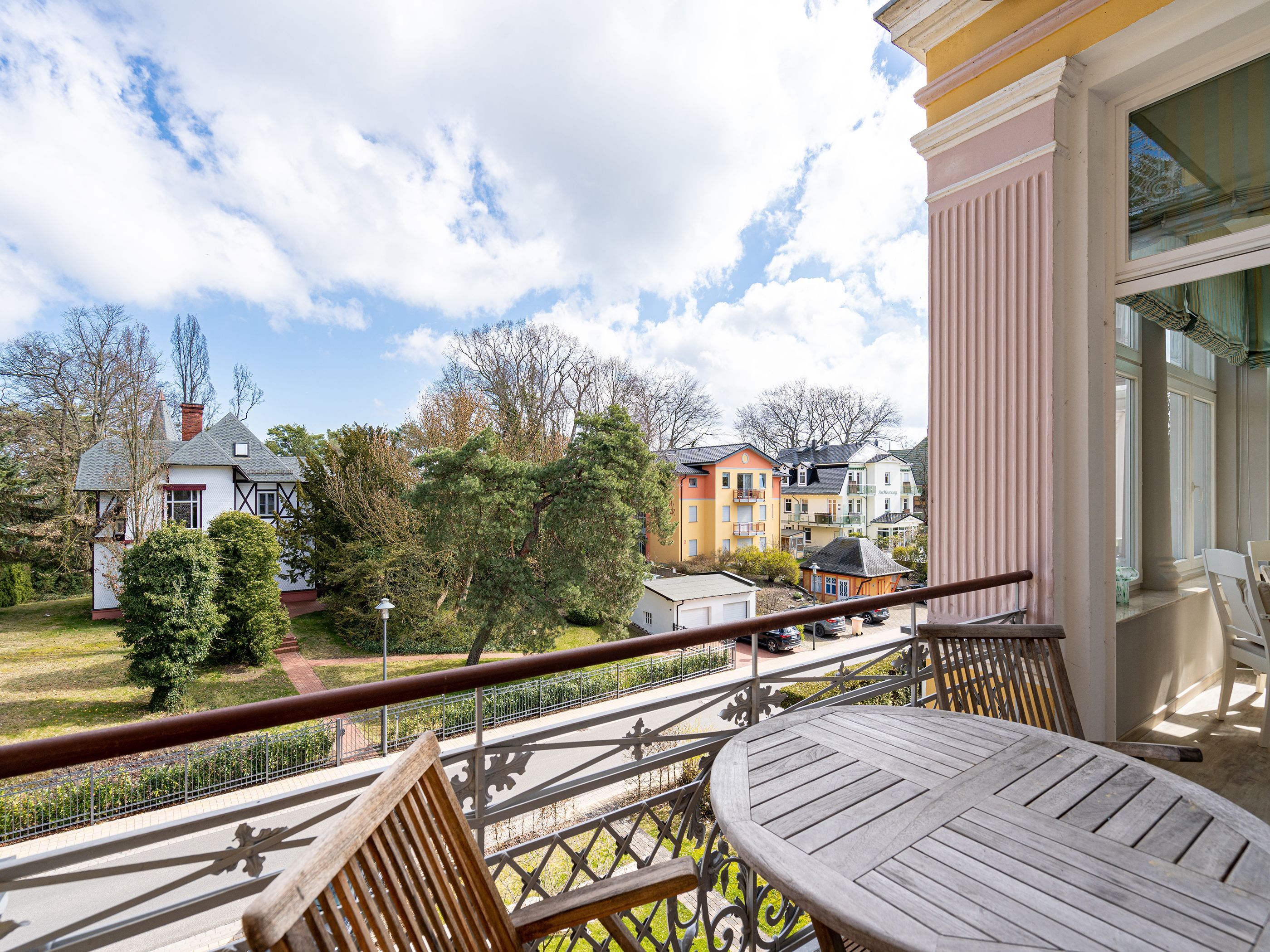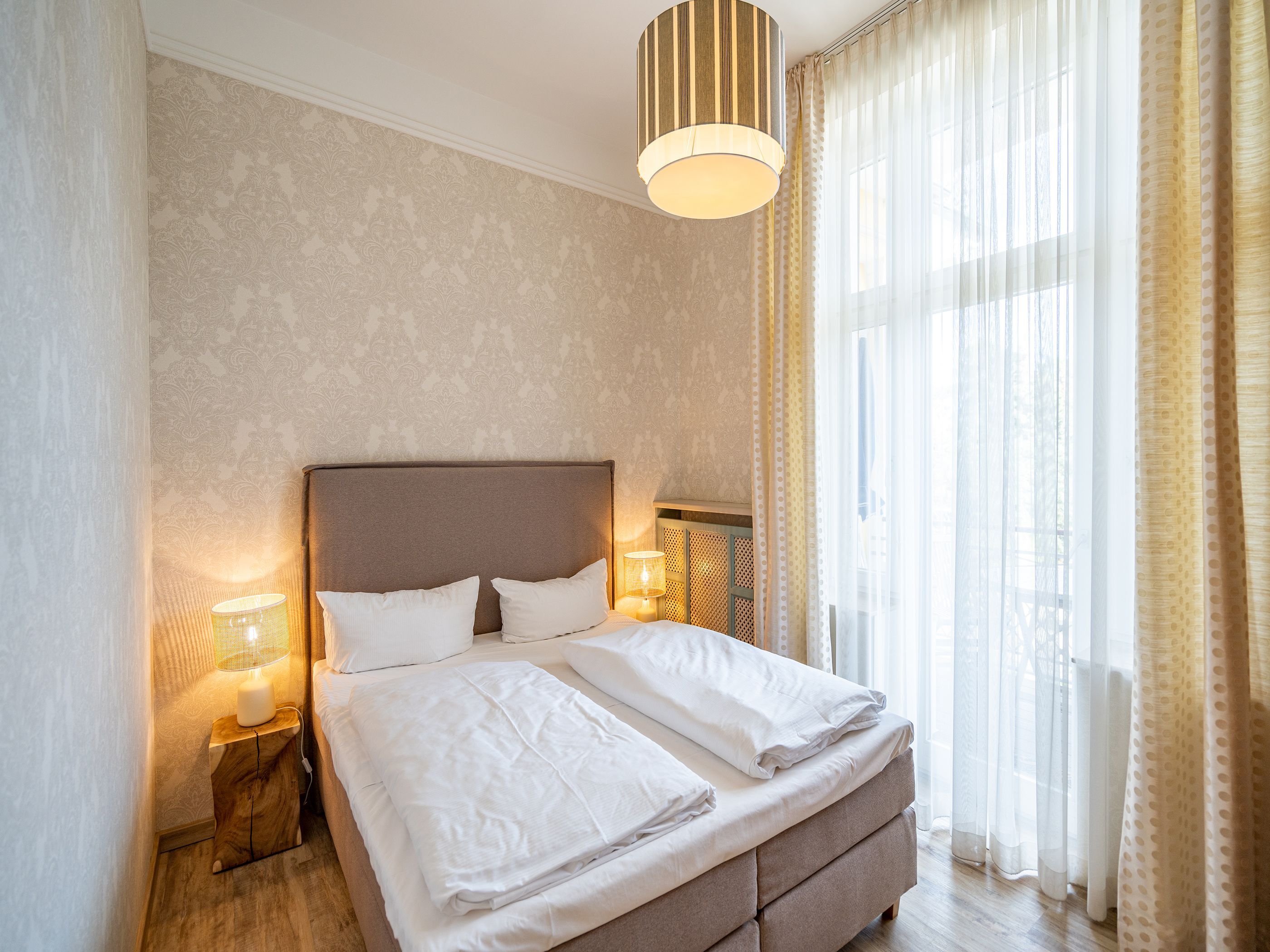 Stil, Charme und Komfort! In dieser wunderschönen 2-Raum-Ferienwohnung (53 m²) im 1. Obergeschoss der Villa Aegir, werden Sie entspannte Urlaubstage verbringen. Der helle Wohnbereich mit Couch, Lesesessel und TV wird durch die Landhausküchenzeile ergänzt. Daran schließt sich der schöne Wintergarten mit Essgruppe an, der sicher schnell zu Ihrem Lieblingsplatz in der Wohnung avanciert. Das gemütliche Schlafzimmer mit Doppelbett (1,60 m) verfügt über einen zweiten TV. Für Ihren Komfort sind die Betten bei der Anreise bezogen und Handtücher liegen bereit (Erstausstattung). Auf Wunsch stellen wir für unsere kleinen Gäste ein Kinderreisebett (ohne zusätzliche Matratze & Bettzeug) und einen Kinderhochstuhl ( gegen einen Aufpreis) zur Verfügung. Das Bad ist mit einer Dusche ausgestattet. Der Balkon mit Gartenmöbeln bietet Ausblick auf die schönen Villen in der Nachbarschaft. ( 1 Pkw-Stellplatz am Haus, WLAN-Netz kostenfrei)