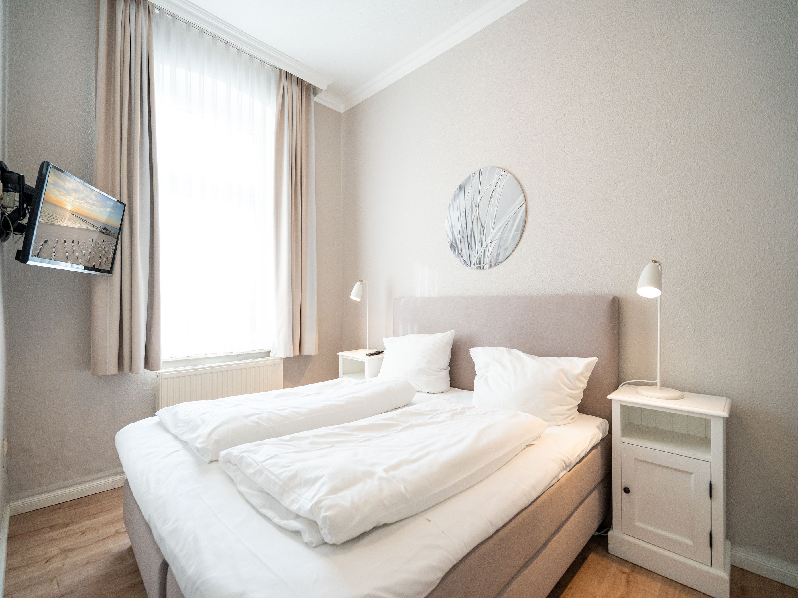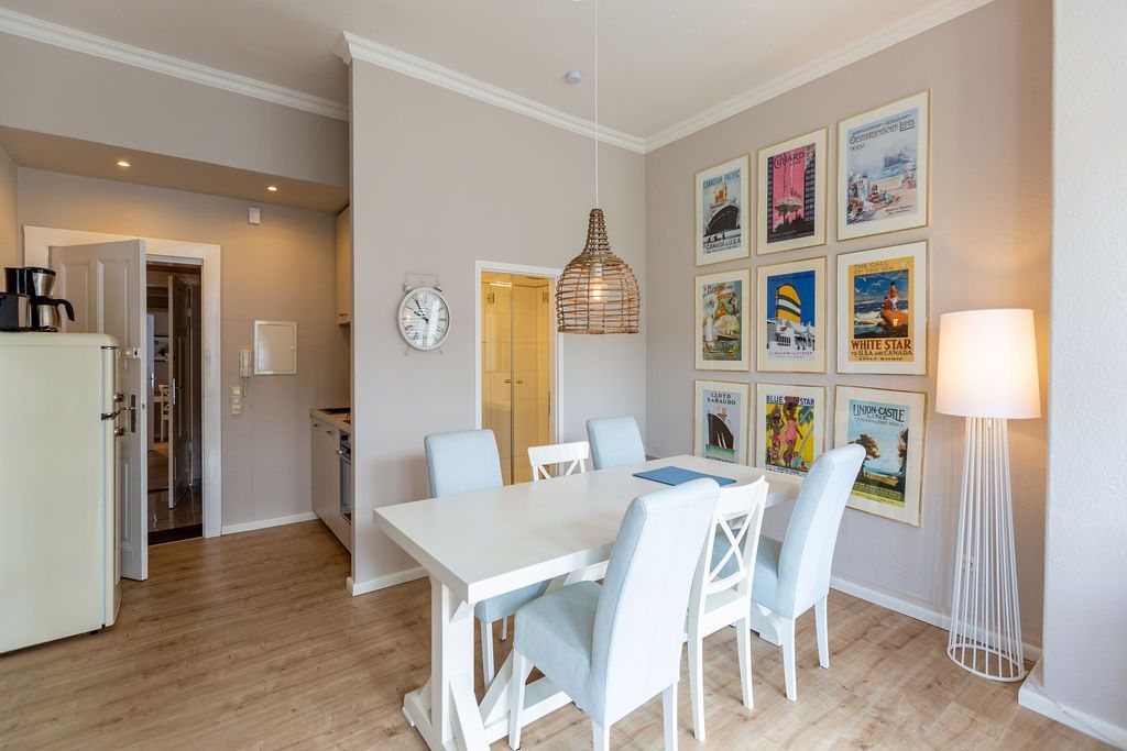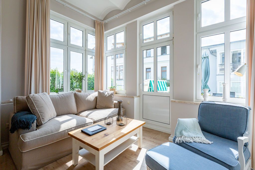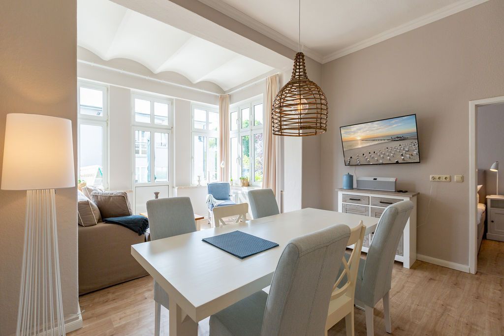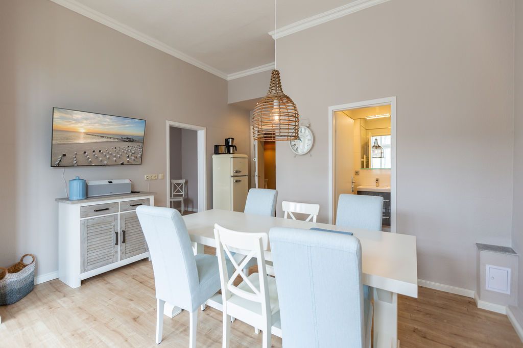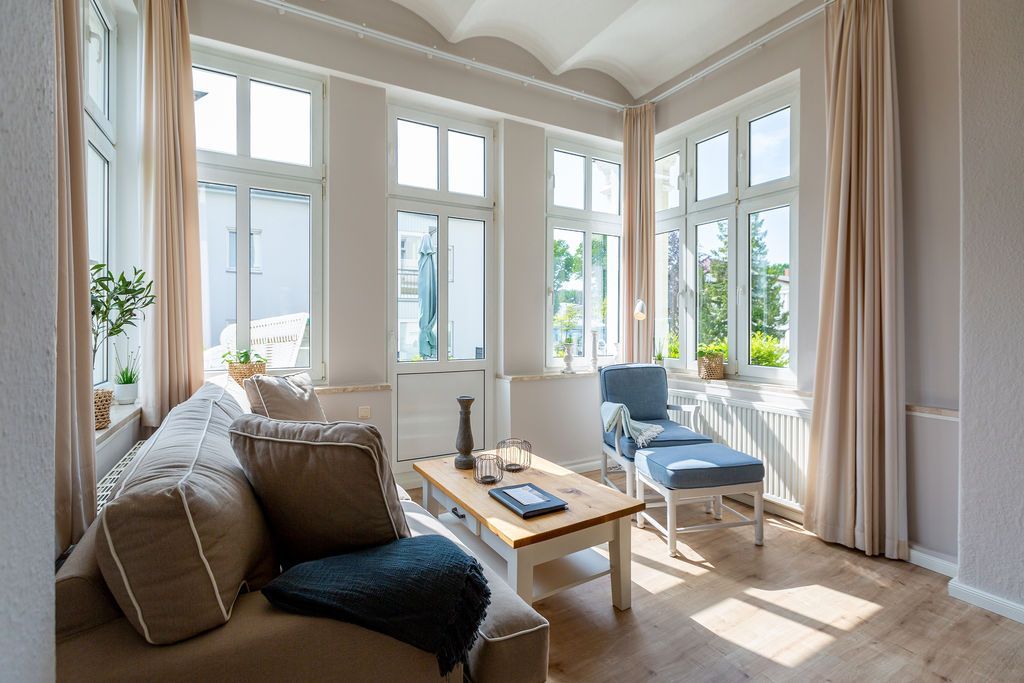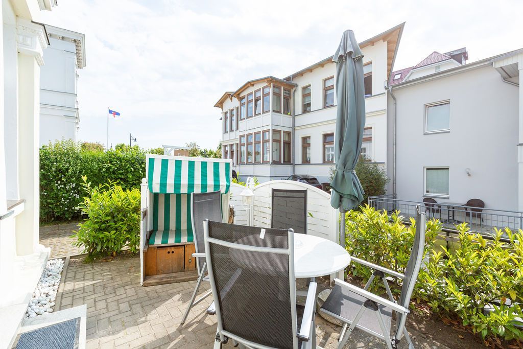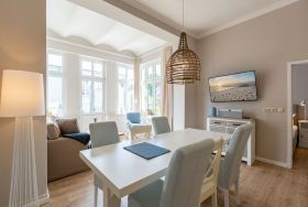 Drei Schlafzimmer, zwei Bäder, ein großes Wohn-Esszimmer mit offener Küche, eine große Terrasse, ein kleiner Balkon und die Ostsee nur wenige Meter vor der Haustür: das alles macht die Wohnung 2 im Erdgeschoss der Villa Albertine zu einem idealen Ort zum Urlauben mit Freunden oder der ganzen Familie. Denn auf den 80 Quadratmetern haben bis zu sechs Personen reichlich Platz für eine wunderschöne Ostseezeit. Hell und modern eingerichtet, sind Hektik und Stress hier schnell vergessen. In der lichtdurchfluteten Veranda lässt es sich auf dem Sofa im Landhausstil oder dem Chaiselongue herrlich vor dem großen Flat-TV entspannen. Der offene Wohn-Ess-Bereich ist mit einem großen Tisch ausgestattet, der Platz für bis zu 6 Personen bietet. Ihre Speisen können Sie in der Kochecke zubereiten. Ceranfeld, Backofen, Spülmaschine, Kühlschrank mit Gefrierfach sowie Kleinküchengeräte runden diesen Platz ab. Wenn das Wetter mitspielt, ist die Sonnenterrasse ein absoluter Lieblingsort. Hier können Sie vom Frühjahr bis in den Herbst auch draußen auf den Gartenmöbeln und dem obligatorischen Ostseestrandkorb sitzen und essen oder einfach nur die Sonne und die frische Ostseebrise genießen, die vom nur ein paar Meter entfernten Strand herüberweht. In den drei Schlafzimmern finden Sie komfortable Boxspringdoppelbetten (einmal 1,80 m x 2,00 m und zweimal 1,80 m x 1,90 m), die zum Schlafen und Kuscheln bestens geeignet sind. Ihre Urlaubsgarderobe können Sie bequem in einem der beiden Kleiderschränke in zwei Schlafzimmern verstauen. Das dritte Schlafzimmer verfügt über einen kleinen Abstellraum mit Kleiderschrank. Hier befindet sich auch der Durchgang zu einem kleinen Balkon nach hinten raus. Im Ferienappartement Nummer 2 gibt es zwei Bäder, die jeweils mit Dusche, Waschtisch und WC ausgestattet sind. Für die perfekte Urlaubsauszeit sind die Betten bei Ihrer Anreise bereits bezogen und Handtücher liegen bereit. Zum Appartement gehört ein Pkw-Stellplatz, der Platz für bis zu zwei Autos bietet.