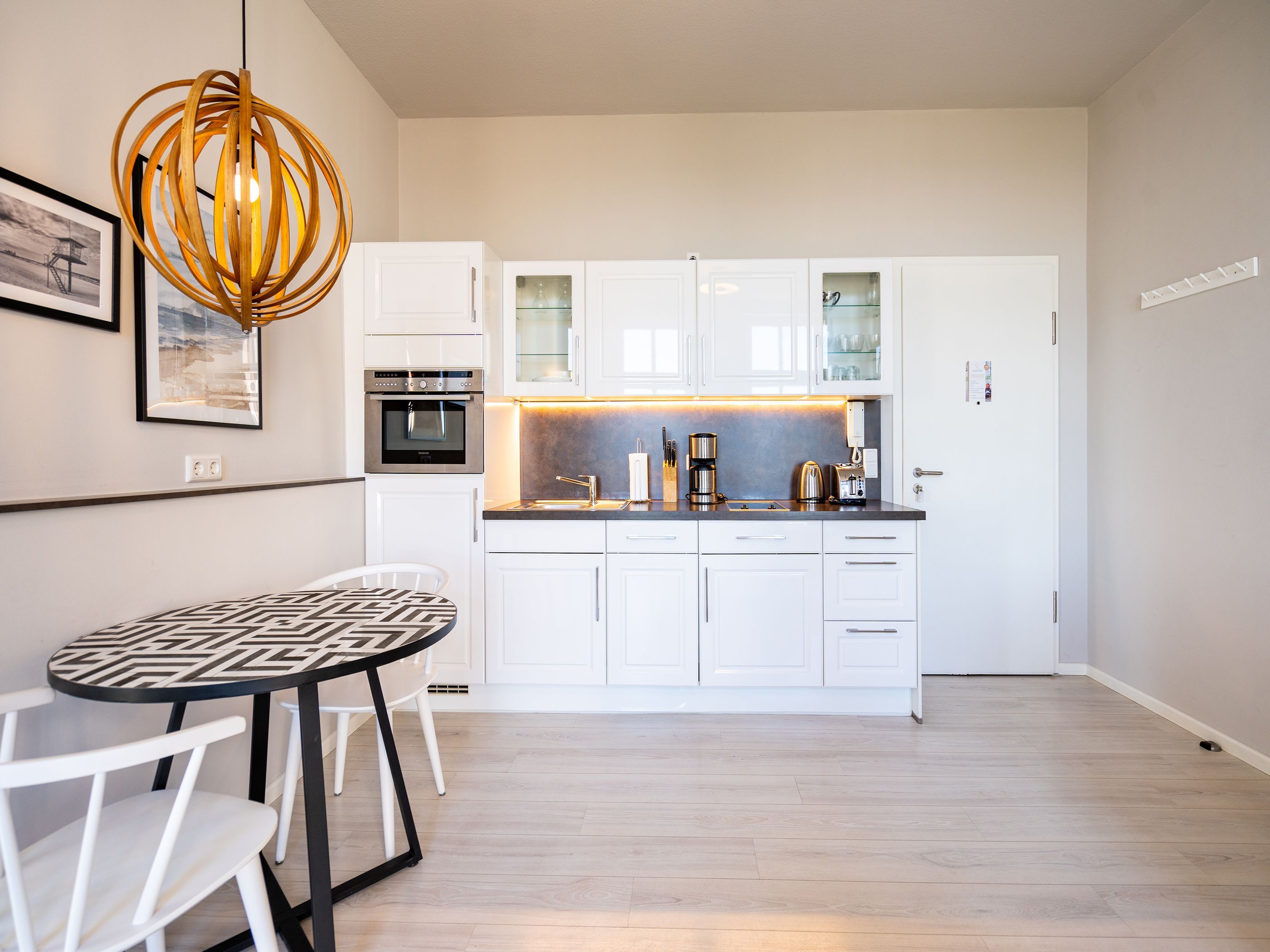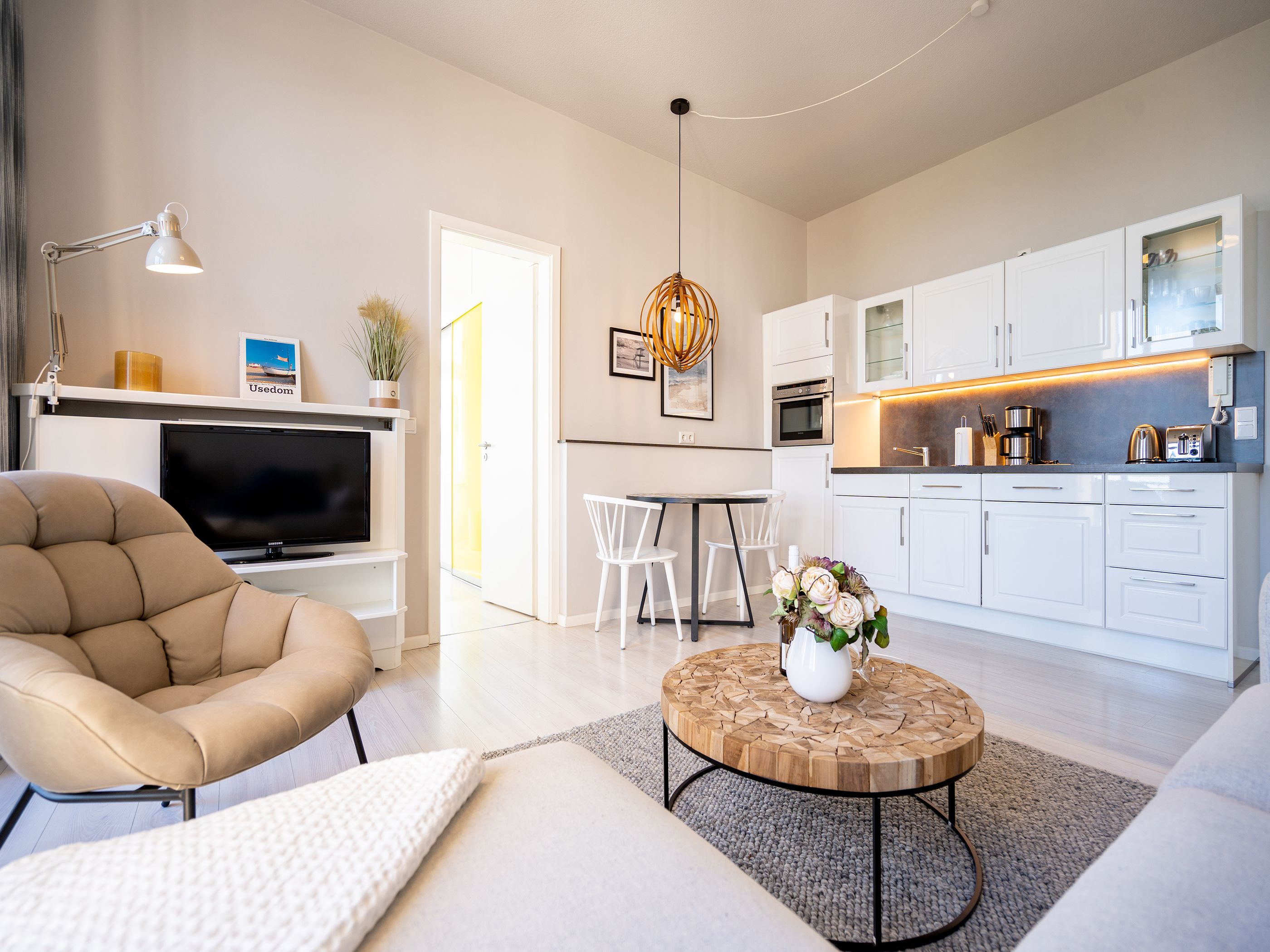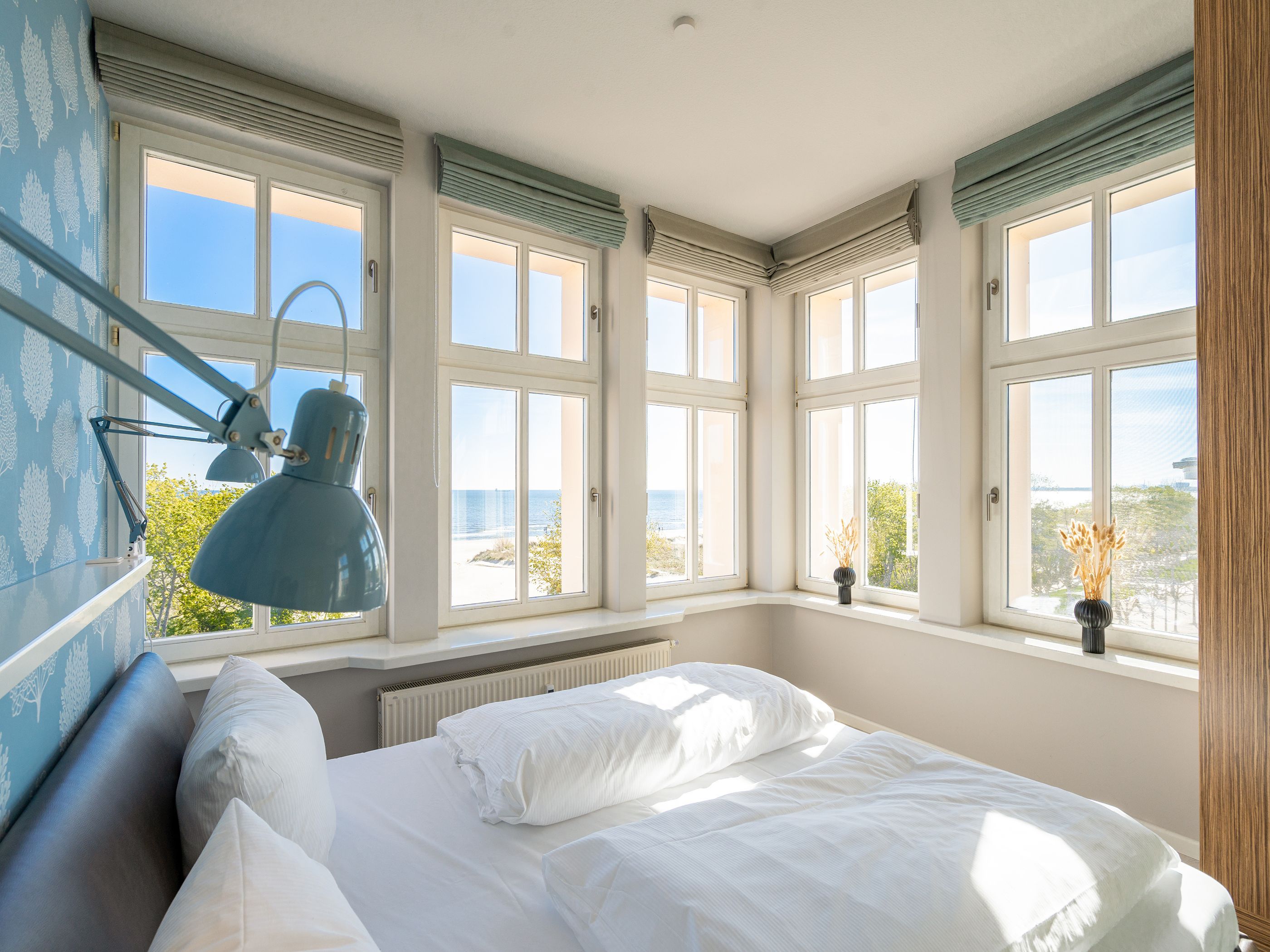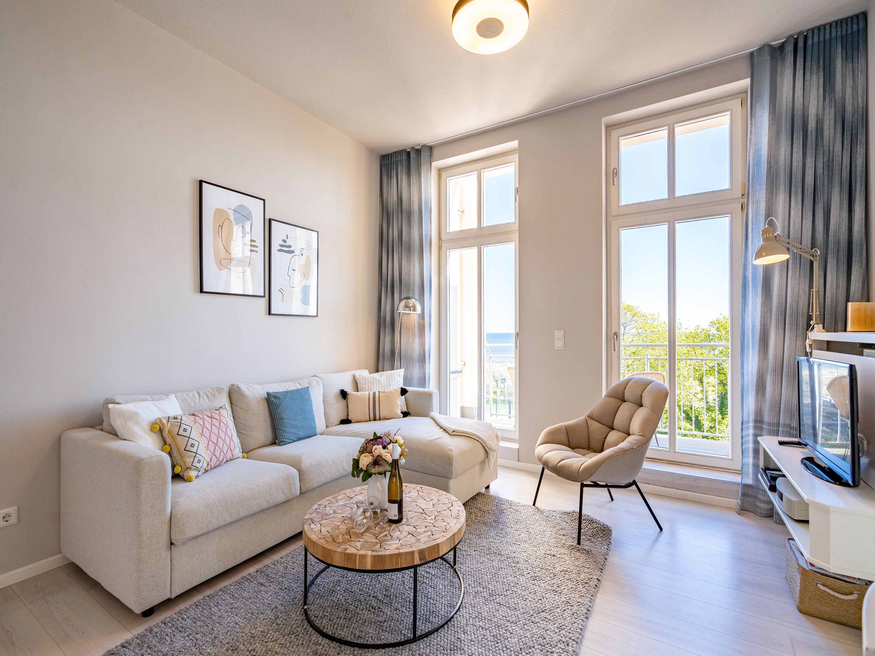 Willkommen an der Ostsee! In der Ferienwohnung 11 im 2. Obergeschoss der Villa Anna erwartet Sie jede Menge Ausblick auf´s Meer. Und nicht nur das! Eine stilsichere, neue Einrichtung, geschmackvolle Farben und Stoffe arrangiert auf gemütlichen 45 qm Wohnfläche bieten perfektes Urlaubsziel für 2 Personen und 1 Baby. Dem modernen Wohnbereich mit Meerblick sind die komplett ausgestattete Küchenzeile und ein schöner Essplatz angeschlossen. Das Schlafzimmer ist ein Traum, vom erhöhten Bett ( 1,80m x 2m) genießt man den freien Blick auf die Ostsee, die Swinemünder Bucht und die Ahlbecker Promenade. Wer will, kann natürlich auch dem Smart-TV Aufmerksamkeit schenken. Der Zugang zum Bad mit Badewanne und Dusche versteckt sich hinter den Einbauten des Schlafzimmers. Auch vom Balkon hat man einen wunderschönen Ausblick auf die Ostsee. Für Ihren Komfort sind die Betten bei der Anreise bezogen und Handtücher liegen bereit (Erstausstattung). Auf Wunsch stellen wir für unsere kleinen Gäste ein Kinderreisebett (ohne zusätzliche Matratze & Bettzeug) und einen Kinderhochstuhl ( gegen einen Aufpreis) zur Verfügung. Ein Pkw-Stellplatz in der Doppelparkgarage ( max. Einfahrthöhe 1,50 m / Breite: 1,90m / max. Länge 5m / 2000 kg ) steht am Haus zur Verfügung. Das WLAN-Netz im Haus ist kostenfrei nutzbar.