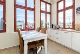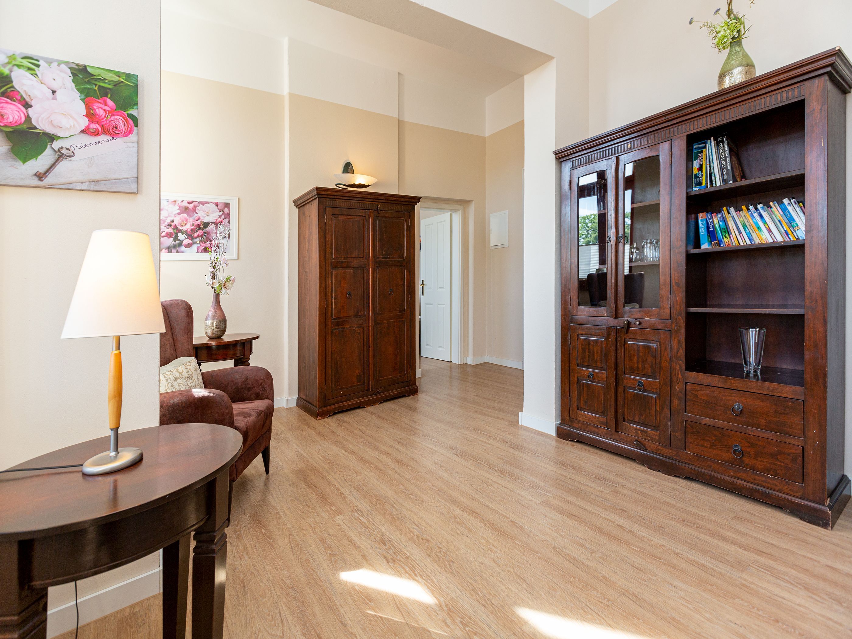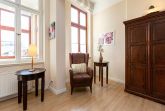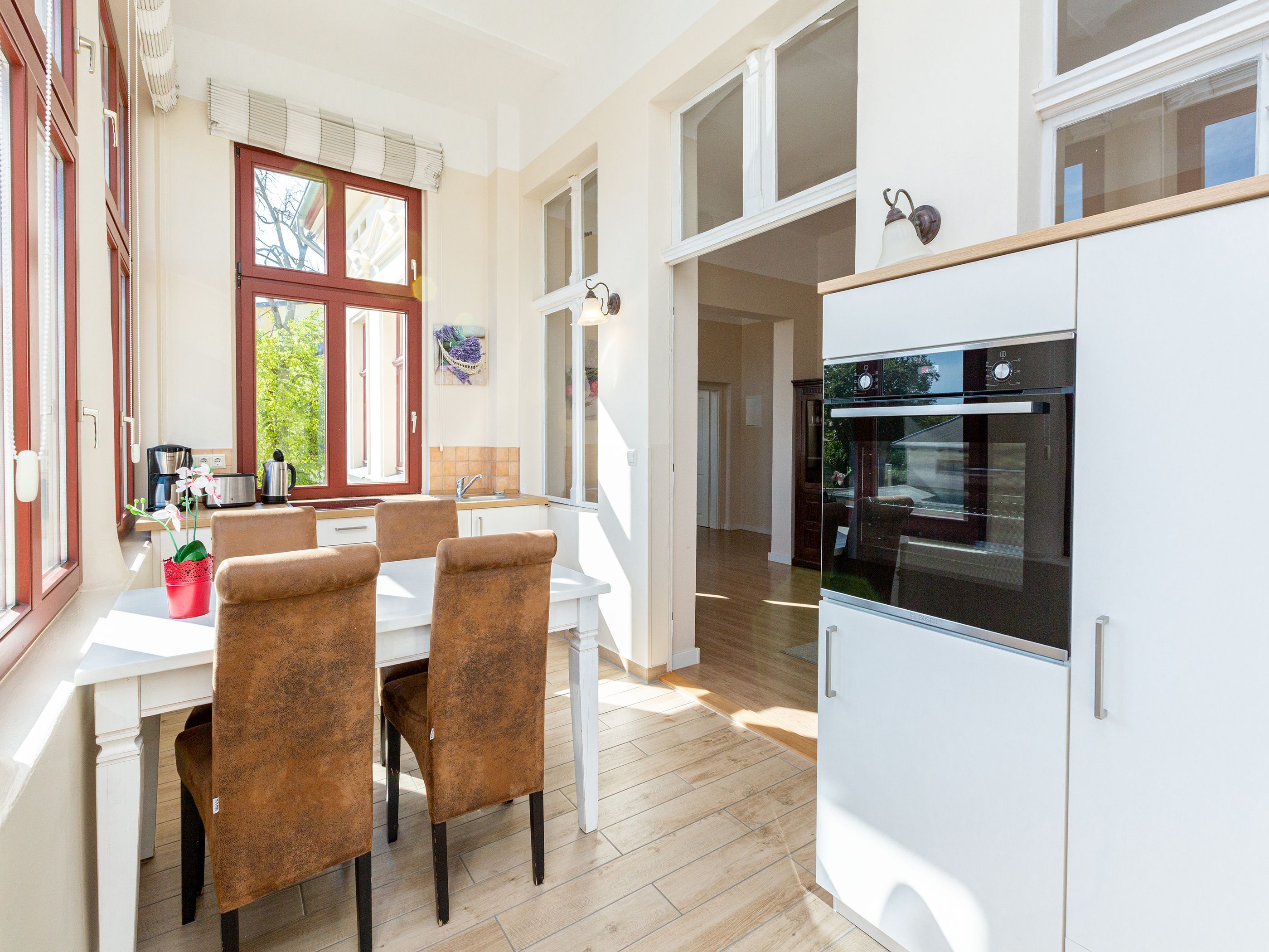 Die 3-Raum-Ferienwohnung im 1. Obergeschoss bietet auf 65 qm Platz für bis zu 4 Personen. Das Wohnzimmer ist mit einer gemütlichen Sitzgruppe und einem Fernseher ausgestattet. Angrenzend befindet sich ein Wintergarten mit Essplatz und integrierter Küchenzeile. Die Wohnung verfügt über zwei Schlafzimmer. Schlafen Sie im Doppelbett (sehr eng) oder in einem der Einzelbetten im zweiten Schlafraum. Das Badezimmer ist mit Dusche, Waschtisch und WC ausgestattet. Für Ihren Komfort sind die Betten bei Ihrer Anreise bereits bezogen und Handtücher liegen als Erstausstattung für Sie bereit. WLAN-Netz ist kostenfrei nutzbar. Ein PKW-Stellplatz steht Ihnen direkt am Haus zur Verfügung.