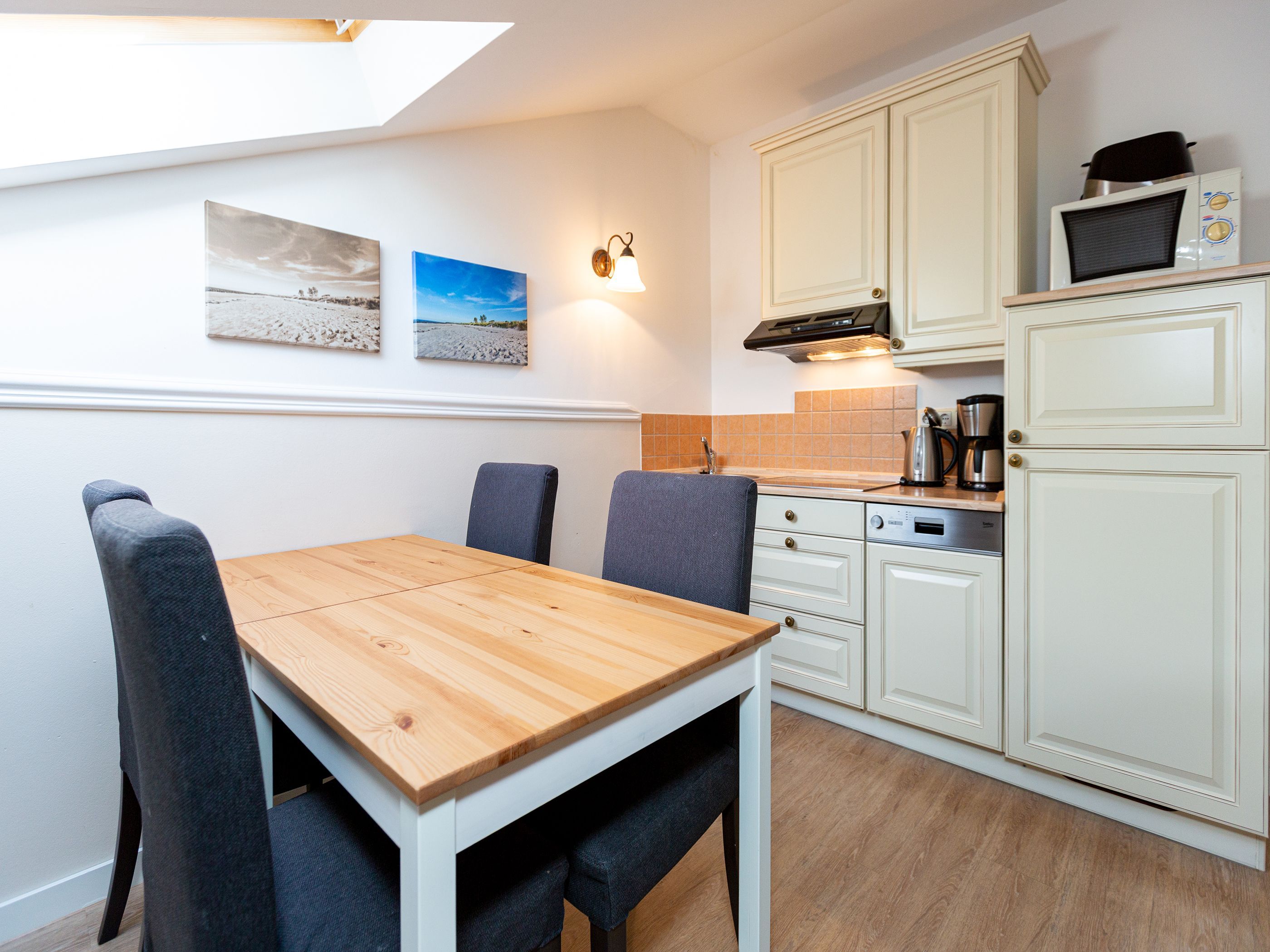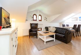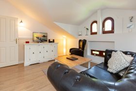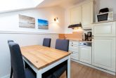 Das Appartement 07 ist eine gemütliche 2-Raum-Ferienwohnung im Dachgeschoss, die sich perfekt für 2 Personen und ein Kleinkind bis 3 Jahre eignet. Die Wohnung erstreckt sich über 40 qm. Im Wohnbereich bietet eine bequeme Sitzgruppe ausreichend Platz, um vor dem Fernseher den Tag ausklingen zu lassen. In der gegenüberliegenden Küchenzeile mit angrenzendem Essplatz lassen sich Ihre Mahlzeiten gemeinsam zubereiten und einnehmen. Auf erholsamen Schlaf müssen Sie dank Doppelbett im Schlafzimmer nicht verzichten. Ein Duschbad mit Waschtisch und WC runden dieses Appartement ab. WLAN steht Ihnen ebenso kostenfrei zur Verfügung wie der PKW-Stellplatz, der sich direkt am Haus befindet. Für unsere kleinen Gäste stellen wir gerne ein Kinderreisebett zur Verfügung, das jedoch keine zusätzliche Matratze oder Bettzeug beinhaltet. Auf Wunsch können wir Ihnen auch einen Kinderhochstuhl gegen Aufpreis zur Verfügung stellen. Damit Sie sich bei Ihrer Ankunft direkt wohlfühlen, sind die Betten bereits bezogen und Handtücher liegen als Erstausstattung bereit.