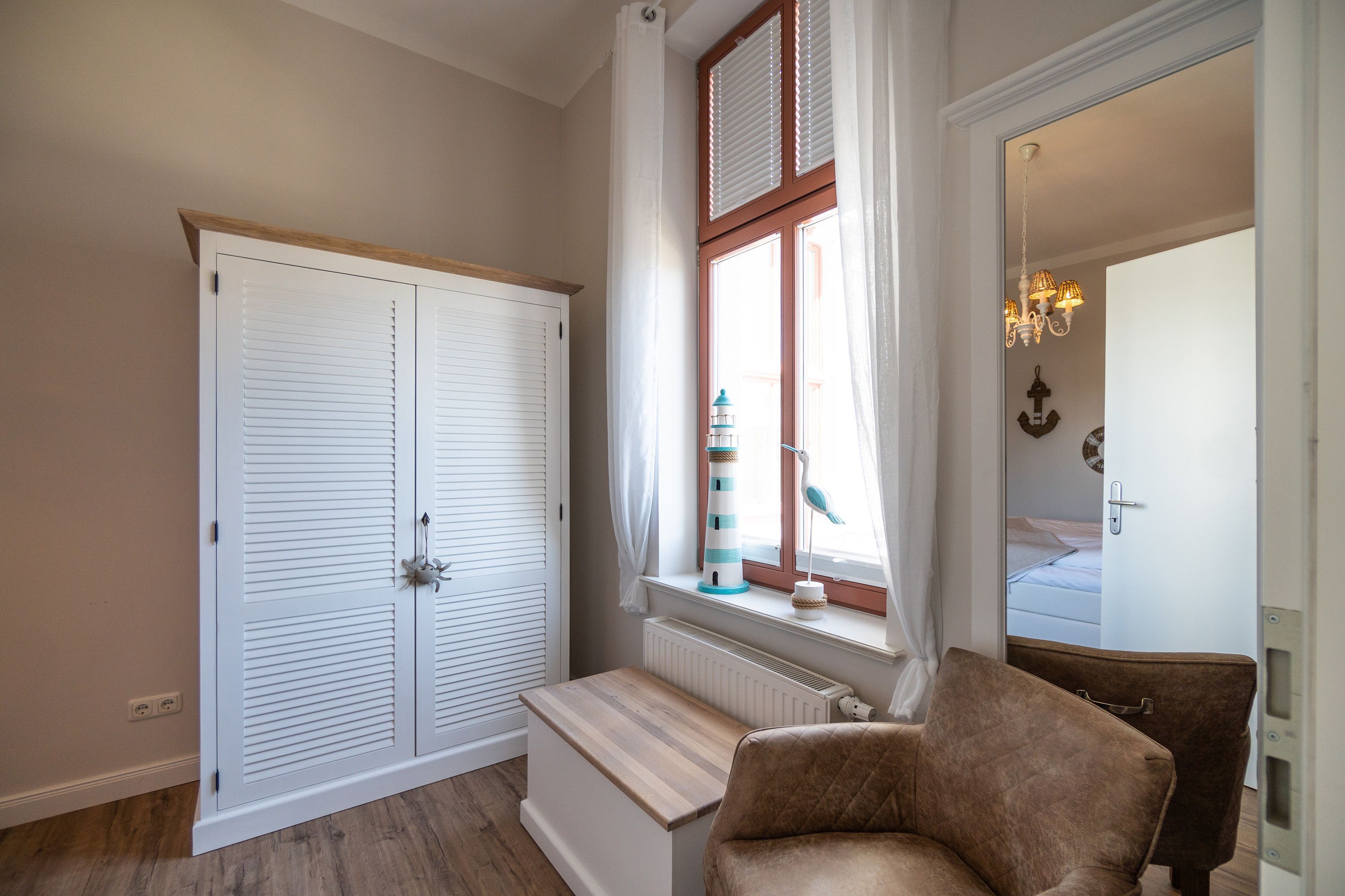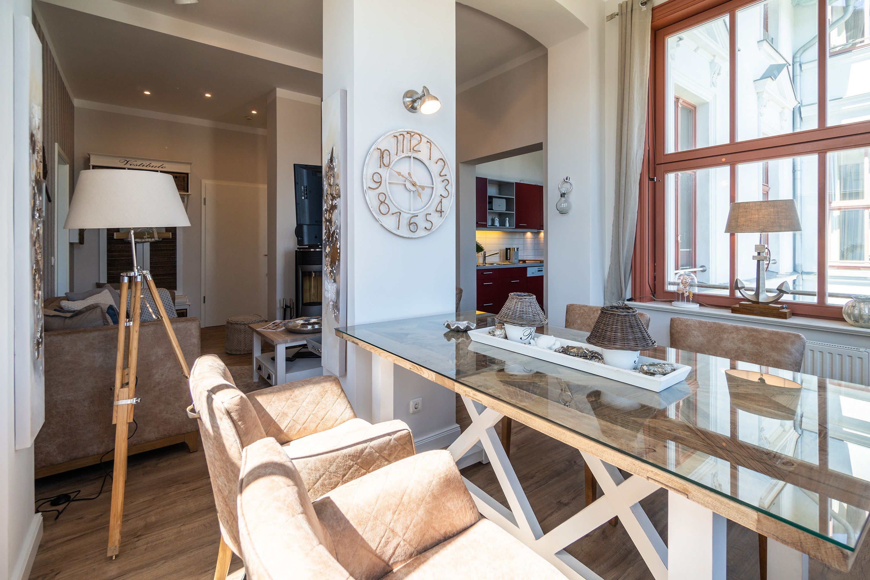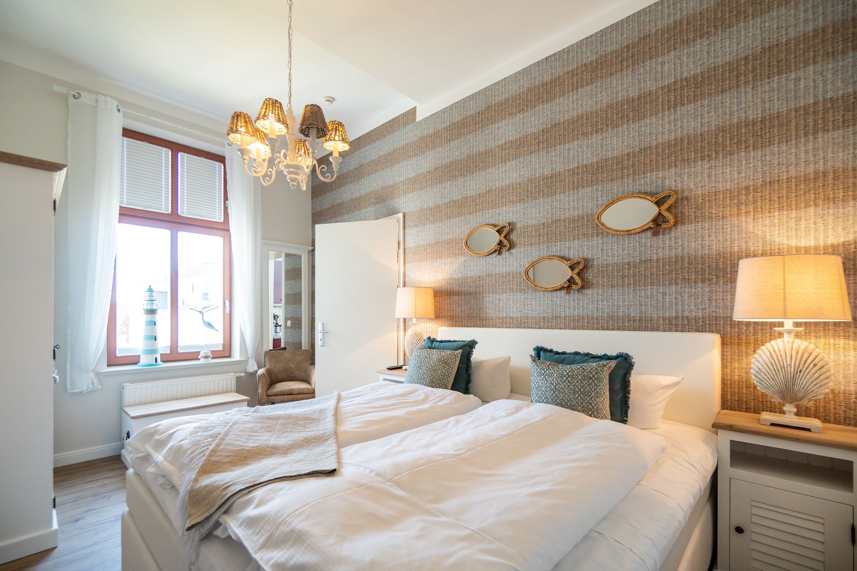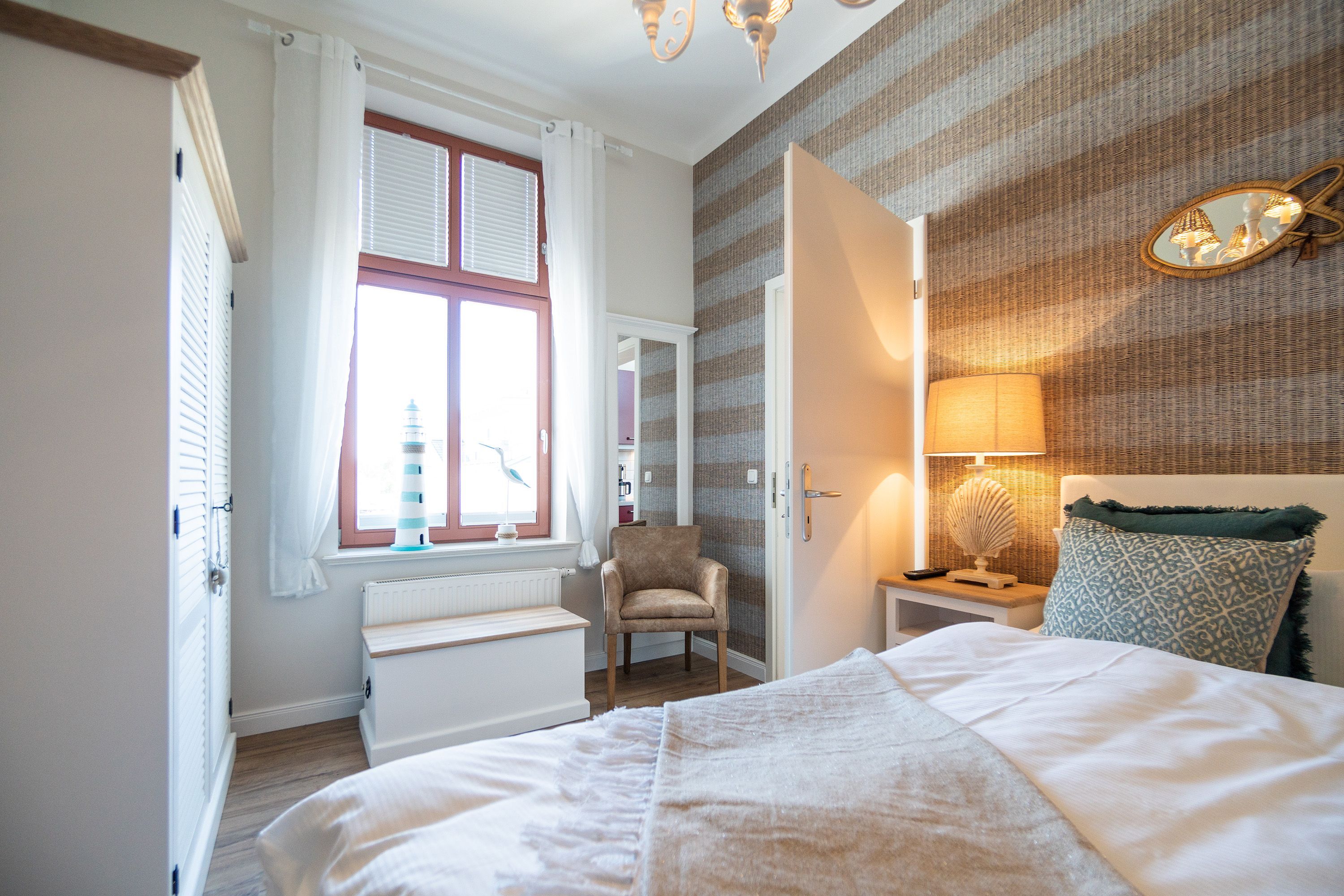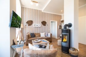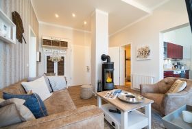 Viel Holz, Naturmaterialien, warme Naturtöne das Appartement Nummer 9 im ersten Obergeschoss des Ahlbecker Autorenhauses empfängt Ostseeliebhaber mit urig gemütlichem, maritimem Charme. Von der Naturtapete über die rustikalen und stylischen Möbel bis hin zu den Accessoires in diesem Urlaubsdomizil ist alles auf die wunderschöne Ostseelandschaft ausgerichtet. Die Liebe steckt in den vielen kleinen Details. Lassen Sie sich fallen und genießen Sie das entspannende Gefühl von viel Licht und Leichtigkeit. Die hohen Decken der alten Bädervilla lassen tief atmen und geben dem Freiheitsgefühl viel Raum. Benannt nach dem deutschen Schriftsteller Alfred Döblin, hätte dieses Ostseeparadies dem bekannten Essayisten während einer Auszeit am Meer ganz sicher jede Menge Inspiration für neue Werke gegeben. In dieser Wohnung trifft auf wunderbare Weise Alt auf Neu. Die drei Zimmer bieten Platz für vier Erwachsene und ein Kleinkind. Auf Wunsch kann für unsere kleinen Gäste ein Kinderreisebett (ohne zusätzliche Matratze & Bettzeug) und ein Kinderhochstuhl (gegen einen Aufpreis) zur Verfügung gestellt werden. Ganz besonders gemütlich wird es beim kuscheligen Beisammensitzen im Wohnzimmer vor dem Kaminofen. Für Unterhaltung sorgt der große Flat-TV. Die Küche ist offen. Vollausgestattet eignet sie sich sogar für kulinarische Meisterleistungen. Sie ist mit sämtlichen Geräten und Geschirr versehen. Essen können Sie im ebenfalls zum Wohnzimmer hin offenen Erker. Lichtdurchflutet, da von drei Seiten mit hohen Fenstern versehen, beginnt hier der Urlaub schon morgens perfekt. Von hier haben Sie uneingeschränkten Blick aufs Meer. Und nach Osten ausgerichtet scheint hier die Sonne auf den Frühstückstisch. Machen Sie die Fenster des Erkers weit auf und lassen Sie das Ostseerauschen in Ihr Appartement. Gebettet sind Sie in der Nummer 9 auf himmlisch komfortablen Boxspringdoppelbetten ( 1,80 m x 2,00 m). Jedes der beiden Schlafzimmer ist darüber hinaus mit einem Schrank und einem Flat-TV ausgestattet. Das Badezimmer ist geräumig. Ganz besonders die schöne Regendusche. Außerdem verfügt das Bad über einen Waschtisch und ein WC. In der Wohnung gibt es kostenfreies WLAN. Bei Anreise sind Ihre Betten bezogen und Handtücher liegen bereit. Falls Sie Ihre Wäsche einmal waschen wollen, steht dafür im Keller des Hauses eine Waschmaschine und ein Trockner zur Verfügung. Gegen eine Gebühr können Sie diese nutzen. Für Ihren Pkw steht Ihnen in der hauseigenen Tiefgarage ein fester Stellplatz zur Verfügung. Besonders praktisch: Für Gäste mit E-Auto steht eine gemeinschaftliche Lademöglichkeit in der Tiefgarage zur Verfügung (wird von vier Wohneinheiten genutzt). Die Abrechnung erfolgt bequem über eine Ladekarte eines bekannten Anbieters oder per Kreditkarte.