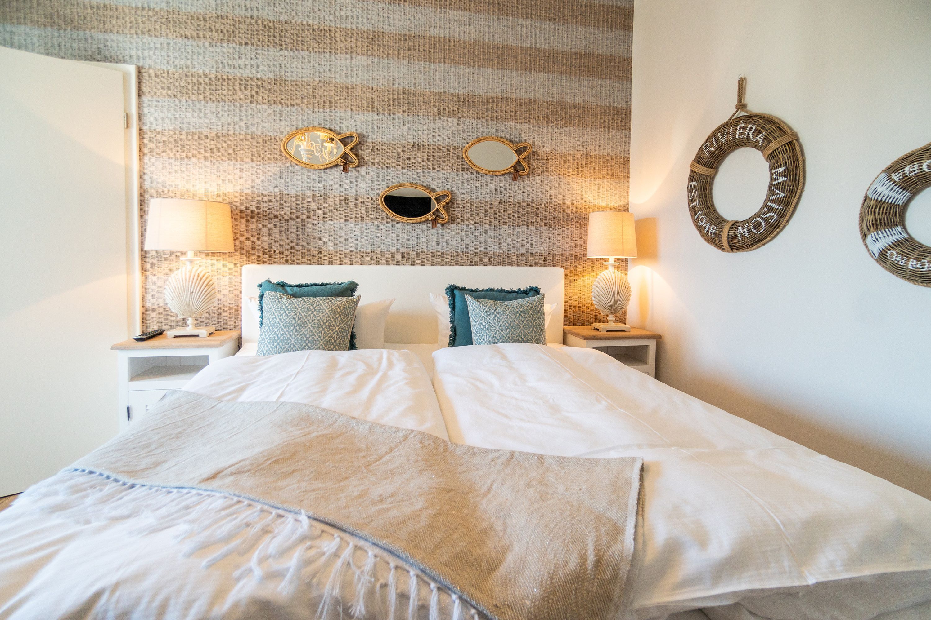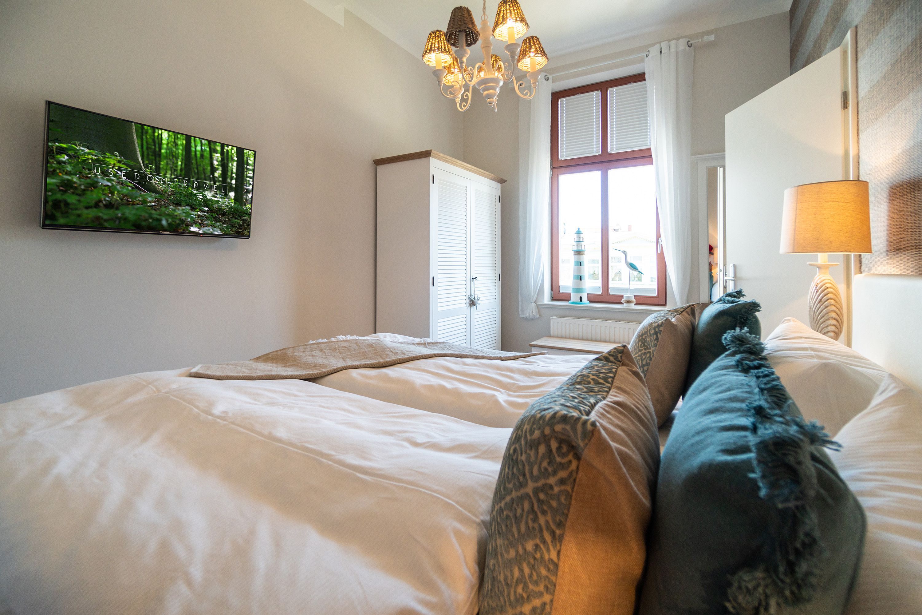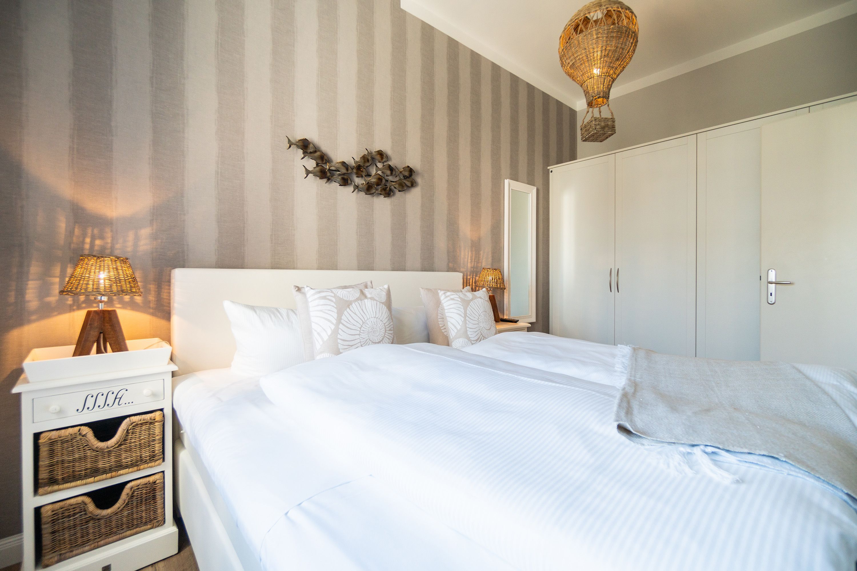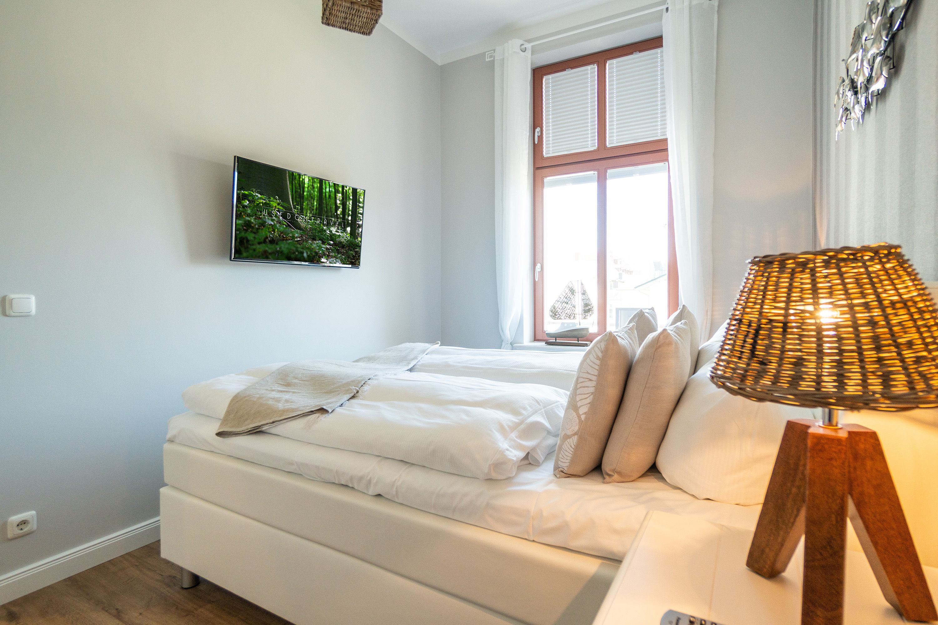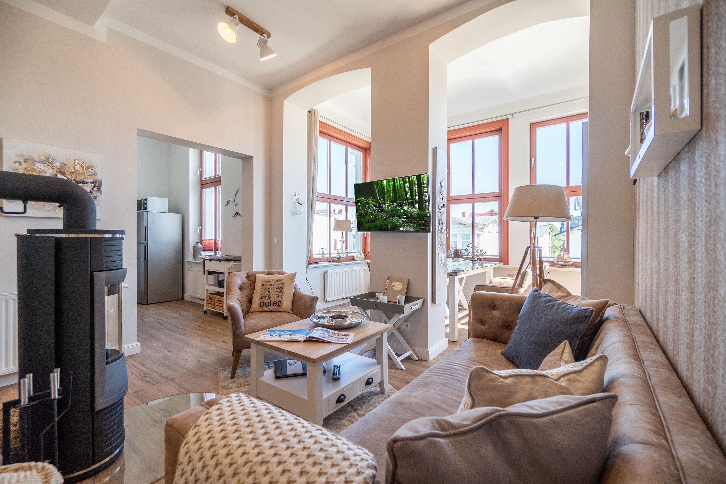 Viel Holz, Naturmaterialien, warme Naturtöne das Appartement Nummer 9 im ersten Obergeschoss des Ahlbecker Autorenhauses empfängt Ostseeliebhaber mit urig gemütlichem, maritimem Charme. Von der Naturtapete über die rustikalen und stylischen Möbel bis hin zu den Accessoires in diesem Urlaubsdomizil ist alles auf die wunderschöne Ostseelandschaft ausgerichtet. Die Liebe steckt in den vielen kleinen Details. Lassen Sie sich fallen und genießen Sie das entspannende Gefühl von viel Licht und Leichtigkeit. Die hohen Decken der alten Bädervilla lassen tief atmen und geben dem Freiheitsgefühl viel Raum. Benannt nach dem deutschen Schriftsteller Alfred Döblin, hätte dieses Ostseeparadies dem bekannten Essayisten während einer Auszeit am Meer ganz sicher jede Menge Inspiration für neue Werke gegeben. In dieser Wohnung trifft auf wunderbare Weise Alt auf Neu. Die drei Zimmer bieten Platz für vier Erwachsene und ein Kleinkind. Auf Wunsch kann für unsere kleinen Gäste ein Kinderreisebett (ohne zusätzliche Matratze & Bettzeug) und ein Kinderhochstuhl (gegen einen Aufpreis) zur Verfügung gestellt werden. Ganz besonders gemütlich wird es beim kuscheligen Beisammensitzen im Wohnzimmer vor dem Kaminofen. Für Unterhaltung sorgt der große Flat-TV. Die Küche ist offen. Vollausgestattet eignet sie sich sogar für kulinarische Meisterleistungen. Sie ist mit sämtlichen Geräten und Geschirr versehen. Essen können Sie im ebenfalls zum Wohnzimmer hin offenen Erker. Lichtdurchflutet, da von drei Seiten mit hohen Fenstern versehen, beginnt hier der Urlaub schon morgens perfekt. Von hier haben Sie uneingeschränkten Blick aufs Meer. Und nach Osten ausgerichtet scheint hier die Sonne auf den Frühstückstisch. Machen Sie die Fenster des Erkers weit auf und lassen Sie das Ostseerauschen in Ihr Appartement. Gebettet sind Sie in der Nummer 9 auf himmlisch komfortablen Boxspringdoppelbetten ( 1,80 m x 2,00 m). Jedes der beiden Schlafzimmer ist darüber hinaus mit einem Schrank und einem Flat-TV ausgestattet. Das Badezimmer ist geräumig. Ganz besonders die schöne Regendusche. Außerdem verfügt das Bad über einen Waschtisch und ein WC. In der Wohnung gibt es kostenfreies WLAN. Bei Anreise sind Ihre Betten bezogen und Handtücher liegen bereit. Falls Sie Ihre Wäsche einmal waschen wollen, steht dafür im Keller des Hauses eine Waschmaschine und ein Trockner zur Verfügung. Gegen eine Gebühr können Sie diese nutzen. Für Ihren Pkw steht Ihnen in der hauseigenen Tiefgarage ein fester Stellplatz zur Verfügung. Besonders praktisch: Für Gäste mit E-Auto steht eine gemeinschaftliche Lademöglichkeit in der Tiefgarage zur Verfügung (wird von vier Wohneinheiten genutzt). Die Abrechnung erfolgt bequem über eine Ladekarte eines bekannten Anbieters oder per Kreditkarte.