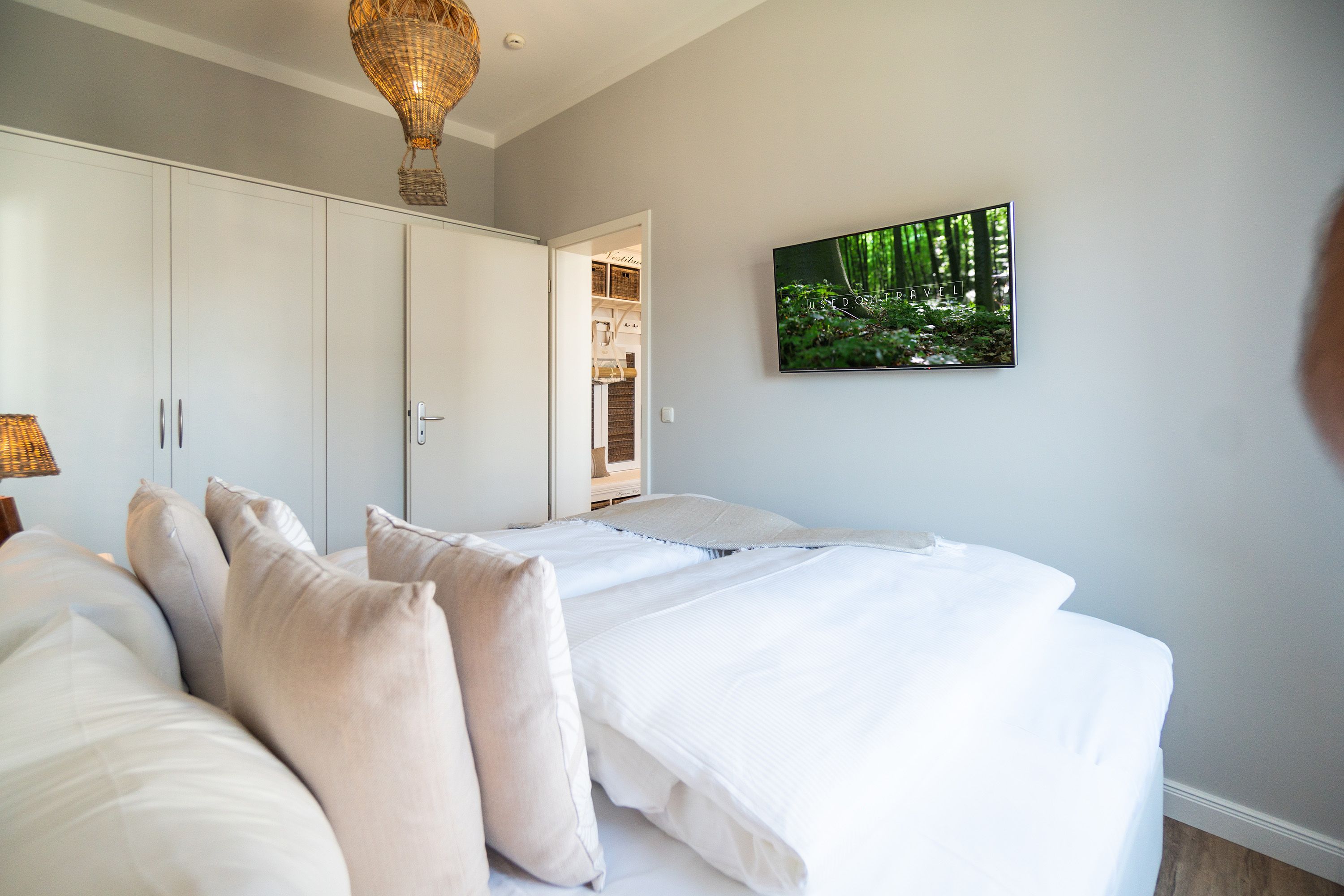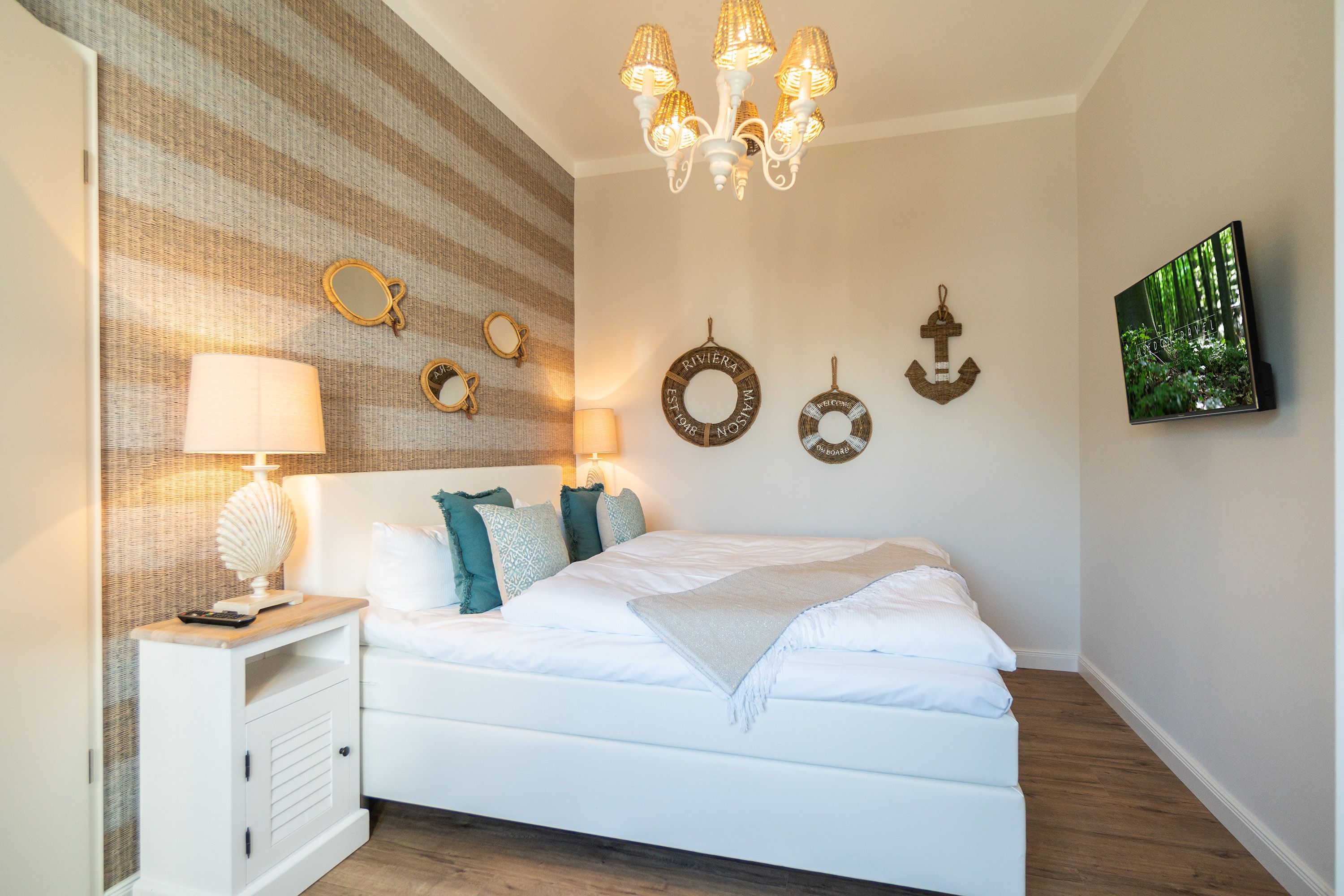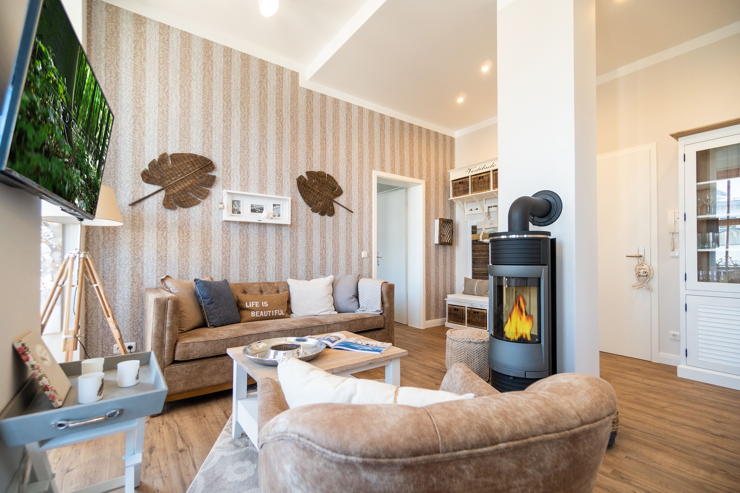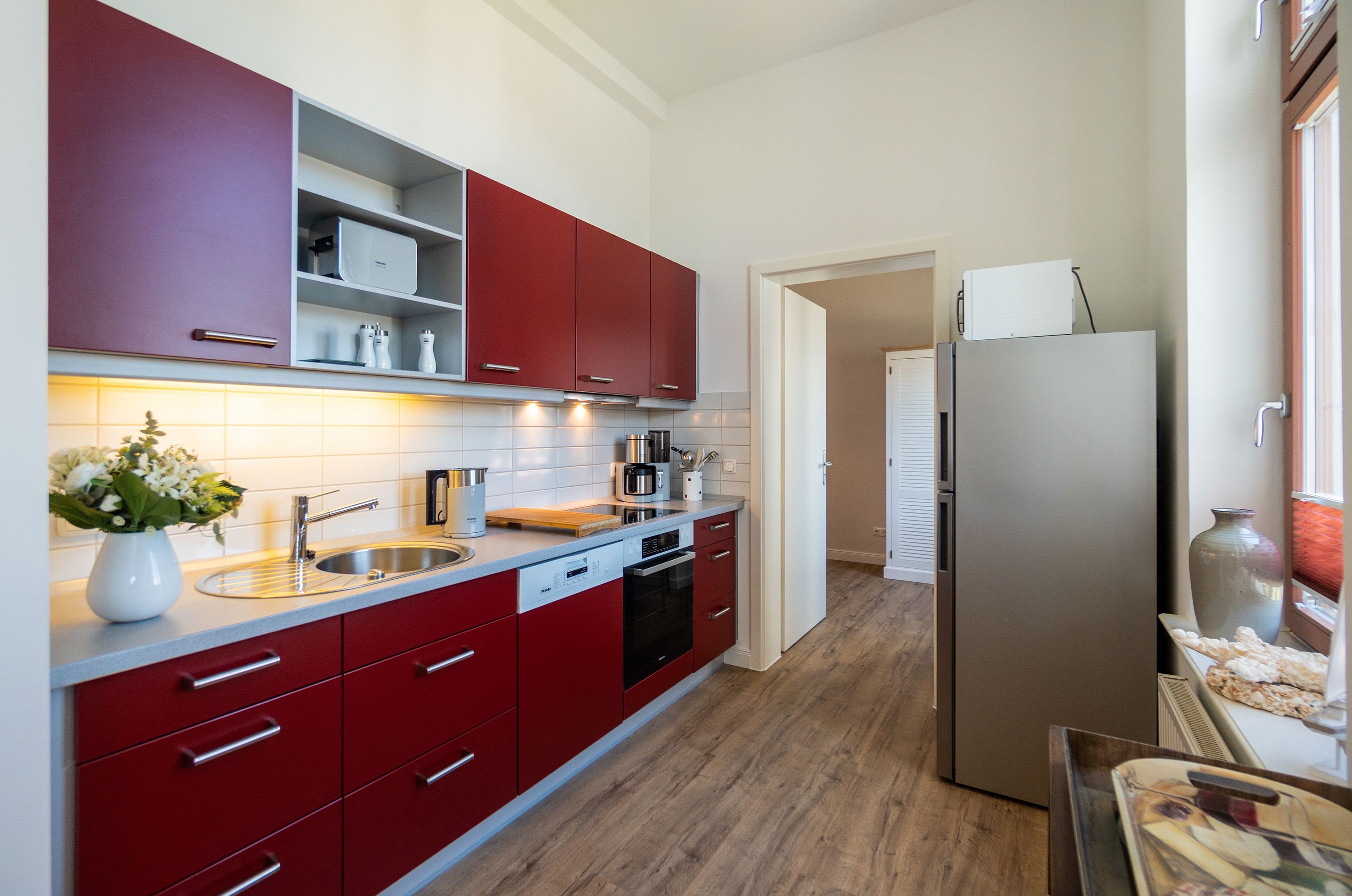 Viel Holz, Naturmaterialien, warme Naturtöne das Appartement Nummer 9 im ersten Obergeschoss des Ahlbecker Autorenhauses empfängt Ostseeliebhaber mit urig gemütlichem, maritimem Charme. Von der Naturtapete über die rustikalen und stylischen Möbel bis hin zu den Accessoires in diesem Urlaubsdomizil ist alles auf die wunderschöne Ostseelandschaft ausgerichtet. Die Liebe steckt in den vielen kleinen Details. Lassen Sie sich fallen und genießen Sie das entspannende Gefühl von viel Licht und Leichtigkeit. Die hohen Decken der alten Bädervilla lassen tief atmen und geben dem Freiheitsgefühl viel Raum. Benannt nach dem deutschen Schriftsteller Alfred Döblin, hätte dieses Ostseeparadies dem bekannten Essayisten während einer Auszeit am Meer ganz sicher jede Menge Inspiration für neue Werke gegeben. In dieser Wohnung trifft auf wunderbare Weise Alt auf Neu. Die drei Zimmer bieten Platz für vier Erwachsene und ein Kleinkind. Auf Wunsch kann für unsere kleinen Gäste ein Kinderreisebett (ohne zusätzliche Matratze & Bettzeug) und ein Kinderhochstuhl (gegen einen Aufpreis) zur Verfügung gestellt werden. Ganz besonders gemütlich wird es beim kuscheligen Beisammensitzen im Wohnzimmer vor dem Kaminofen. Für Unterhaltung sorgt der große Flat-TV. Die Küche ist offen. Vollausgestattet eignet sie sich sogar für kulinarische Meisterleistungen. Sie ist mit sämtlichen Geräten und Geschirr versehen. Essen können Sie im ebenfalls zum Wohnzimmer hin offenen Erker. Lichtdurchflutet, da von drei Seiten mit hohen Fenstern versehen, beginnt hier der Urlaub schon morgens perfekt. Von hier haben Sie uneingeschränkten Blick aufs Meer. Und nach Osten ausgerichtet scheint hier die Sonne auf den Frühstückstisch. Machen Sie die Fenster des Erkers weit auf und lassen Sie das Ostseerauschen in Ihr Appartement. Gebettet sind Sie in der Nummer 9 auf himmlisch komfortablen Boxspringdoppelbetten ( 1,80 m x 2,00 m). Jedes der beiden Schlafzimmer ist darüber hinaus mit einem Schrank und einem Flat-TV ausgestattet. Das Badezimmer ist geräumig. Ganz besonders die schöne Regendusche. Außerdem verfügt das Bad über einen Waschtisch und ein WC. In der Wohnung gibt es kostenfreies WLAN. Bei Anreise sind Ihre Betten bezogen und Handtücher liegen bereit. Falls Sie Ihre Wäsche einmal waschen wollen, steht dafür im Keller des Hauses eine Waschmaschine und ein Trockner zur Verfügung. Gegen eine Gebühr können Sie diese nutzen. Für Ihren Pkw steht Ihnen in der hauseigenen Tiefgarage ein fester Stellplatz zur Verfügung. Besonders praktisch: Für Gäste mit E-Auto steht eine gemeinschaftliche Lademöglichkeit in der Tiefgarage zur Verfügung (wird von vier Wohneinheiten genutzt). Die Abrechnung erfolgt bequem über eine Ladekarte eines bekannten Anbieters oder per Kreditkarte.