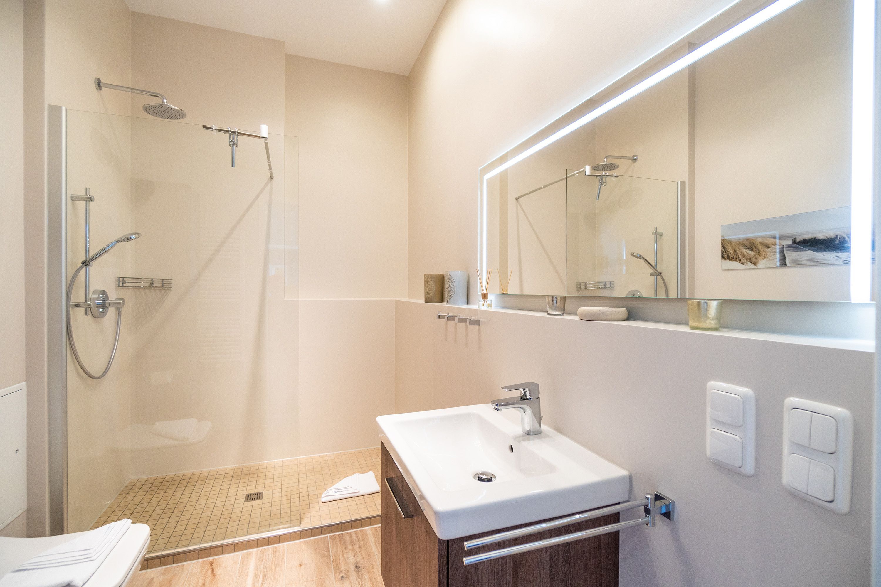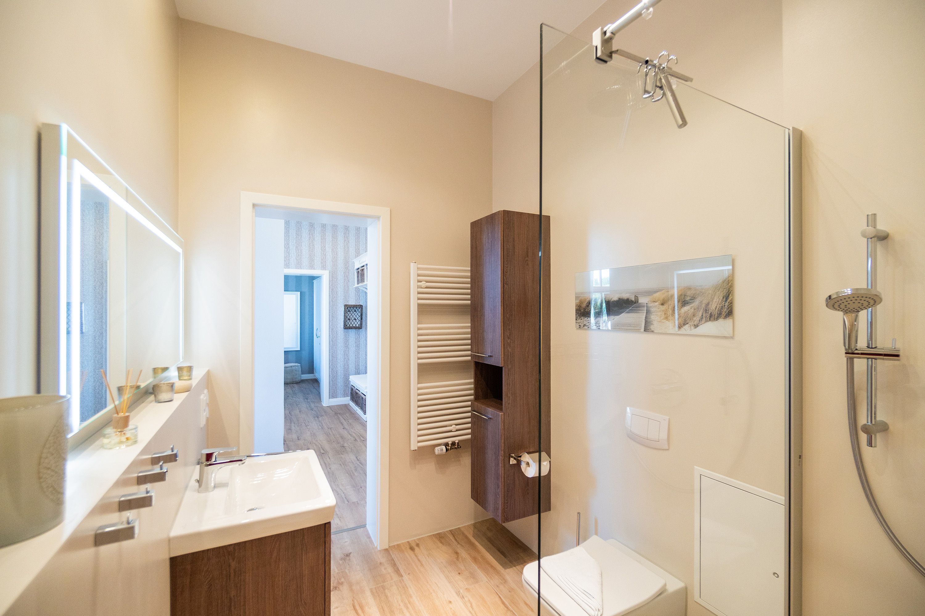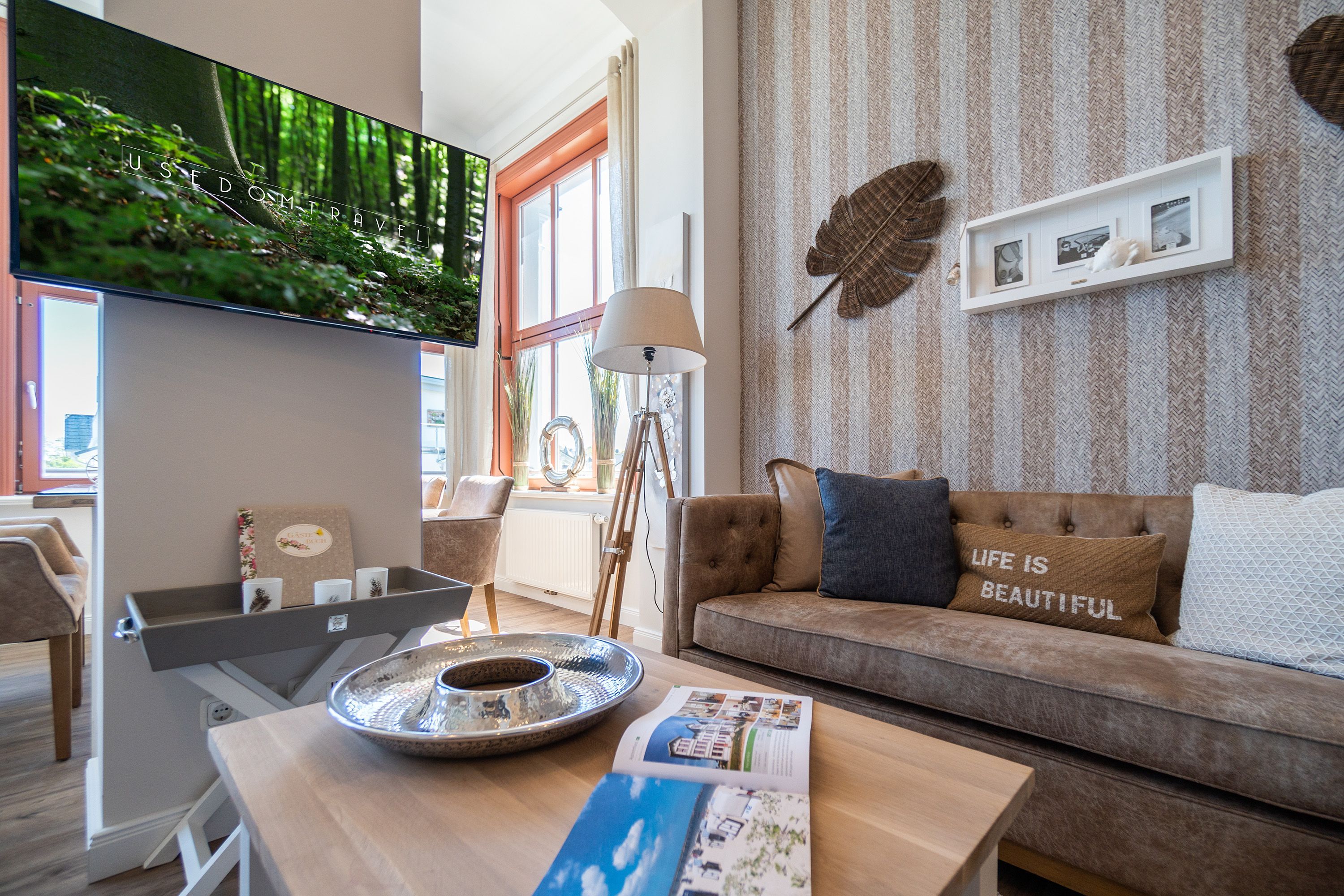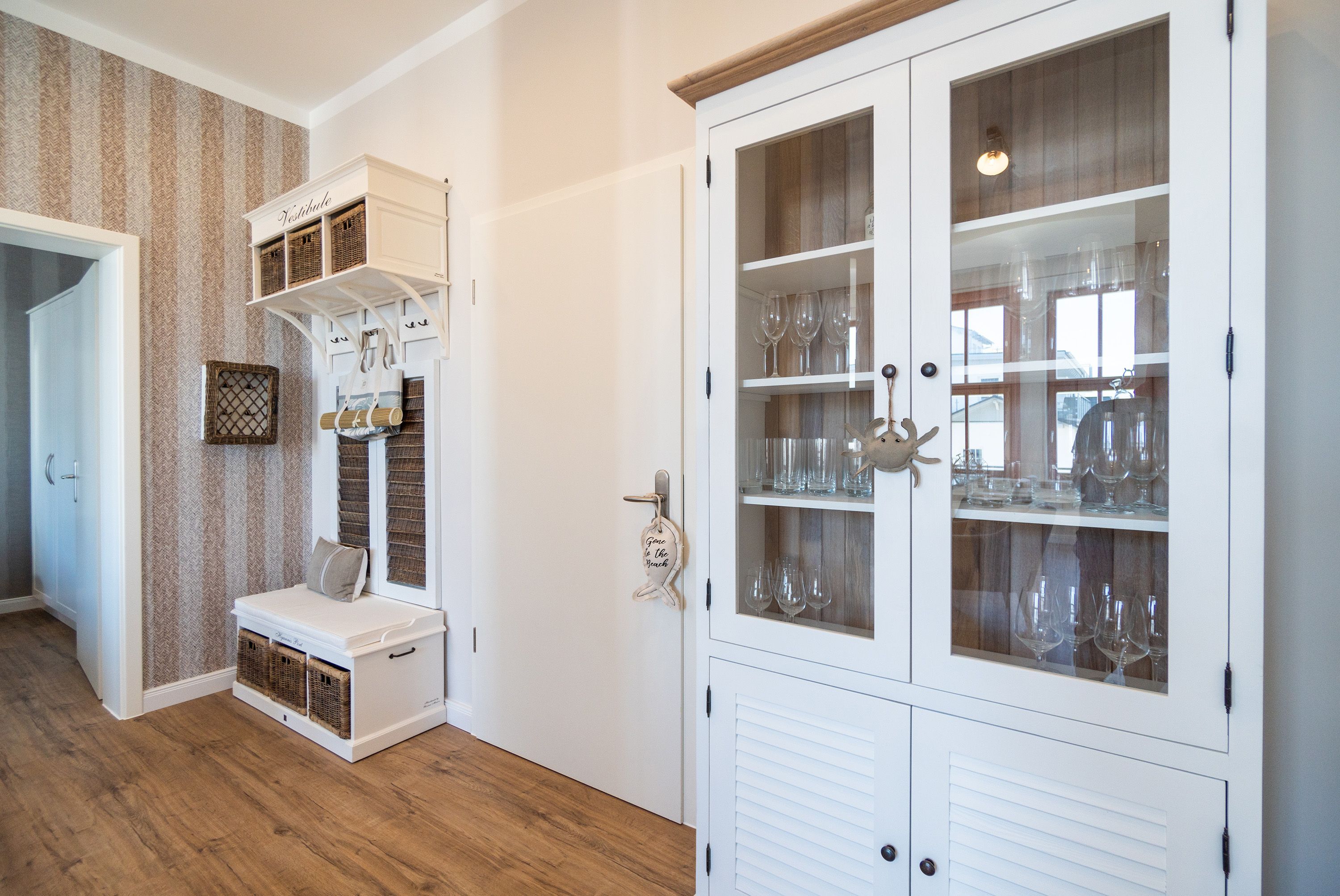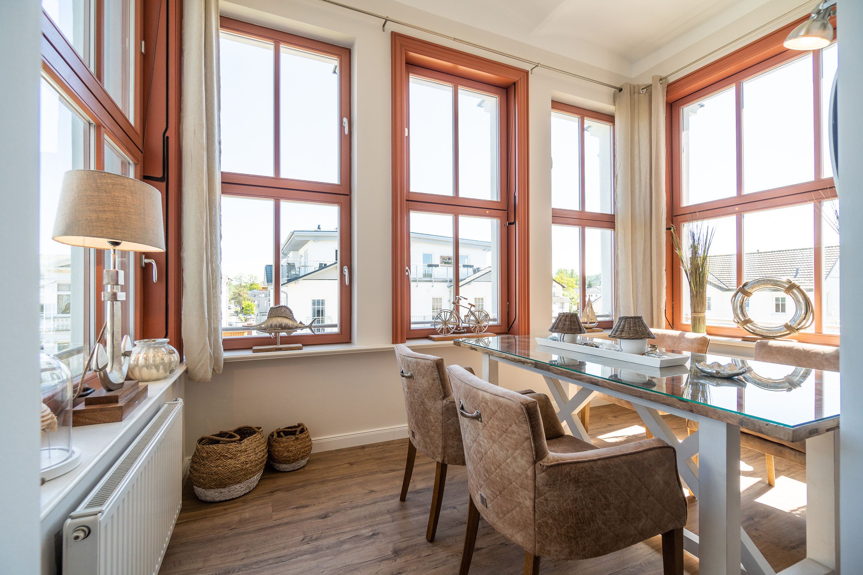Viel Holz, Naturmaterialien, warme Naturtöne das Appartement Nummer 9 im ersten Obergeschoss des Ahlbecker Autorenhauses empfängt Ostseeliebhaber mit urig gemütlichem, maritimem Charme. Von der Naturtapete über die rustikalen und stylischen Möbel bis hin zu den Accessoires in diesem Urlaubsdomizil ist alles auf die wunderschöne Ostseelandschaft ausgerichtet. Die Liebe steckt in den vielen kleinen Details. Lassen Sie sich fallen und genießen Sie das entspannende Gefühl von viel Licht und Leichtigkeit. Die hohen Decken der alten Bädervilla lassen tief atmen und geben dem Freiheitsgefühl viel Raum. Benannt nach dem deutschen Schriftsteller Alfred Döblin, hätte dieses Ostseeparadies dem bekannten Essayisten während einer Auszeit am Meer ganz sicher jede Menge Inspiration für neue Werke gegeben. In dieser Wohnung trifft auf wunderbare Weise Alt auf Neu. Die drei Zimmer bieten Platz für vier Erwachsene und ein Kleinkind. Auf Wunsch kann für unsere kleinen Gäste ein Kinderreisebett (ohne zusätzliche Matratze & Bettzeug) und ein Kinderhochstuhl (gegen einen Aufpreis) zur Verfügung gestellt werden. Ganz besonders gemütlich wird es beim kuscheligen Beisammensitzen im Wohnzimmer vor dem Kaminofen. Für Unterhaltung sorgt der große Flat-TV. Die Küche ist offen. Vollausgestattet eignet sie sich sogar für kulinarische Meisterleistungen. Sie ist mit sämtlichen Geräten und Geschirr versehen. Essen können Sie im ebenfalls zum Wohnzimmer hin offenen Erker. Lichtdurchflutet, da von drei Seiten mit hohen Fenstern versehen, beginnt hier der Urlaub schon morgens perfekt. Von hier haben Sie uneingeschränkten Blick aufs Meer. Und nach Osten ausgerichtet scheint hier die Sonne auf den Frühstückstisch. Machen Sie die Fenster des Erkers weit auf und lassen Sie das Ostseerauschen in Ihr Appartement. Gebettet sind Sie in der Nummer 9 auf himmlisch komfortablen Boxspringdoppelbetten ( 1,80 m x 2,00 m). Jedes der beiden Schlafzimmer ist darüber hinaus mit einem Schrank und einem Flat-TV ausgestattet. Das Badezimmer ist geräumig. Ganz besonders die schöne Regendusche. Außerdem verfügt das Bad über einen Waschtisch und ein WC. In der Wohnung gibt es kostenfreies WLAN. Bei Anreise sind Ihre Betten bezogen und Handtücher liegen bereit. Falls Sie Ihre Wäsche einmal waschen wollen, steht dafür im Keller des Hauses eine Waschmaschine und ein Trockner zur Verfügung. Gegen eine Gebühr können Sie diese nutzen. Für Ihren Pkw steht Ihnen in der hauseigenen Tiefgarage ein fester Stellplatz zur Verfügung. Besonders praktisch: Für Gäste mit E-Auto steht eine gemeinschaftliche Lademöglichkeit in der Tiefgarage zur Verfügung (wird von vier Wohneinheiten genutzt). Die Abrechnung erfolgt bequem über eine Ladekarte eines bekannten Anbieters oder per Kreditkarte.