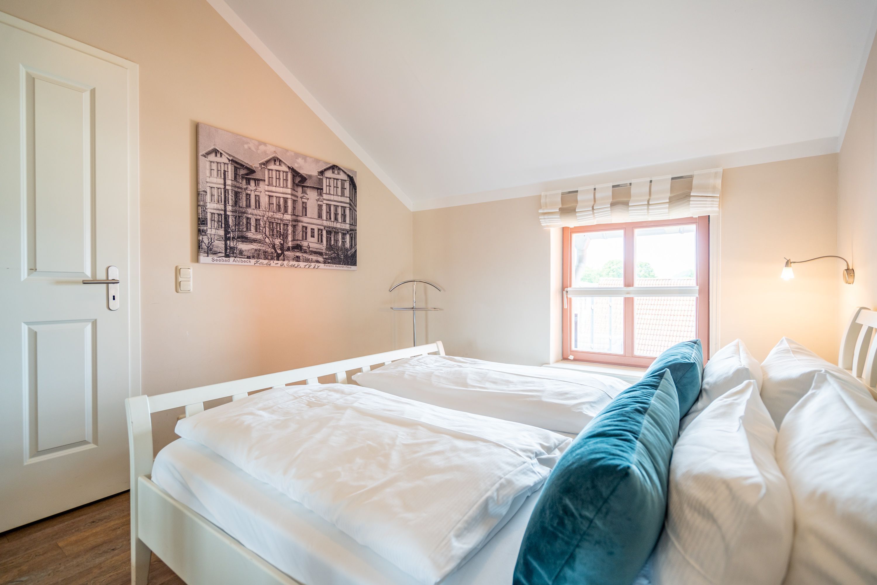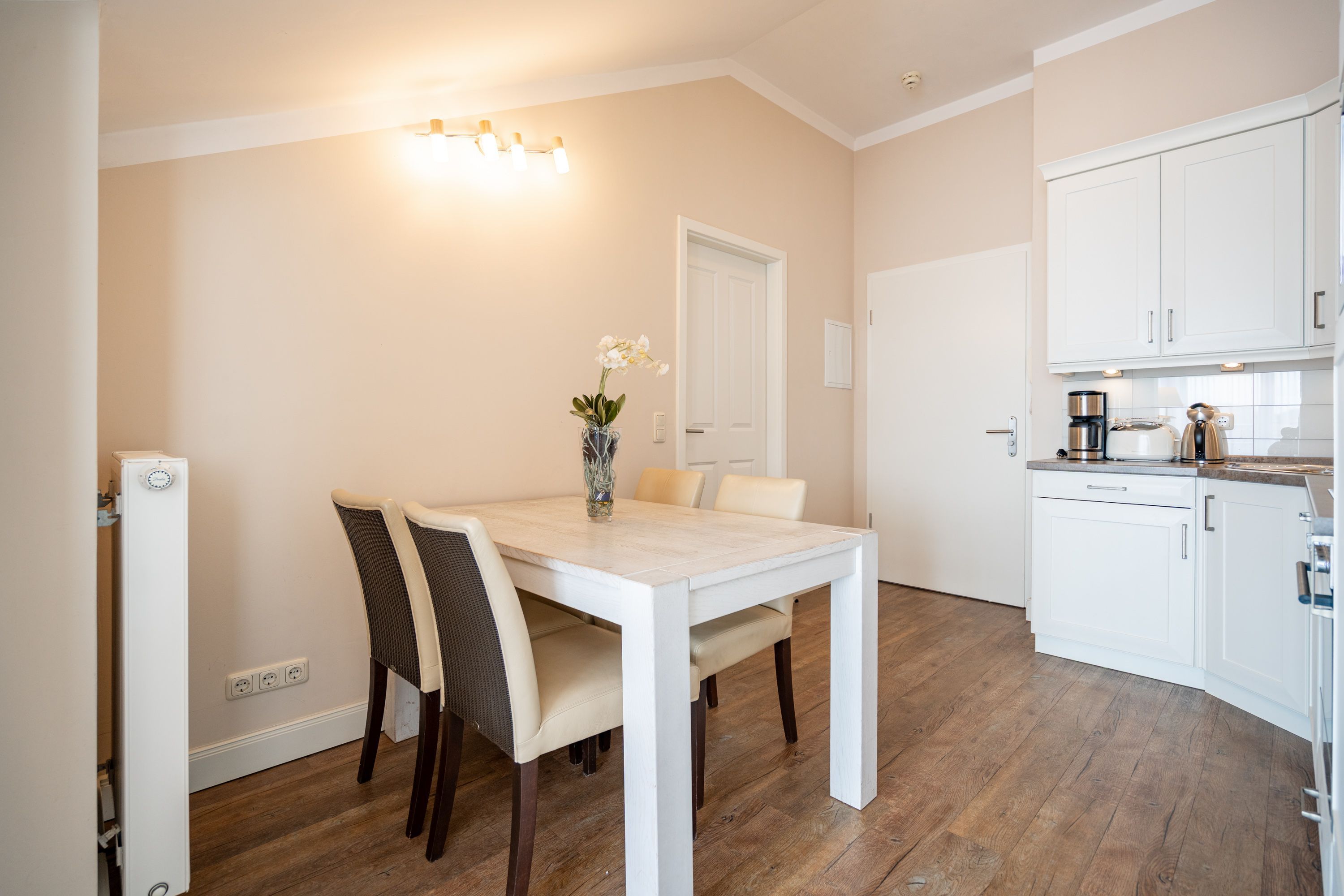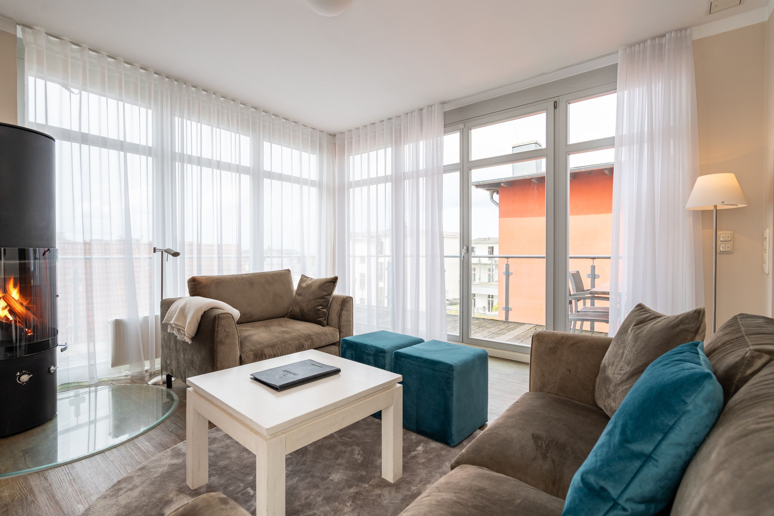 Moderner Landhausstil, stilvolle Dekorationen und ein lichtdurchfluteter Wohnbereich - herzlich Willkommen in der Ferienwohnung 13 des Autorenhauses. Hier werden Sie sich von Beginn an, wie zu Hause fühlen. Im Wohnbereich relaxt man vor dem Kamin, von hier hat man Zugang zum umlaufenden, großzügigen Balkon, der ab mittags Sonne verspricht. Das Schlafzimmer ist mit einem Doppelbett (1,80m x 2m) eingerichtet und bietet Platz für 2 Erwachsene und 1 Kleinkind (bis 3 Jahre) im Reisebett. Und die integrierte Küche ist komplett ausgestattet. Ergänzt wird die Wohnung durch ein modernes Bad mit Dusche. Auf Wunsch stellen wir für unsere kleinen Gäste ein Kinderreisebett (ohne zusätzliche Matratze & Bettzeug) und einen Kinderhochstuhl ( gegen einen Aufpreis) zur Verfügung. Für Ihren Komfort sind die Betten bei der Anreise bezogen und Handtücher liegen bereit. Im Keller des Hauses stehen eine Waschmaschine und ein Trockner gegen Gebühr zur Verfügung. Bei diesem Appartement besteht die Möglichkeit es mit dem Nachbarappartement 14 zu kombinieren. Durch einen gemeinsam nutzbaren Vorflur entsteht auf Wunsch aus beiden Wohnungen ein großes Urlaubsdomizil mit 2 Schlafzimmern.