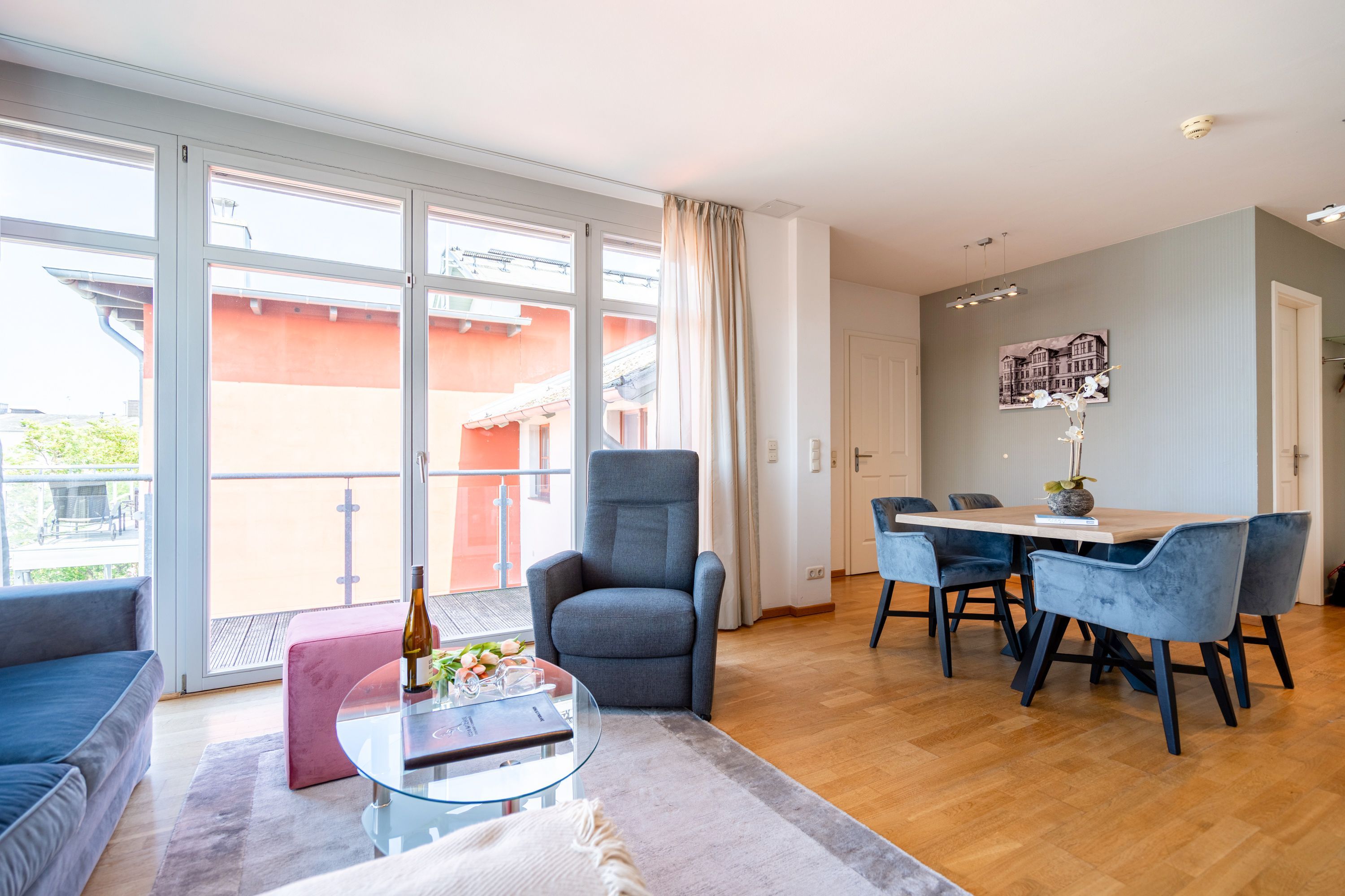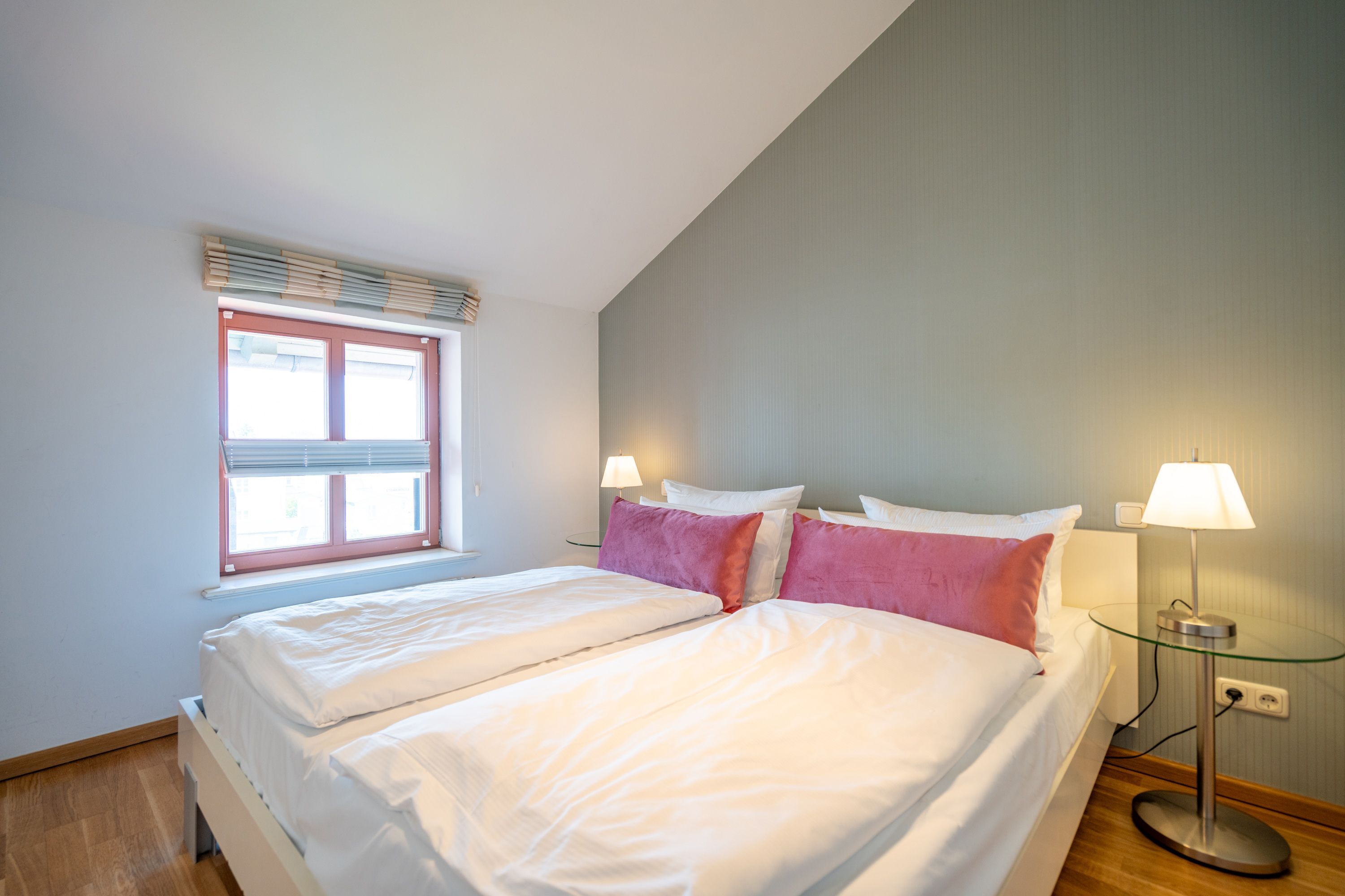Gekonntes Design, schlichte Eleganz! Diese Wohlfühlferienwohnung im 2. Obergeschoss des Hauses bietet Platz für 2 Erwachsene und 1 Kleinkind (bis 3 Jahre) im Reisebett und wird Sie nicht nur durch die geschmackvolle, komplette Einrichtung begeistern. Auch der Kaminofen und der umlaufende Südwestbalkon machen die Wohnung so beliebt. Das Wohnzimmer geht über in die offene Küchenzeile mit Essbereich und wird ergänzt durch ein gemütliches Schlafzimmer mit Doppelbett (1,80m x 2m). und ein Bad mit Dusche und WC. Auf Wunsch stellen wir für unsere kleinen Gäste ein Kinderreisebett (ohne zusätzliche Matratze & Bettzeug) und einen Kinderhochstuhl ( gegen einen Aufpreis) zur Verfügung. Für Ihren Komfort sind die Betten bei der Anreise bezogen und Handtücher liegen bereit. Das WLAN-Netz im Haus ist ab 2019 kostenfrei nutzbar. Im Keller des Hauses stehen eine Waschmaschine und ein Trockner gegen Gebühr zur Verfügung.