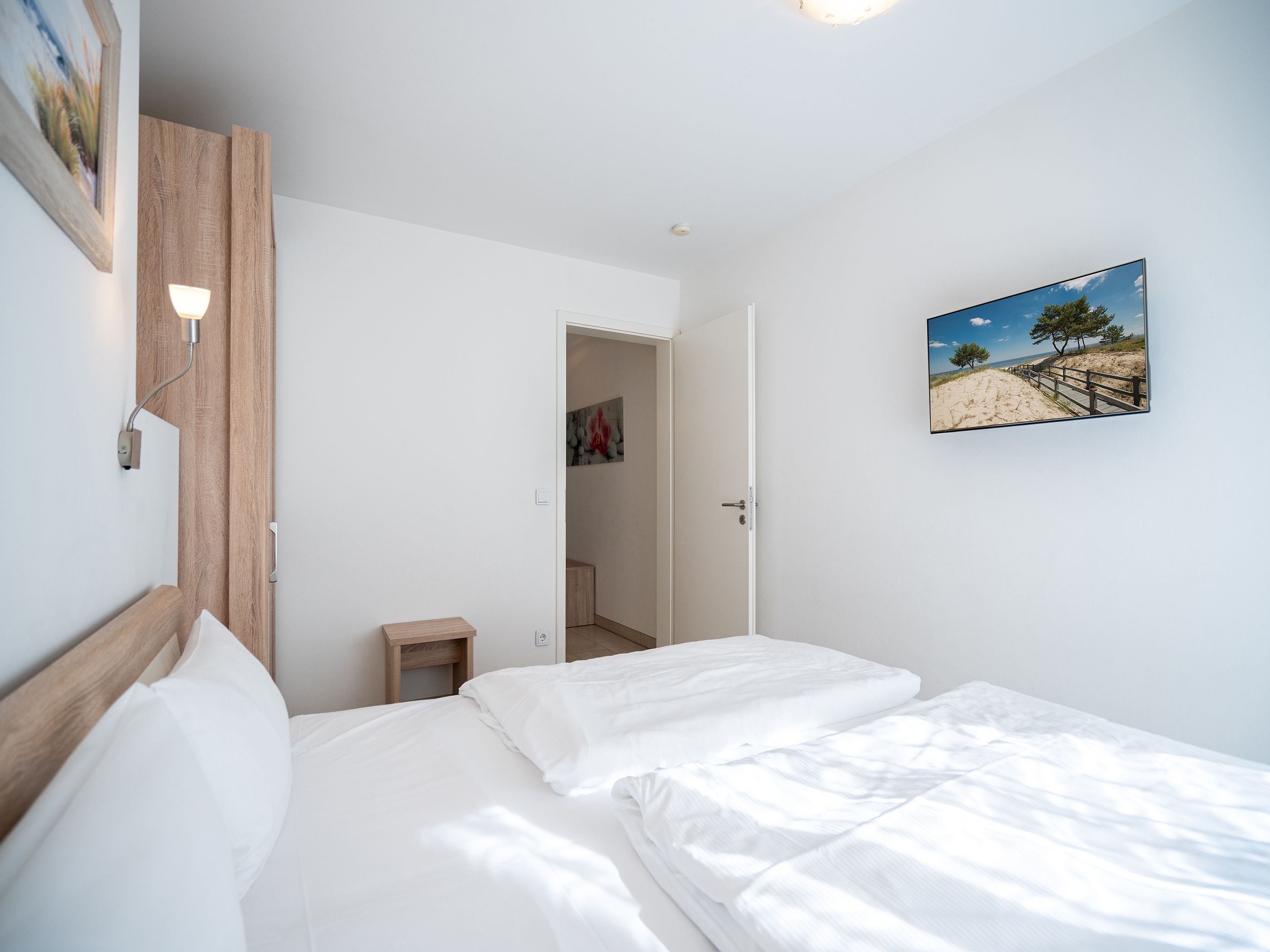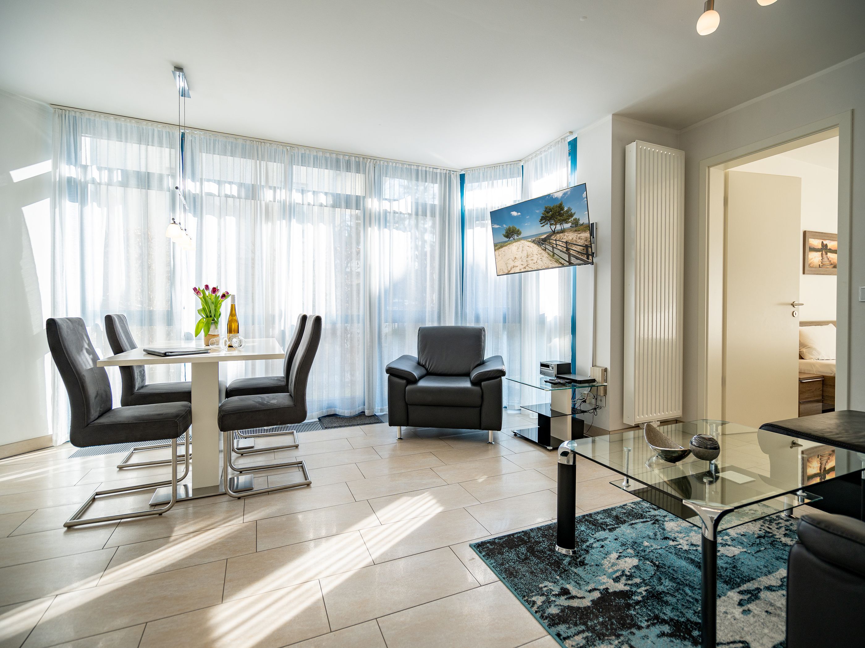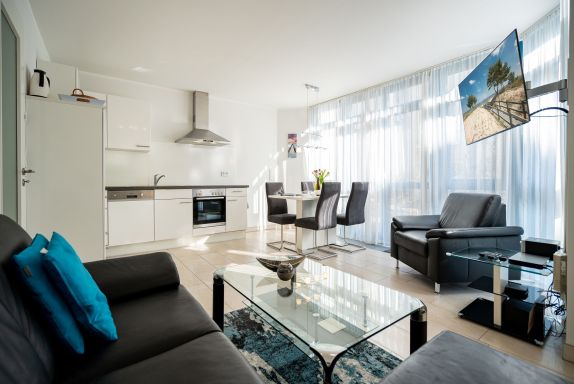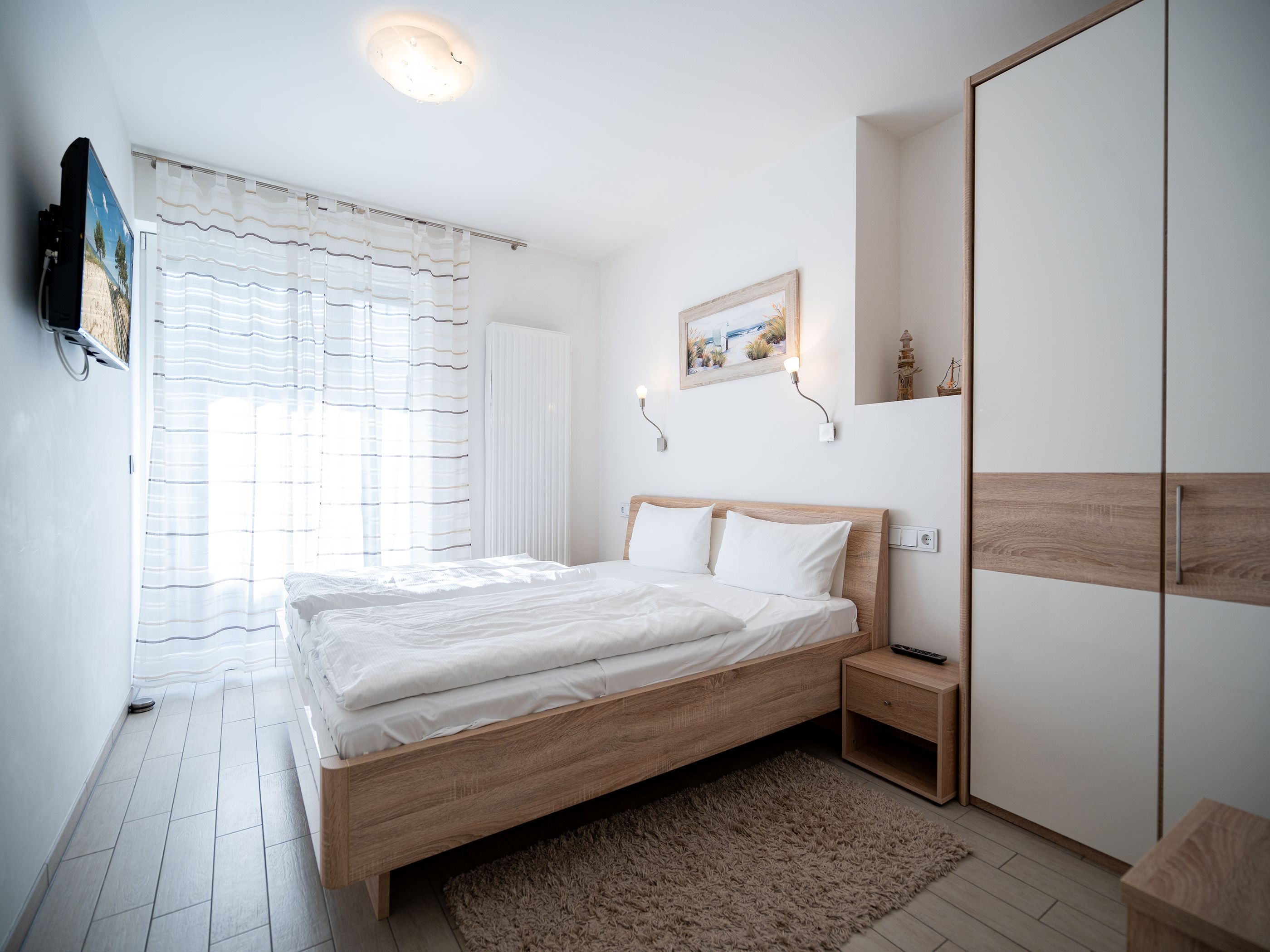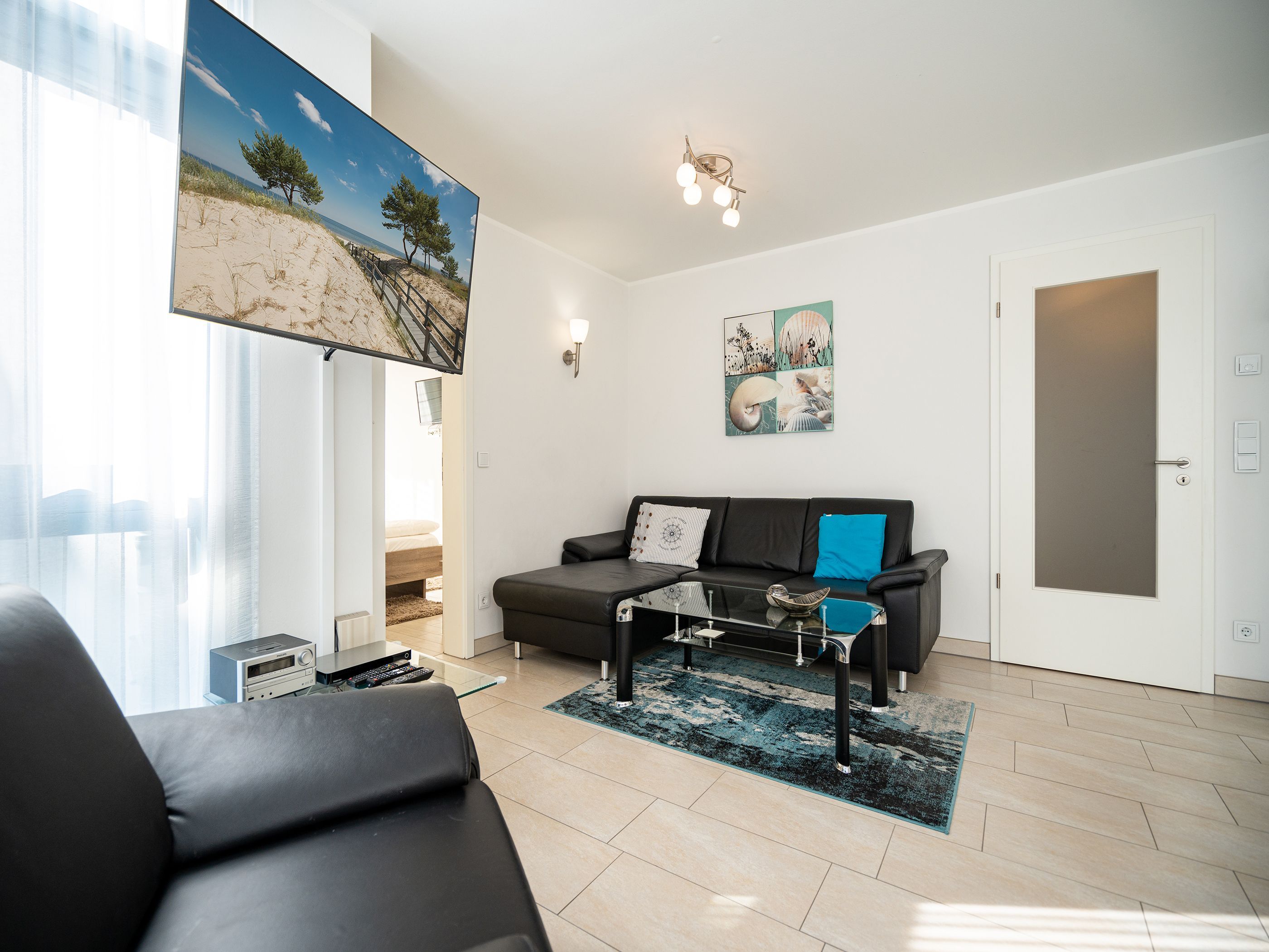 Willkommen in dieser geschmackvoll eingerichteten 3-Raum-Ferienwohnung im Erdgeschoss des Hauses Baltic. Die moderne Möblierung, die harmonisch aufeinander abgestimmten Farben und die liebevoll ausgewählten Dekorationen schaffen ein einladendes Ambiente auf 68 Quadratmetern. Mit zwei Schlafzimmern, die jeweils mit komfortablen Doppelbetten ausgestattet sind und eines davon zusätzlich über einen Smart-TV verfügt, ist diese Wohnung ideal für bis zu vier Personen. Der gemütliche Wohnbereich mit einer bequemen Ledersitzgruppe lädt zum Entspannen ein und grenzt an die offene, komplett ausgestattete Küche mit Essplatz. Ein weiterer Smart-TV sowie ein Blu-Ray-Player mit iPod-Dockingstation bieten Unterhaltungsmöglichkeiten für gemütliche Abende. Das moderne Bad mit Echtglasdusche sorgt für ein angenehmes Frischegefühl, und ein zusätzliches Gäste-WC bietet zusätzlichen Komfort. Wenn Sie keine Lust auf den Strand haben, können Sie die Sonne auf einer der beiden großzügigen Terrassen genießen – eine nach Süden und eine nach Osten ausgerichtet. Bequeme Gartenmöbel laden hier zum Verweilen ein. Für Ihren Komfort sind die Betten bei Ihrer Anreise bereits bezogen. Alle Räume mit Fenstern, also die beiden Schlafzimmer und das Wohnzimmer, sind mit elektronischen Außenrollläden ausgestattet. Ein eigener PKW-Stellplatz (Nr. 11) befindet sich direkt am Haus und das kostenfreie WLAN im gesamten Haus sorgt dafür, dass Sie immer online bleiben können. Zudem steht Ihnen eine Waschmaschine im Abstellraum zur Verfügung. Freuen Sie sich auf einen unbeschwerten und komfortablen Aufenthalt in unserer Ferienwohnung im Haus Baltic.