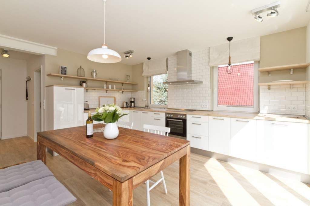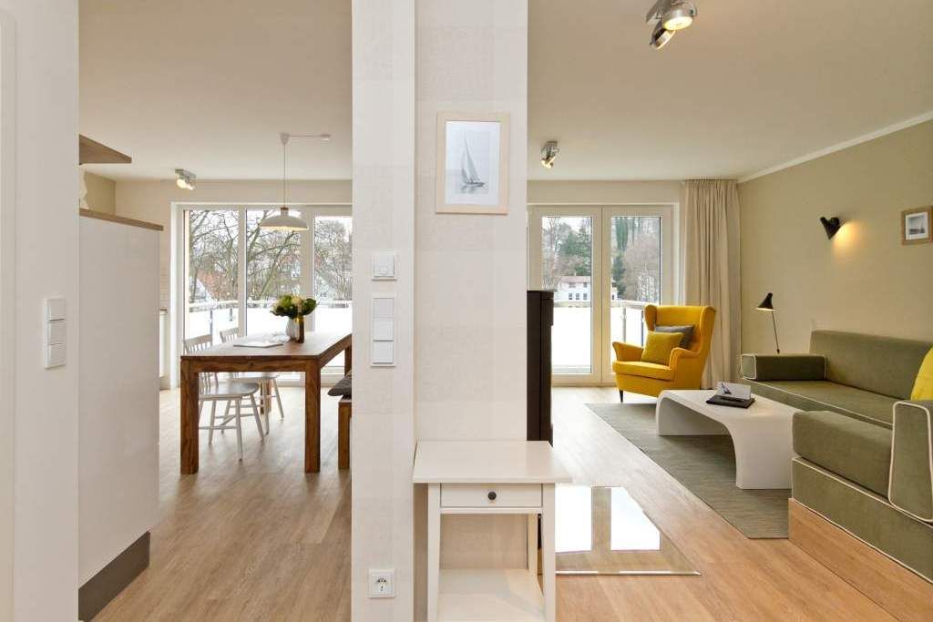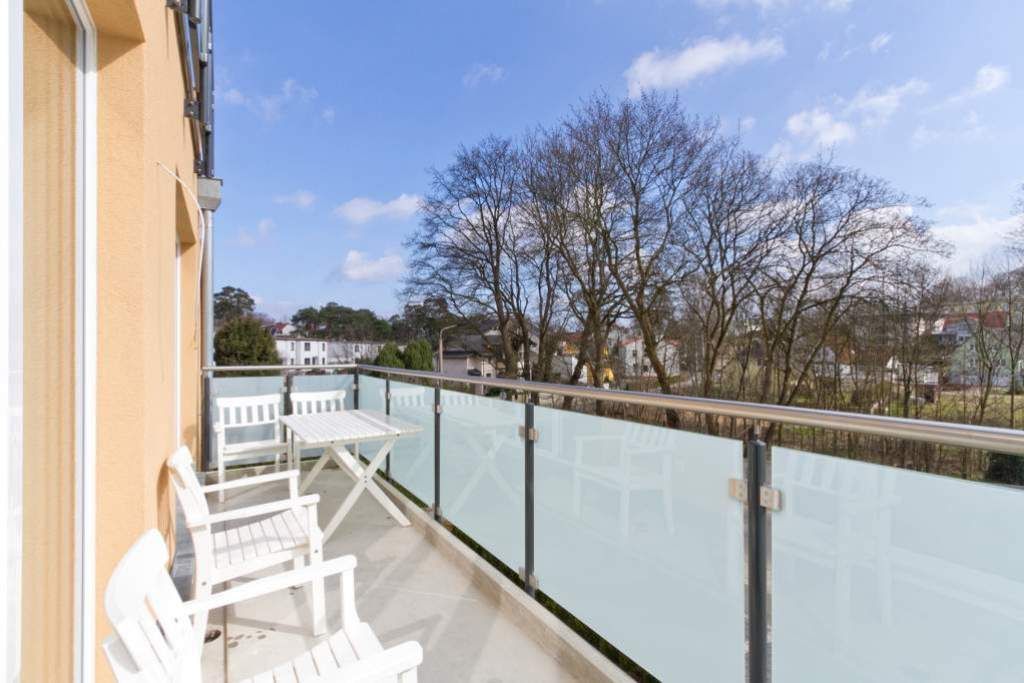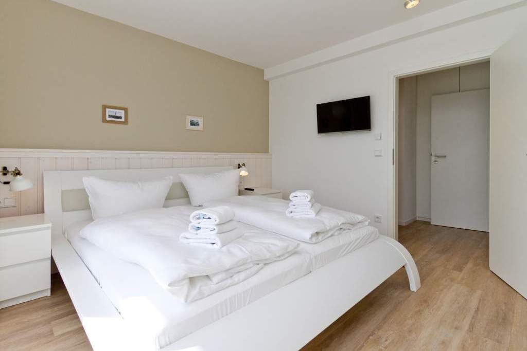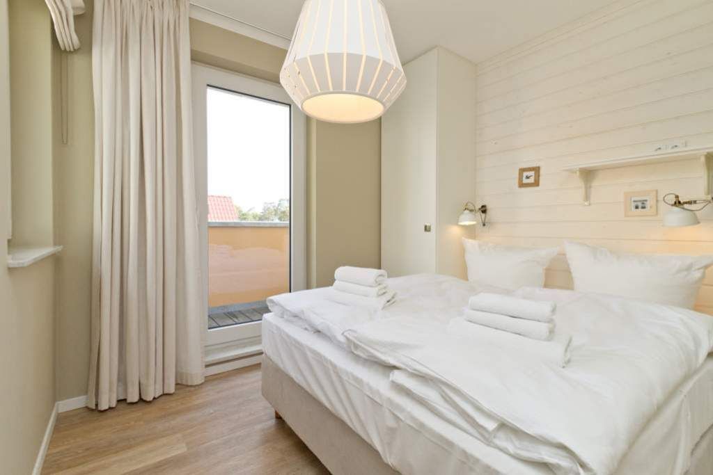 Wer luftige Leichtigkeit, viel Platz und eine stylische, minimalistische Einrichtung in einem harmonischen Farbkonzept liebt, wird sich in den beiden Etagen der Wohnung 6 absolut wohlfühlen. Wann haben Sie das letzte Mal gekocht, wie ein Sternekoch? Das tun Sie jeden Tag? Dann freuen Sie sich auf die großzügige und wunderschön gestaltete und komplett ausgestattete Küche. Metrofliesen und moderne Geräte verleihen der Küchenzeile ein schickes und funktionelles Design. Die große Arbeitsfläche aus Holz bietet reichlich Platz zum Austoben an Herd und Co. Ein schöner großer Holztisch lädt hernach zum ausgiebigen Schlemmen und Zusammensitzen ein. Spielt das Wetter mit, spricht nichts gegen ein Frühstück oder Abendessen auf dem Balkon. Da dieser nach Osten ausgerichtet ist, haben Sie hier schon zum Frühstück herrlichsten Sonnenschein und zum Nachmittag wunderbare Kühle an heißen Ostseesommertagen. Gleich nebenan wartet ein helles und großes Wohnzimmer mit Kaminofen und Flat-TV nur darauf, Ihnen schöne Stunden zu bescheren. Eine bequeme Design-Sofalandschaft und ein senfgelber Ohrensessel laden zum Entspannen ein. Auch von hier gibt es einen Zugang zum Balkon. Der knapp 81 Quadratmeter große Ferientraum setzt sich in einer zweiten Etage fort. In den beiden Schlafzimmern im schwedischen Landhausstil mit viel weißem Holz und sanften Naturtönen können bis zu vier Personen nächtigen. Ein Schlafzimmer besitzt ein großes Doppelbett (1,80 m x 2,00 m), einen Flat-TV und einen geräumigen Kleiderschrank. Außerdem gelangen Sie von hier ins schöne Masterbad mit Badewanne mit Regendusche, Waschtisch und WC. Das zweite Schlafzimmer beherbergt ein Boxspringdoppelbett (1,60 m x 2,00 m) und einen Kleiderschrank. Beide Zimmer haben Zugang zum umlaufenden Balkon. Die Wohnung verfügt über ein zweites Bad auf der Wohn- und Küchenetage. Dieses ist mit Dusche, Waschtisch und WC ausgestattet. Für einen rundum sorglosen Urlaub sind bei Anreise die Betten bezogen und Handtücher liegen bereit. Das WLAN kann kostenfrei genutzt werden. Ein Pkw-Stellplatz befindet sich am Haus.