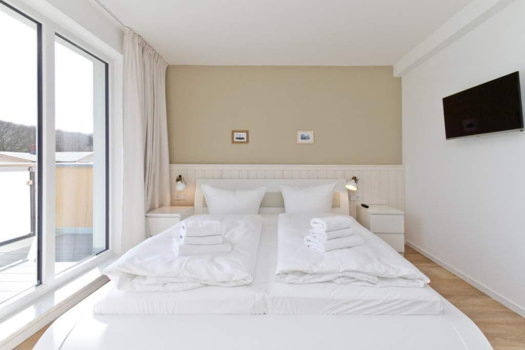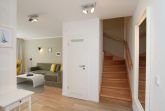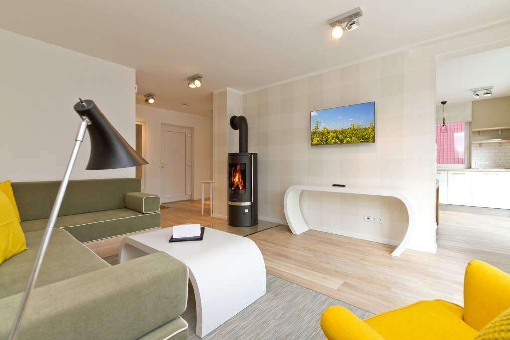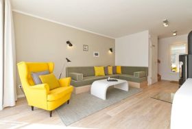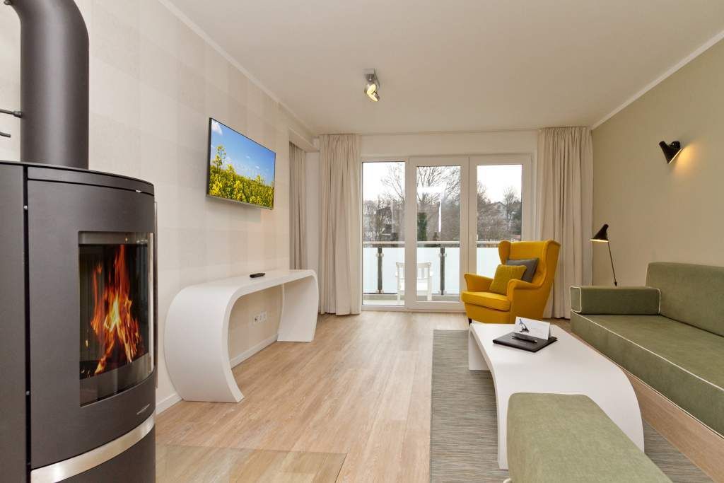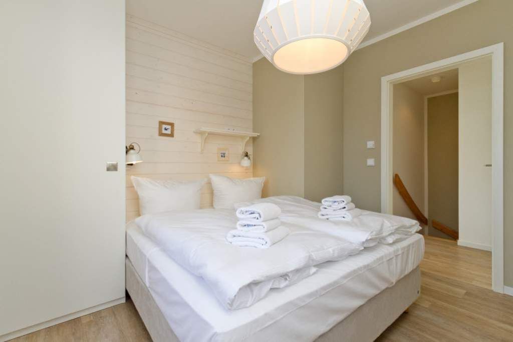 Wer luftige Leichtigkeit, viel Platz und eine stylische, minimalistische Einrichtung in einem harmonischen Farbkonzept liebt, wird sich in den beiden Etagen der Wohnung 6 absolut wohlfühlen. Wann haben Sie das letzte Mal gekocht, wie ein Sternekoch? Das tun Sie jeden Tag? Dann freuen Sie sich auf die großzügige und wunderschön gestaltete und komplett ausgestattete Küche. Metrofliesen und moderne Geräte verleihen der Küchenzeile ein schickes und funktionelles Design. Die große Arbeitsfläche aus Holz bietet reichlich Platz zum Austoben an Herd und Co. Ein schöner großer Holztisch lädt hernach zum ausgiebigen Schlemmen und Zusammensitzen ein. Spielt das Wetter mit, spricht nichts gegen ein Frühstück oder Abendessen auf dem Balkon. Da dieser nach Osten ausgerichtet ist, haben Sie hier schon zum Frühstück herrlichsten Sonnenschein und zum Nachmittag wunderbare Kühle an heißen Ostseesommertagen. Gleich nebenan wartet ein helles und großes Wohnzimmer mit Kaminofen und Flat-TV nur darauf, Ihnen schöne Stunden zu bescheren. Eine bequeme Design-Sofalandschaft und ein senfgelber Ohrensessel laden zum Entspannen ein. Auch von hier gibt es einen Zugang zum Balkon. Der knapp 81 Quadratmeter große Ferientraum setzt sich in einer zweiten Etage fort. In den beiden Schlafzimmern im schwedischen Landhausstil mit viel weißem Holz und sanften Naturtönen können bis zu vier Personen nächtigen. Ein Schlafzimmer besitzt ein großes Doppelbett (1,80 m x 2,00 m), einen Flat-TV und einen geräumigen Kleiderschrank. Außerdem gelangen Sie von hier ins schöne Masterbad mit Badewanne mit Regendusche, Waschtisch und WC. Das zweite Schlafzimmer beherbergt ein Boxspringdoppelbett (1,60 m x 2,00 m) und einen Kleiderschrank. Beide Zimmer haben Zugang zum umlaufenden Balkon. Die Wohnung verfügt über ein zweites Bad auf der Wohn- und Küchenetage. Dieses ist mit Dusche, Waschtisch und WC ausgestattet. Für einen rundum sorglosen Urlaub sind bei Anreise die Betten bezogen und Handtücher liegen bereit. Das WLAN kann kostenfrei genutzt werden. Ein Pkw-Stellplatz befindet sich am Haus.