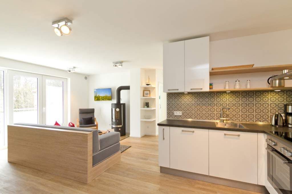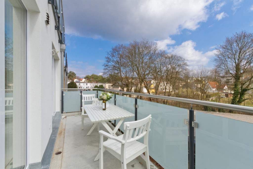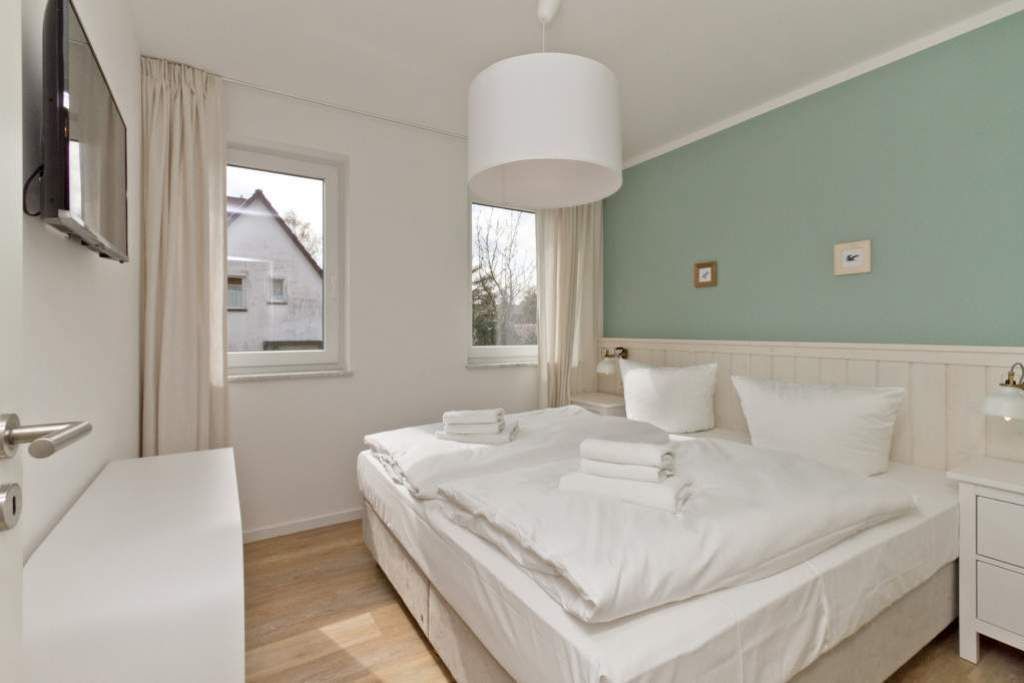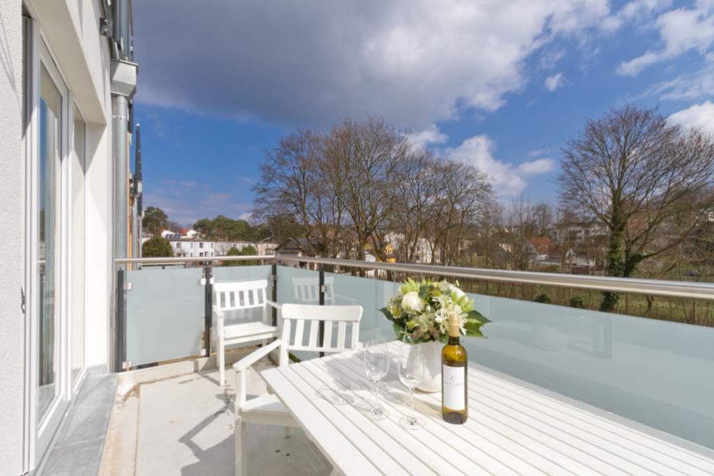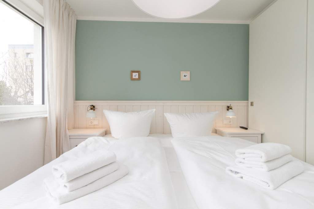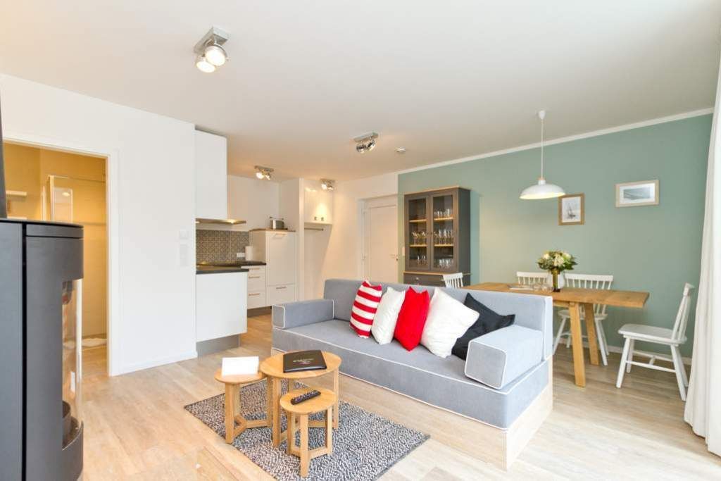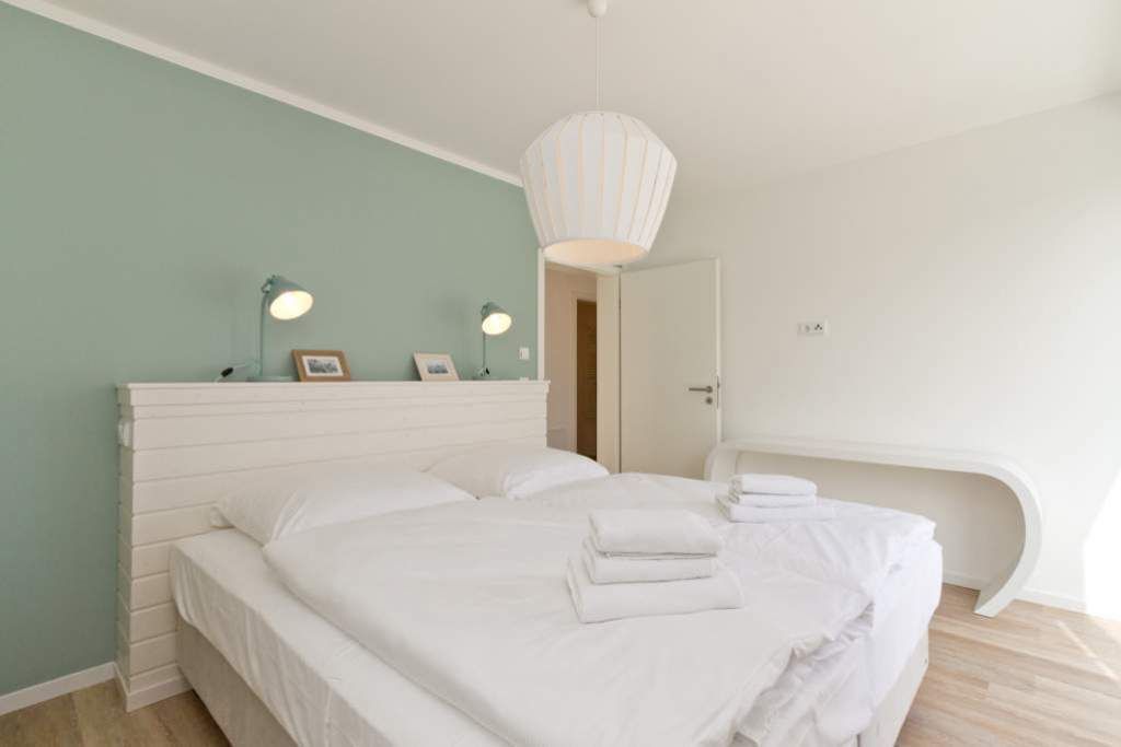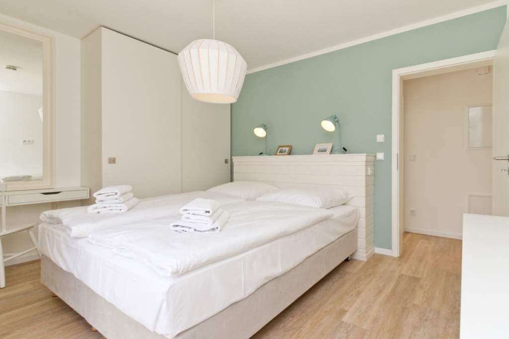Ein schönes, großes und helles Wohn-Esszimmer ist das Zentrum dieser traumhaften Ferienwohnung im 2. Stock der Villa Bettina in Heringsdorf. Viel Weiß, ein Mint-Pastell an den Wänden und nordische Design-Möbel verleihen den 54 Quadratmetern Charme und Noblesse. Ein großer Holzesstisch ist der ideale Platz für gemeinsame Stunden. Ebenso die gemütliche Couch, von der aus Sie einen wunderbaren Blick auf das Flammenspiel im Kaminofen, den Flat-TV oder den Balkon haben. Lassen Sie sich schon beim Frühstück von der Morgensonne verwöhnen, die hier auf der Sonneninsel Usedom fast jeden Morgen zu einem sonnigen Start verhilft. Die offene Küche ist mit hochwertigen Gerätschaften und edlem Geschirr ausgestattet. Und schick ist die ausgesuchte Fliesenoptik obendrein. Wer sich im Urlaub himmlisch betten möchte, bekommt in diesem Feriendomizil in zwei schönen Schlafzimmern die Gelegenheit dazu. In den beiden Zimmern befinden sich je ein bequemes Boxspringdoppelbett (1,80 m x 2,00 m). Geräumige Schränke bieten viel Stauraum. Ein Schlafzimmer ist zudem mit einem Flat-TV ausgestattet. Dafür hat das andere Schlafzimmer einen Zugang zum Balkon. Das Duschen wird unter der ebenerdigen Regendusche im Badezimmer zum echten Genuss. Ein Waschtisch und ein WC gehören ebenfalls zur Ausstattung. Platz bietet das Appartement vier Personen und einem Kleinkind (im Kinderreisebett). Handtücher liegen bei Ankunft bereit. Außerdem sind die Betten bezogen. Die WLAN-Nutzung ist kostenfrei möglich. Für Ihr Auto steht am Haus ein Stellplatz zur Verfügung.