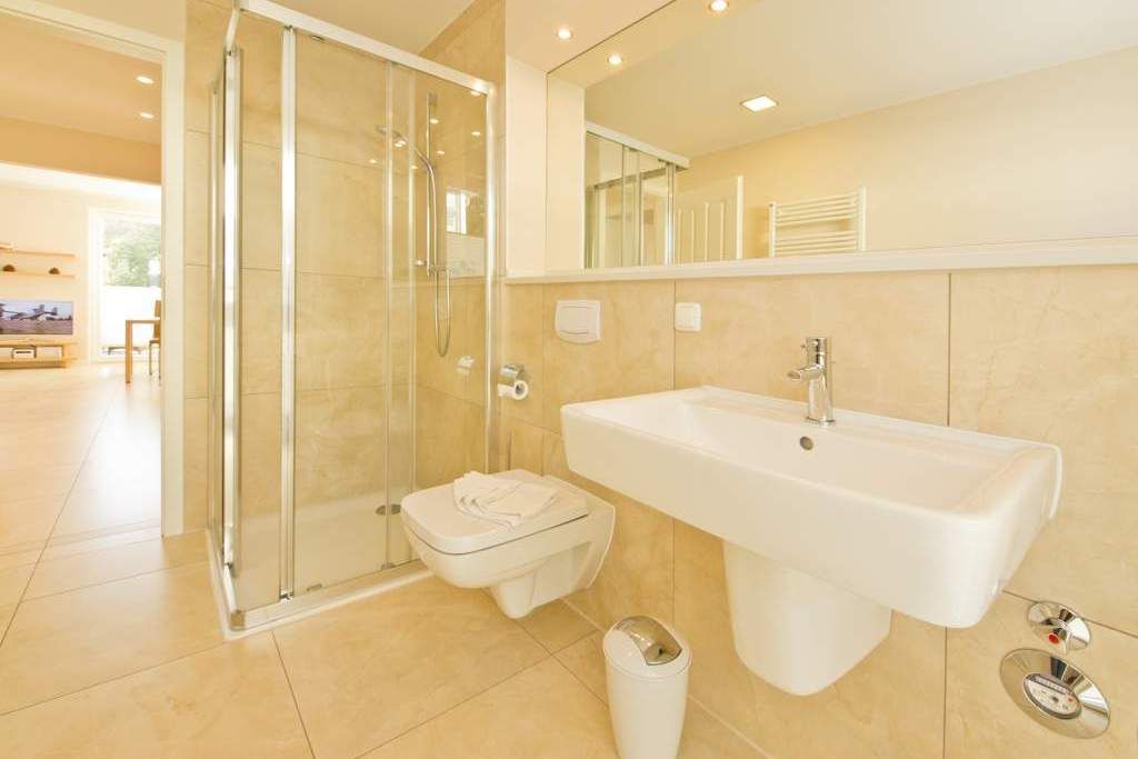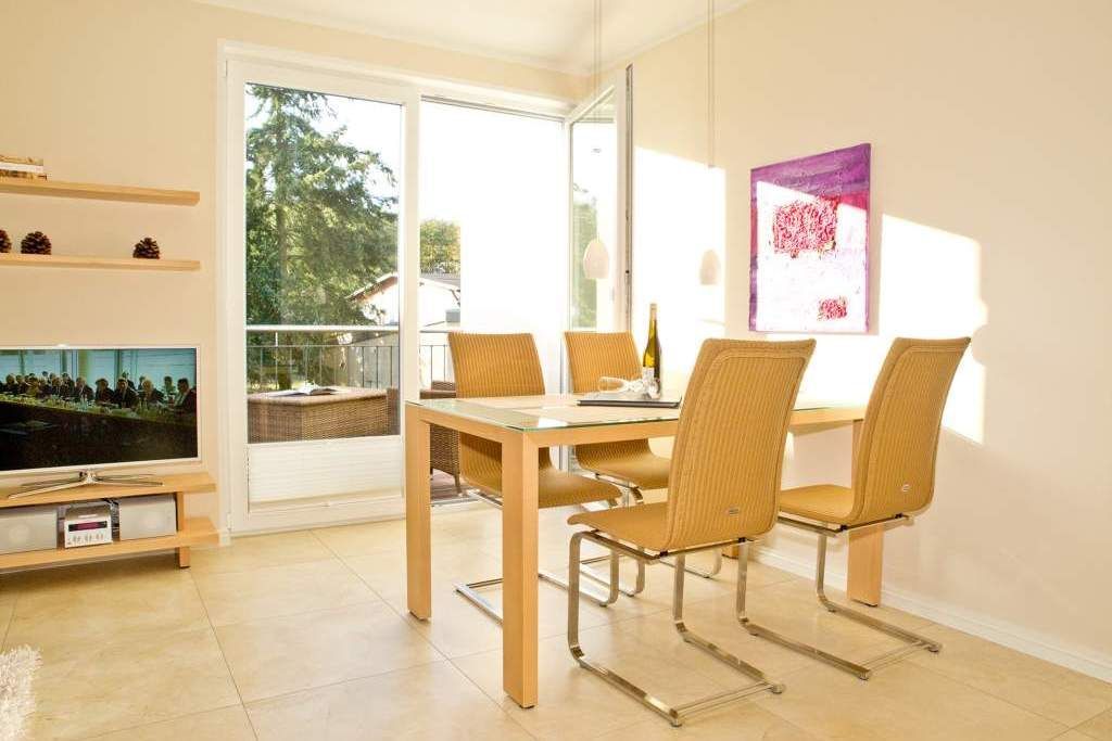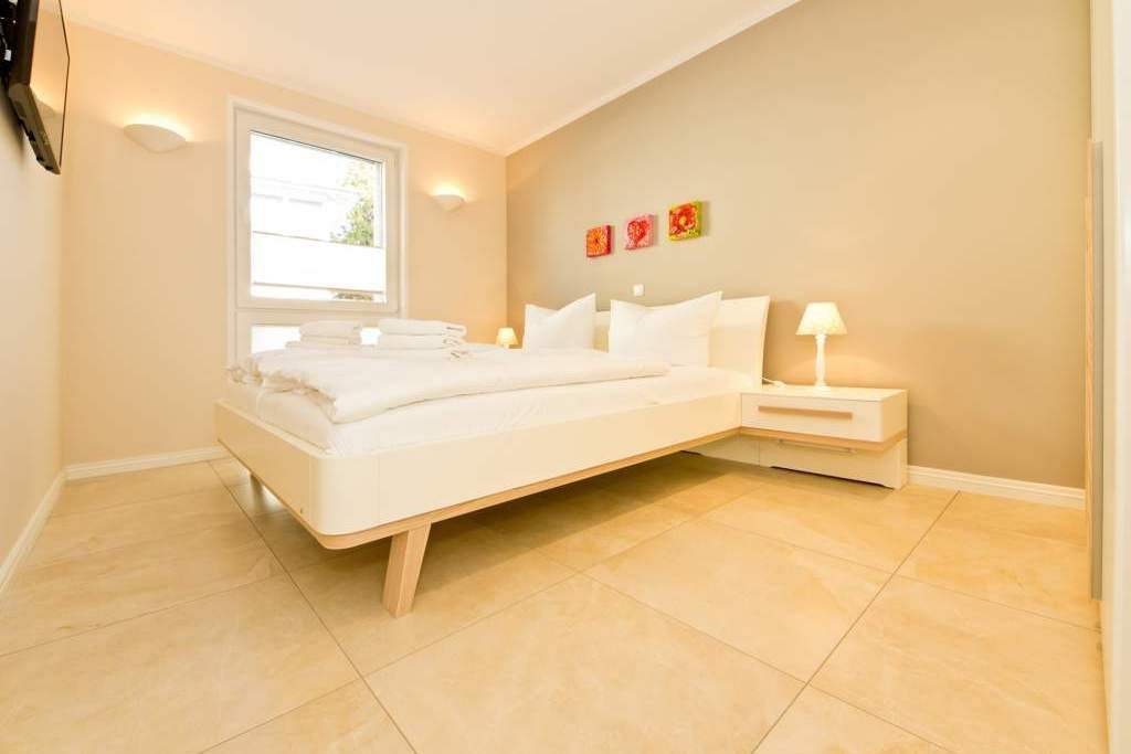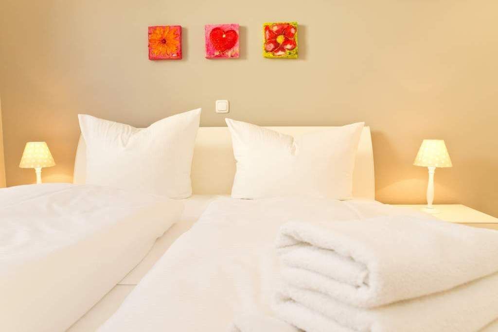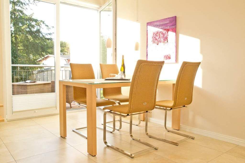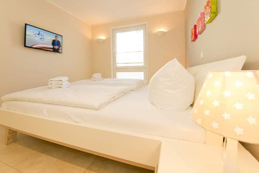 Modern. Lichtdurchflutet. Stilsicher, so empfängt Sie die Ferienwohnung 6 im 1. Obergeschoss des neuen Hauses (50 qm für 2 Personen). Warme, an Strand und Meer erinnernde Farben, ausgesuchte Materialien und stilvolle Dekorationen, verleihen dem komplett gefliesten Appartement Finesse und Leichtigkeit. Der Wohnbereich ist mit einer bequemen Ledercouch und technischen Feinheiten (Flat-TV, Minianlage, DVD) ausgestattet, von hier hat man auch den Zugang zum Südbalkon. Eine offene, komplett ausgestattete Küche, ein wertiges und gemütliches Schlafzimmer mit Doppelbett und Flat-TV sowie ein großzügiges Duschbad mit Fenster ergänzen die Wohnung und bieten Platz für zwei Personen. Für Fahrrad-Freunde ist ein abschließbarer und zur Wohnung gehörender Abstellraum vorhanden. Ein kostenfreier Parkplatz befindet sich auf dem angrenzenden Grundstück. Das WLAN-Netz ist kostenfrei nutzbar.