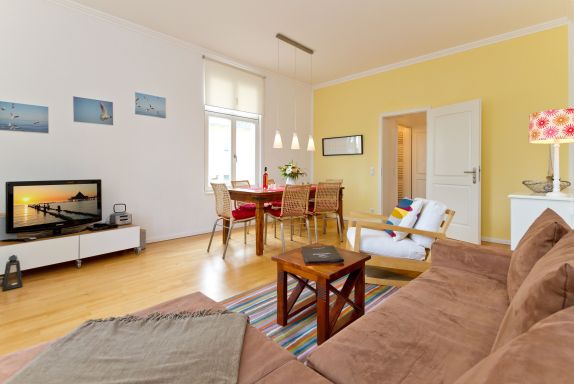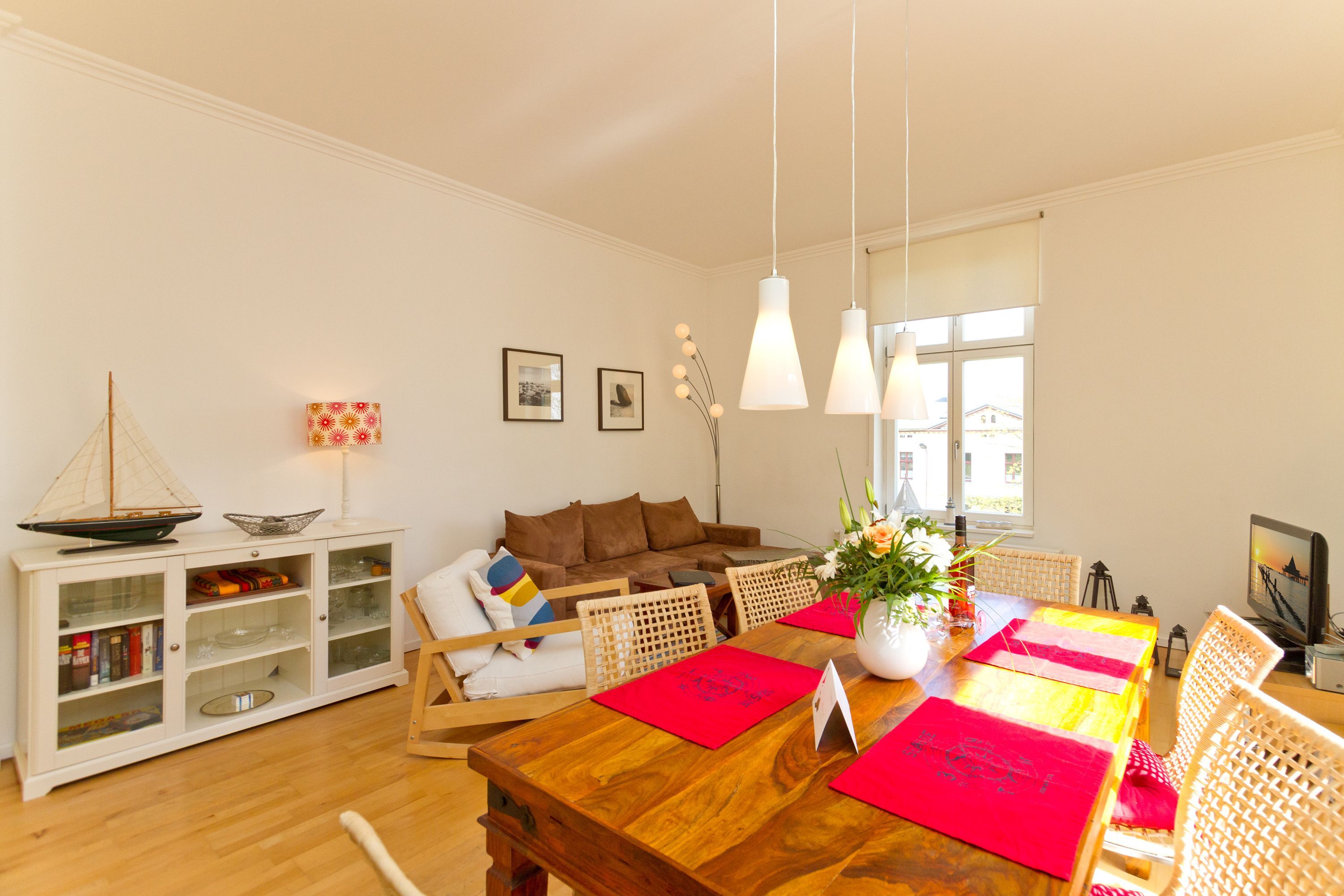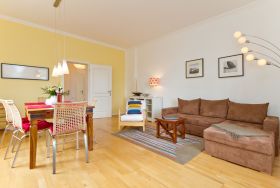 Diese geschmackvoll gestaltete 2-Raum-Ferienwohnung ist für 2 Personen und ein Kleinkind eingerichtet und befindet sich im Erdgeschoss der Villa. Die stilvolle, moderne Möblierung und die ausgesuchten Dekorationen sorgen für einen schönen Urlaub. Der Wohnbereich mit Sitzgruppe wird durch den Essplatz ergänzt. Die separate Küche ist komplett ausgestattet und bietet Zugang zum kleinen Südbalkon. Das Schlafzimmer ist mit einem Doppelbett eingerichtet. Ein schönes Bad mit WC und Dusche komplettiert das Appartement. Auf Wunsch stellen wir für unsere kleinen Gäste ein Kinderreisebett (ohne zusätzliche Matratze & Bettzeug, gegen einen Aufpreis) und einen Kinderhochstuhl ( kostenfrei) zur Verfügung.
