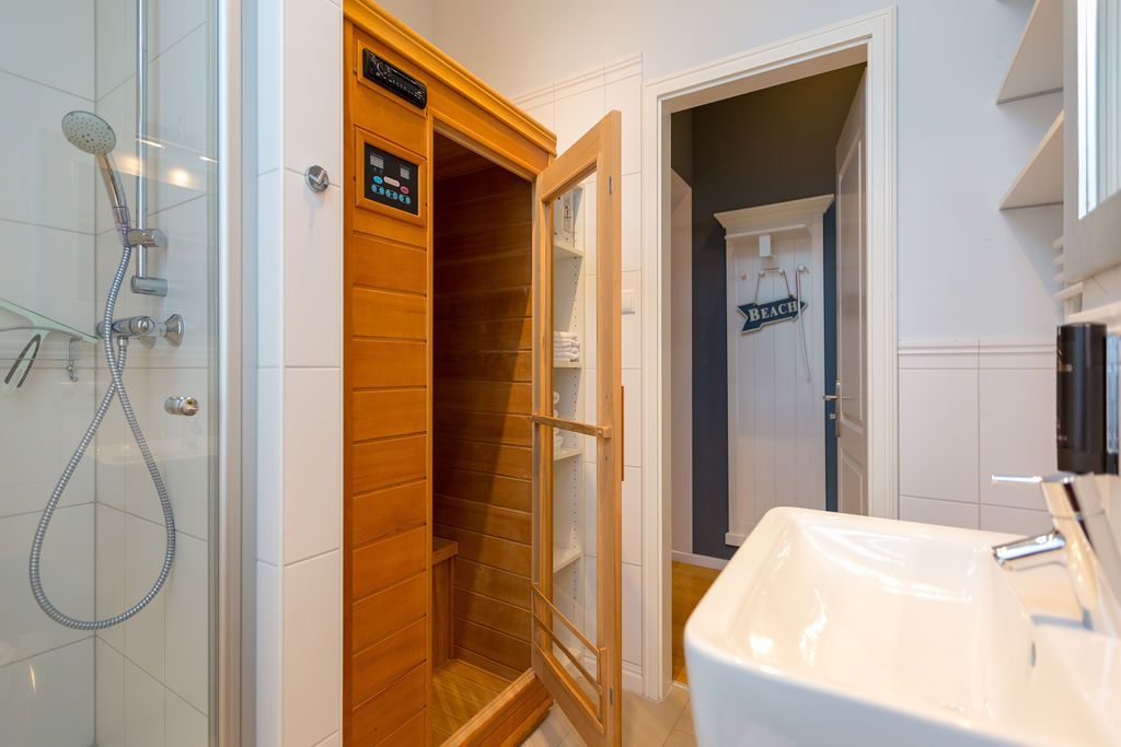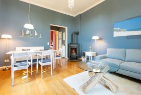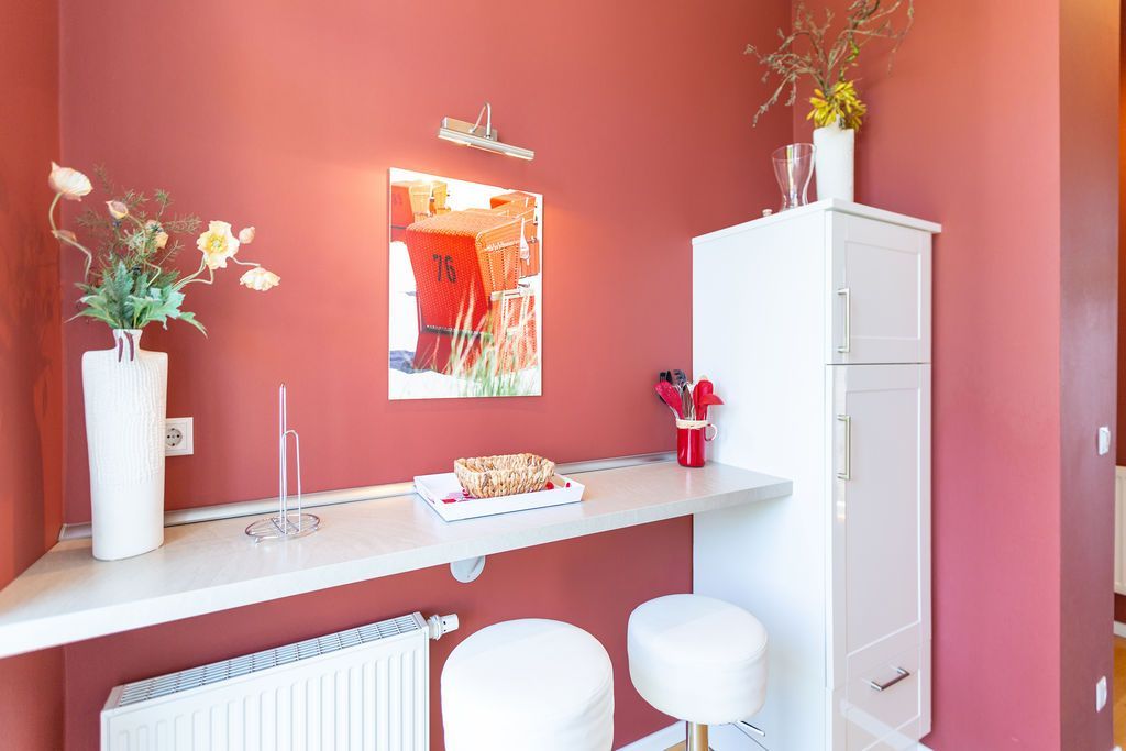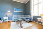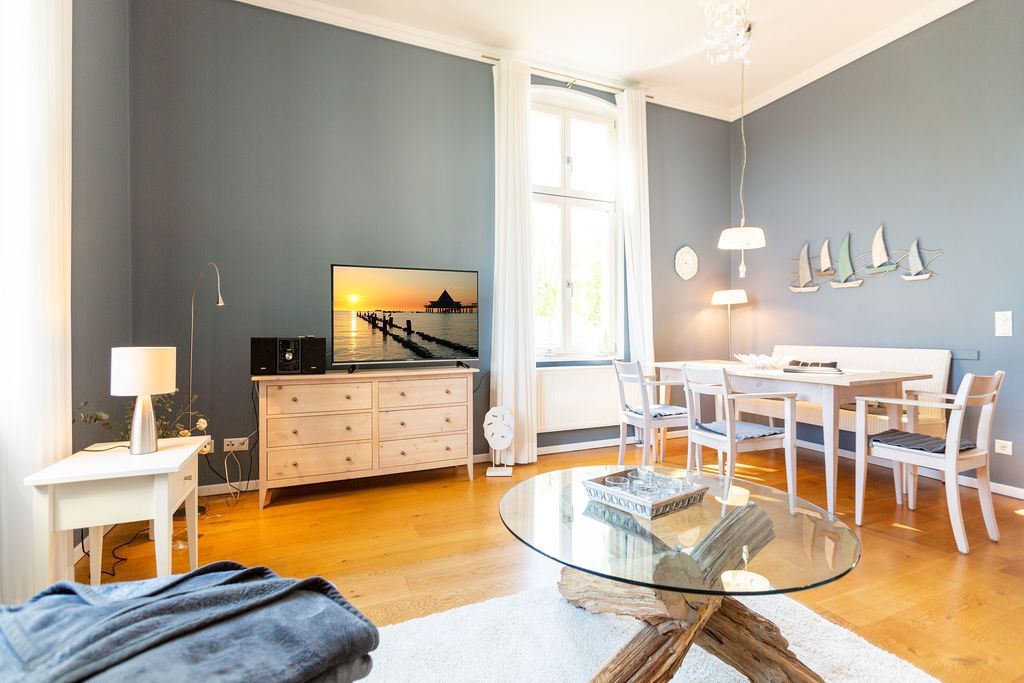 Sie öffnen die Tür und sind sofort beeindruckt: hohe Räume mit gekonnter Farbgestaltung, wunderschöne Details und viel Geschmack. Dazu stilvolle, aber gemütliche Möbel. Die Ferienwohnung 6 im 1.Obergeschoss des Hauses wird sicher auch zu Ihrem Liebling. Der Wohnbereich mit bequemer Couch, Flat-TV, DVD und Essplatz, das Schlafzimmer mit Boxspringdoppelbett und die komplett ausgestattete Küche bieten 2 Personen Platz zum Wohlfühlen. Auf dem Südbalkon genießen Sie die Usedomer Sonne. Und an kalten Tagen wird es durch den knisternden Kaminofen oder in der Infrarotsauna (gegen Gebühr) so richtig warm und kuschelig. Für Ihren Komfort sind die Betten bei der Anreise bezogen und Handtücher liegen bereit (Erstausstattung).