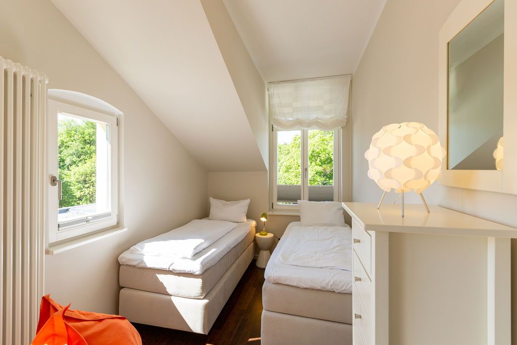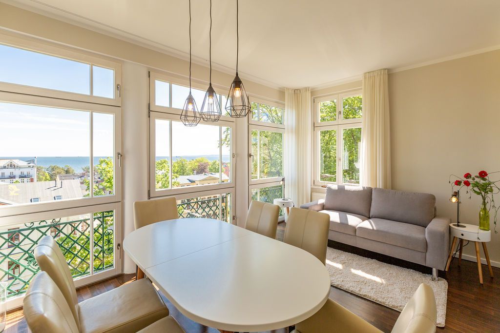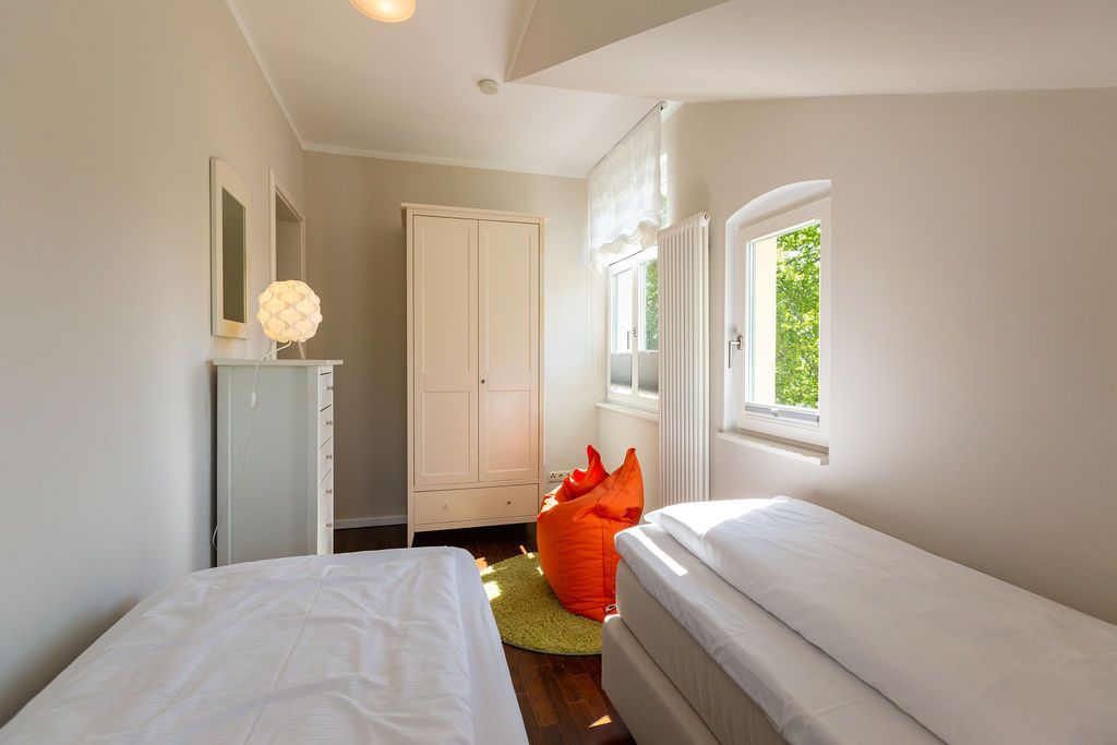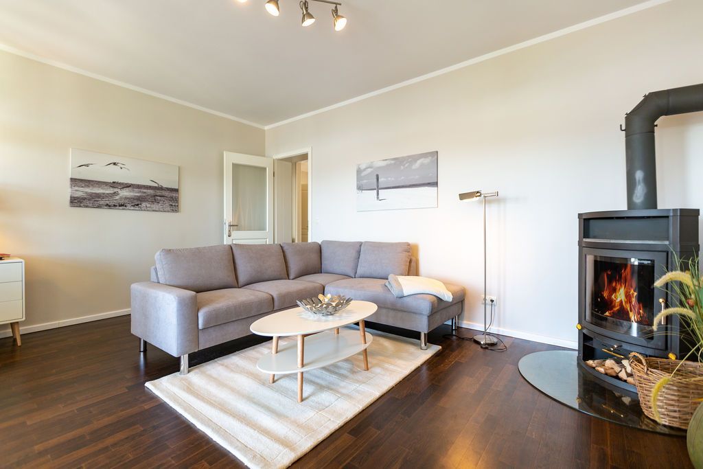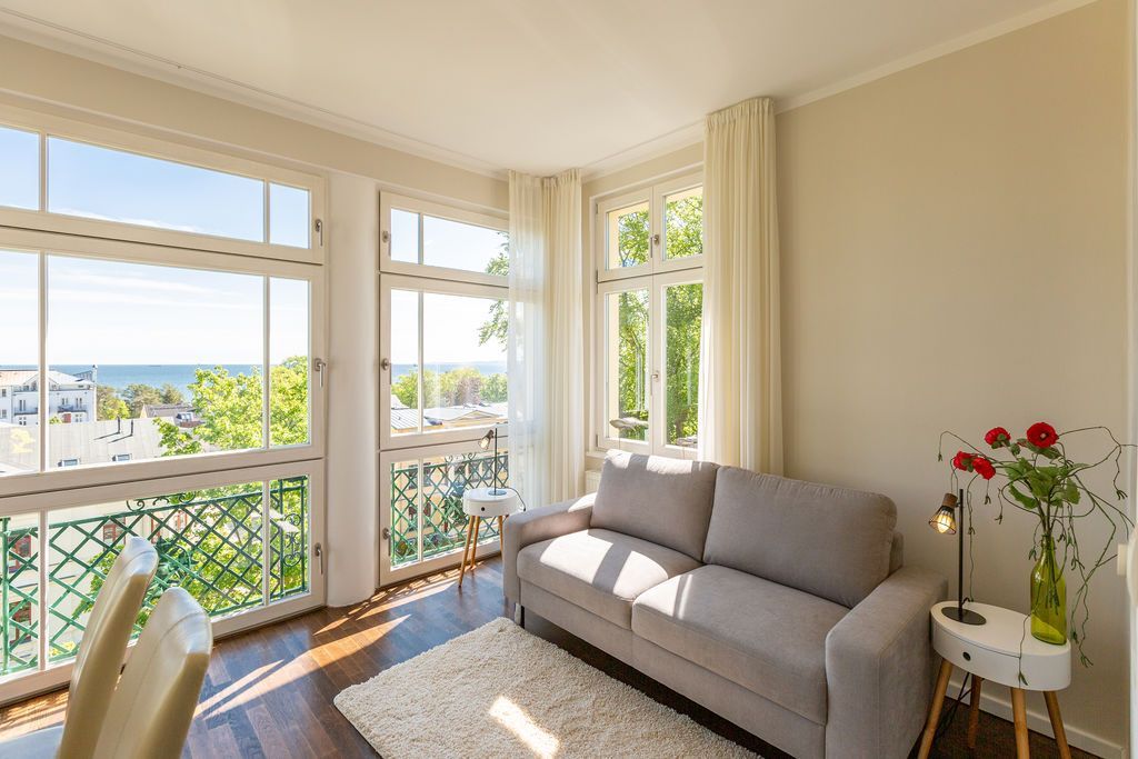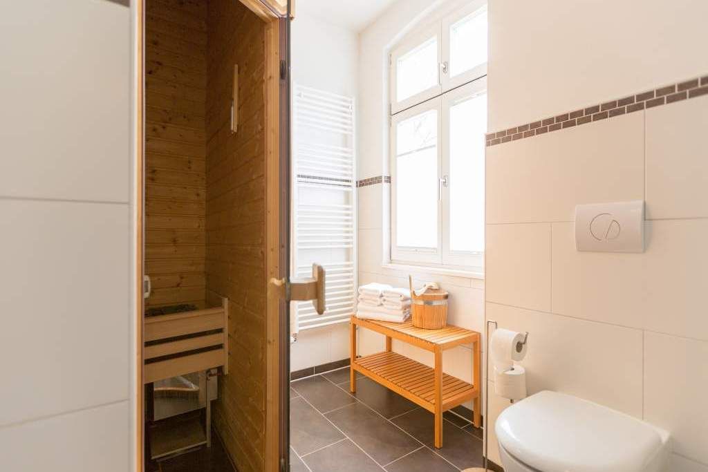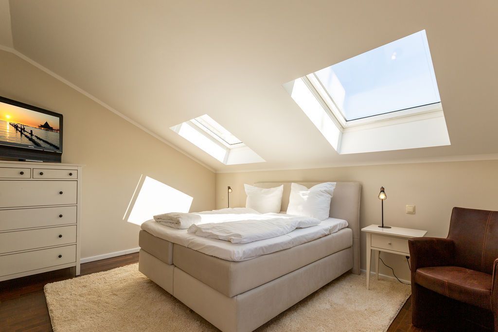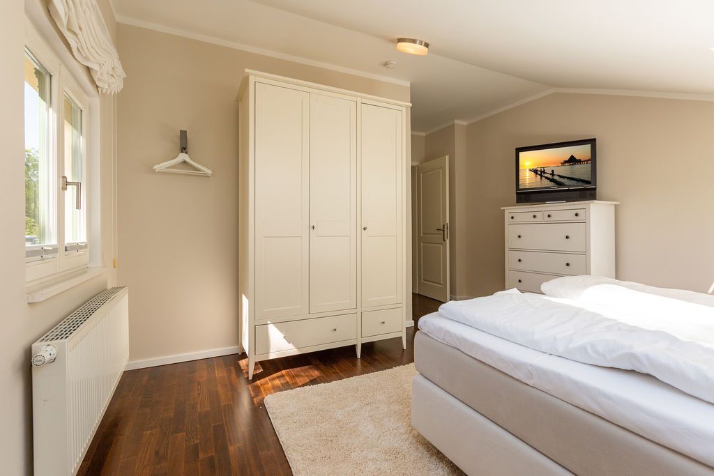 Großzügig, hochwertig und sehr detailverliebt gestaltet, erwartet Sie eine zauberhafte Wohlfühl-Wohnwelt für 4 Personen und ein Kleinkind im Reisebett. Willkommen in Charlottes Höh Nr. 8! Hier finden Sie auf opulenten 105 qm viel Raum zum Verwirklichen Ihrer Urlaubsträume. Und den fantastischen Meerblick gibt´s quasi dazu. Denn den genießen Sie in der großzügigen, verglasten Loggia am besten bei einem Glas Wein auf der Couch oder beim Frühstück am Esstisch. Im Wohnbereich machen Sie es sich auf der bequemen Couchecke gemütlich. Im heimeligen Schlafzimmer mit Boxspringdoppelbett unter der Dachschräge findet bequem auch ein zusätzliches Kinderreisebett Platz. Das zweite Schlafzimmer mit getrennten Betten ist für Kinder und Erwachsene geeignet. Die separate Küche mit Zugang zum sonnigen Südbalkon ist mit allem Komfort ausgestattet. An kalten Tagen wird es durch den knisternden Kaminofen oder in der wohnungseigenen Sauna so richtig warm und kuschelig. Ergänzt wird die Wohnung durch ein modernes Bad mit Dusche, WC und Sauna. Auf Wunsch stellen wir für unsere kleinen Gäste ein Kinderreisebett (ohne zusätzliche Matratze & Bettzeug) und einen Kinderhochstuhl ( gegen einen Aufpreis) zur Verfügung. Für Ihren Komfort sind die Betten bei der Anreise bezogen und Handtücher liegen bereit (Erstausstattung).