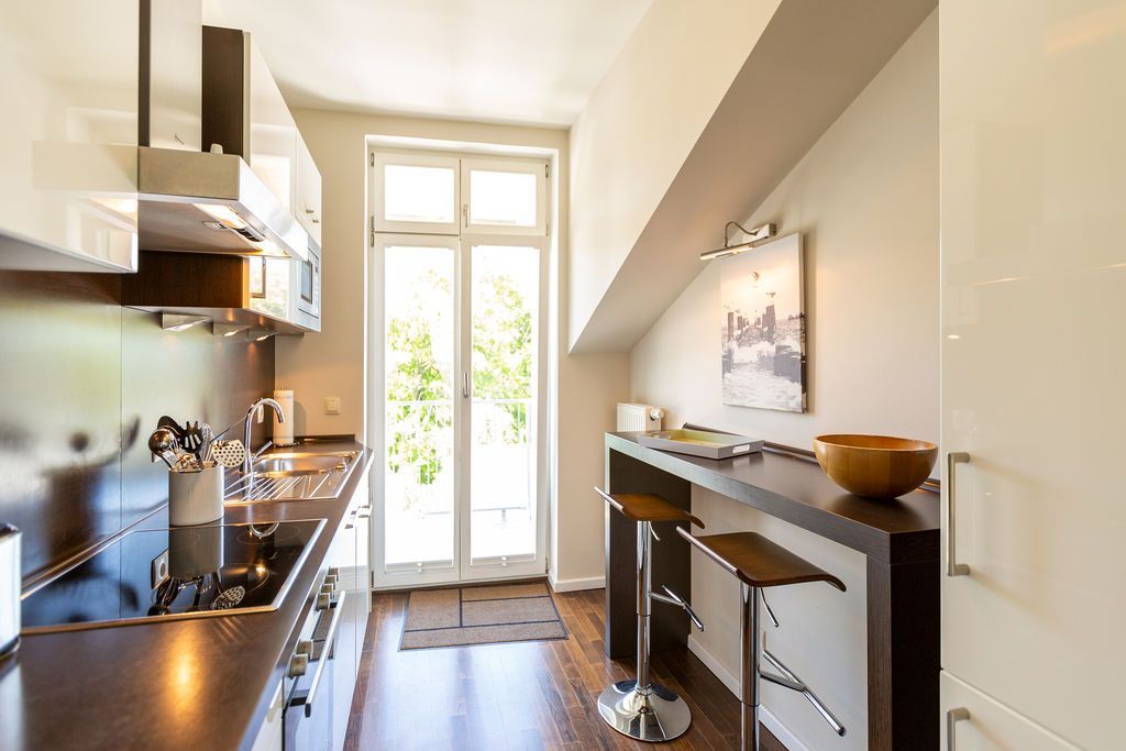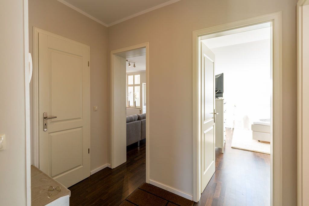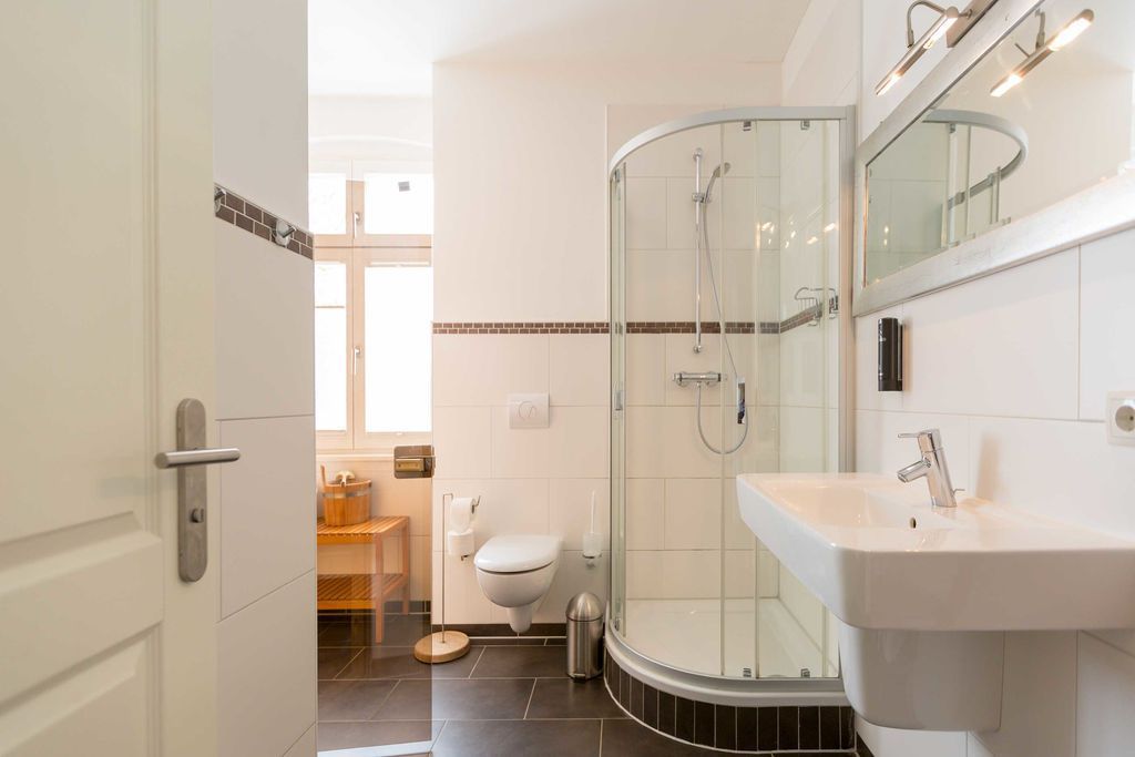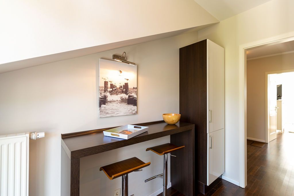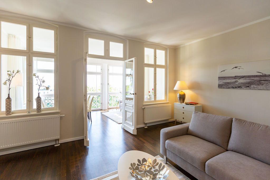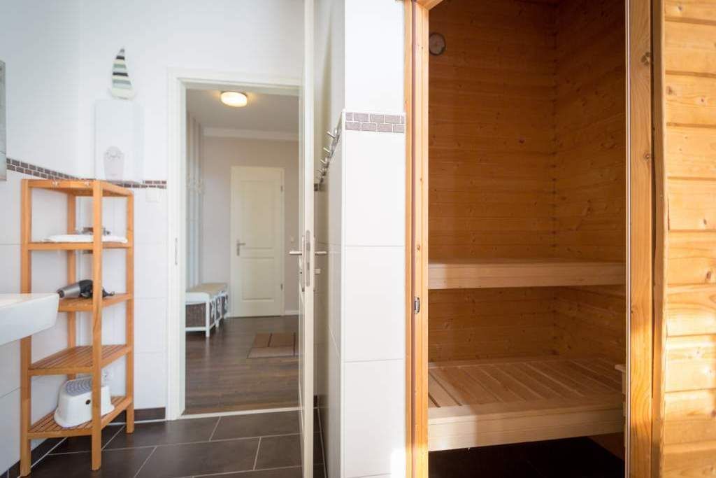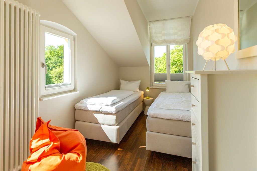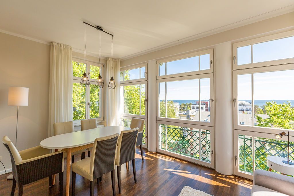 Großzügig, hochwertig und sehr detailverliebt gestaltet, erwartet Sie eine zauberhafte Wohlfühl-Wohnwelt für 4 Personen und ein Kleinkind im Reisebett. Willkommen in Charlottes Höh Nr. 8! Hier finden Sie auf opulenten 105 qm viel Raum zum Verwirklichen Ihrer Urlaubsträume. Und den fantastischen Meerblick gibt´s quasi dazu. Denn den genießen Sie in der großzügigen, verglasten Loggia am besten bei einem Glas Wein auf der Couch oder beim Frühstück am Esstisch. Im Wohnbereich machen Sie es sich auf der bequemen Couchecke gemütlich. Im heimeligen Schlafzimmer mit Boxspringdoppelbett unter der Dachschräge findet bequem auch ein zusätzliches Kinderreisebett Platz. Das zweite Schlafzimmer mit getrennten Betten ist für Kinder und Erwachsene geeignet. Die separate Küche mit Zugang zum sonnigen Südbalkon ist mit allem Komfort ausgestattet. An kalten Tagen wird es durch den knisternden Kaminofen oder in der wohnungseigenen Sauna so richtig warm und kuschelig. Ergänzt wird die Wohnung durch ein modernes Bad mit Dusche, WC und Sauna. Auf Wunsch stellen wir für unsere kleinen Gäste ein Kinderreisebett (ohne zusätzliche Matratze & Bettzeug) und einen Kinderhochstuhl ( gegen einen Aufpreis) zur Verfügung. Für Ihren Komfort sind die Betten bei der Anreise bezogen und Handtücher liegen bereit (Erstausstattung).