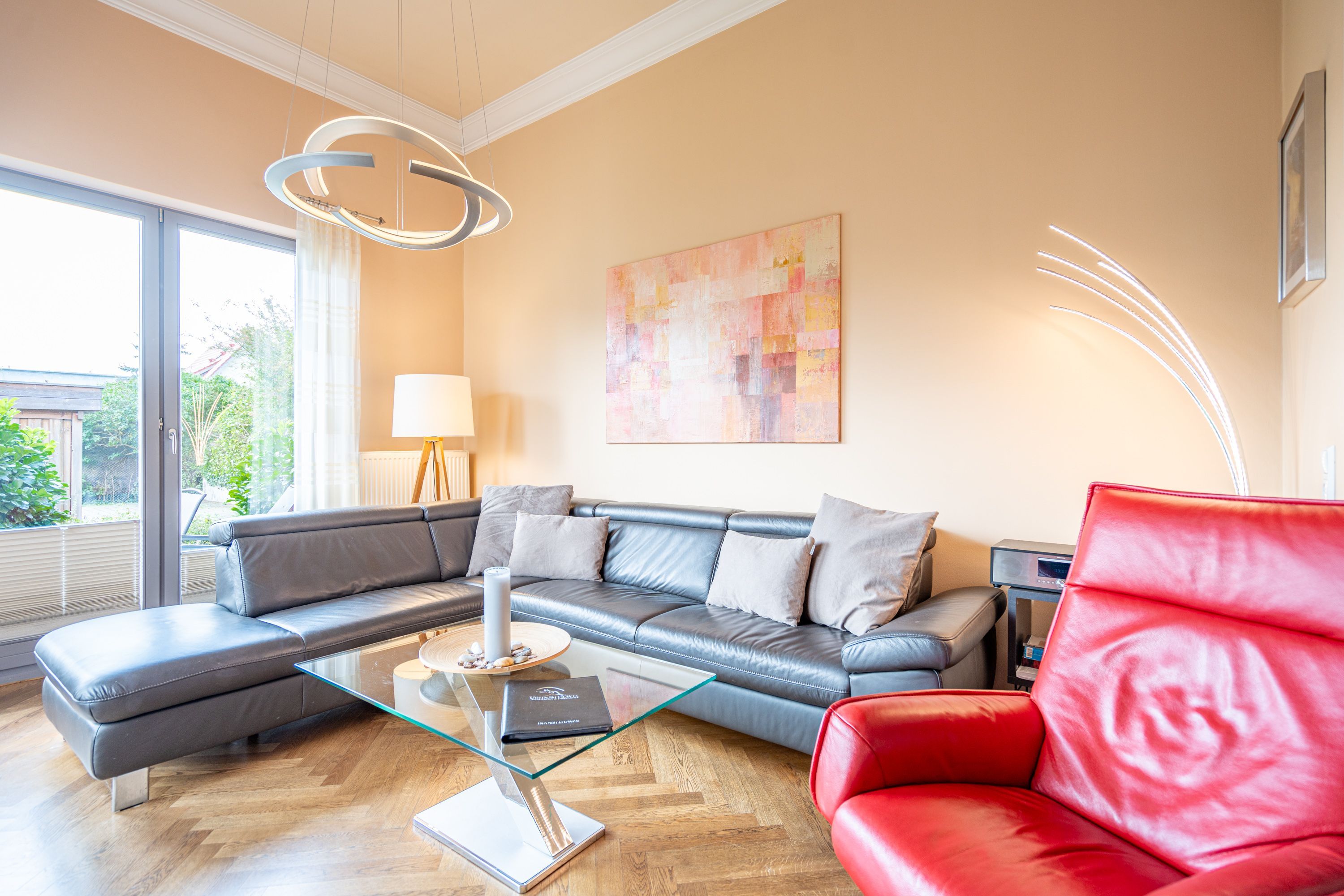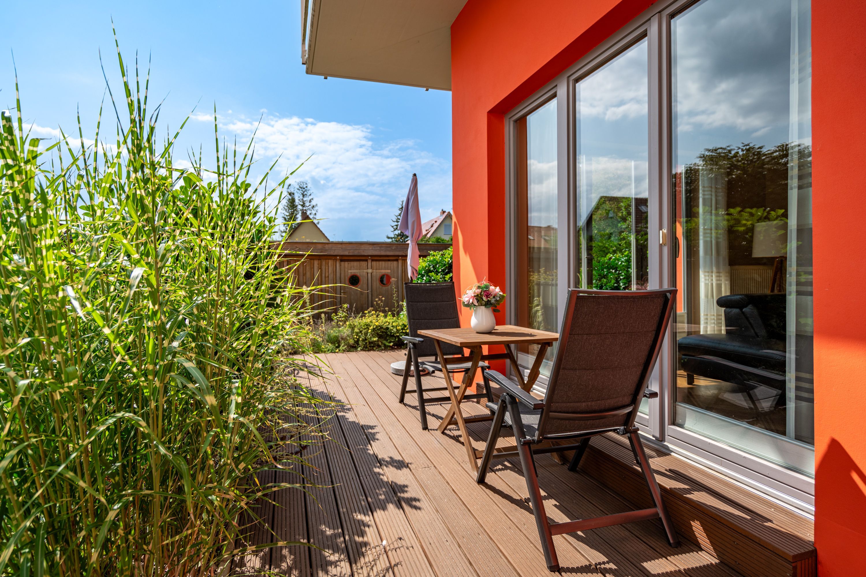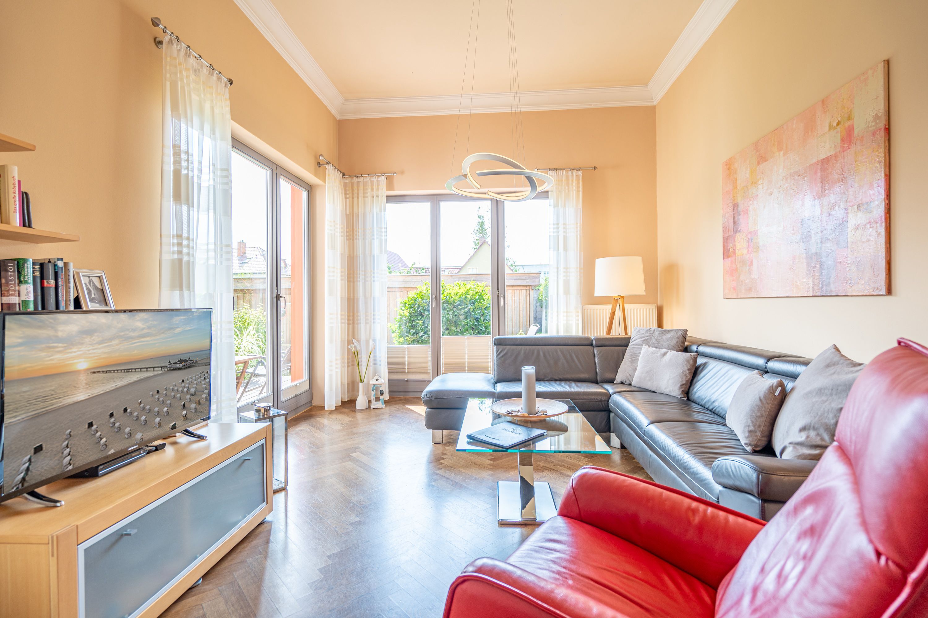 Ihre Ferienwohnung 3 (57qm), im Parterre der Villa, verwöhnt Sie mit moderner Möblierung und farblich gekonnt kombinierten Farben und Stoffen. Helle Räume, ein aufwendig sanierter Parkettboden und die geschmackvollen Dekorationen lassen keine Wünsche offen. Die offene Wohnküche, das Wohnzimmer mit großzügiger Couch, Schlafsessel und das Schlafzimmer mit Doppelbett (1,80m x 2,00m) bieten Platz für 2 bis 3 Personen & Kleinkind (bis 2 Jahre). Auf der Terrasse, die zur Südseite ausgerichtet ist, genießen Sie die Nachmittagssonne. Für kleine Gäste stellen wir gern ein Kinderreisebett und einen Hochstuhl zur Verfügung. Für Ihren Komfort sind bei Ihrer Anreise die Betten liebevoll bezogen, auch der erste Satz Handtücher liegt für Sie bereit. Ein Pkw-Stellplatz steht am Haus, unter dem Carport, zur Verfügung.